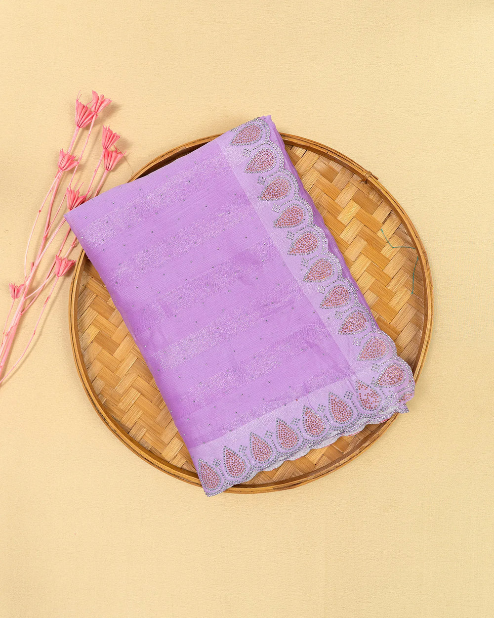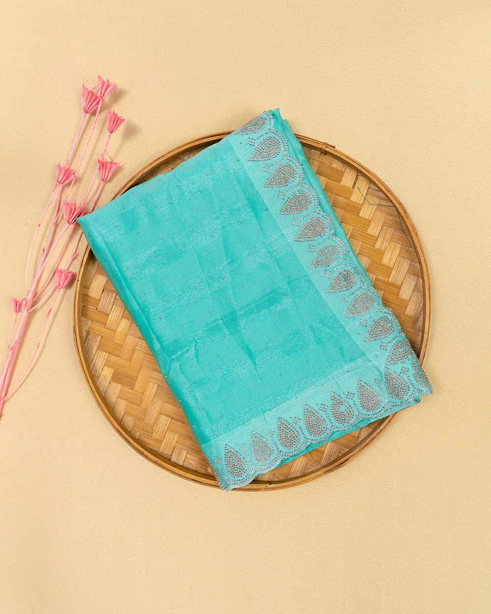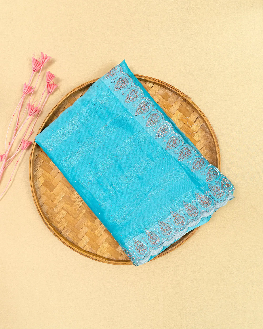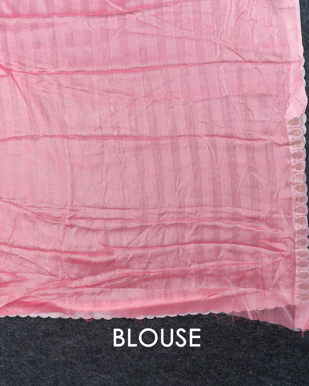 | Blouse | Running plain blouse designed to complement the saree’s sparkling stone detailing, creating a simple yet elegant finish to complete the ensemble. |