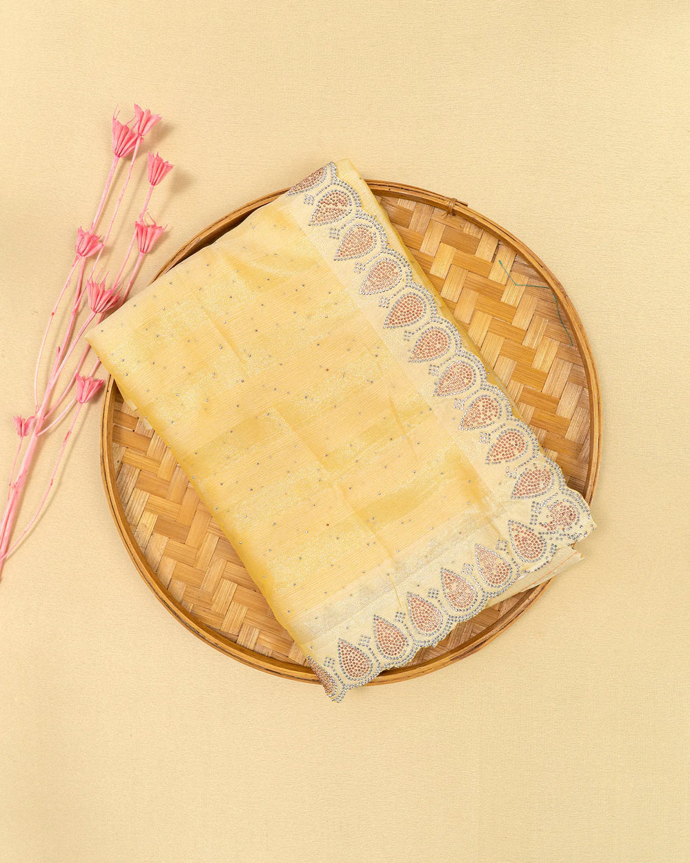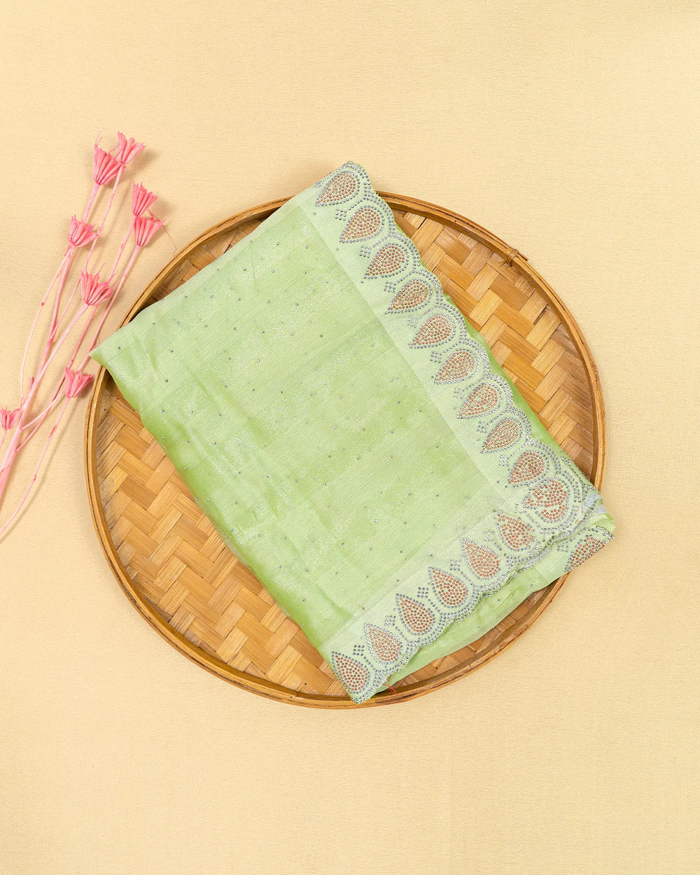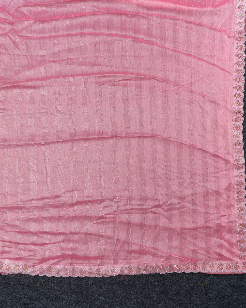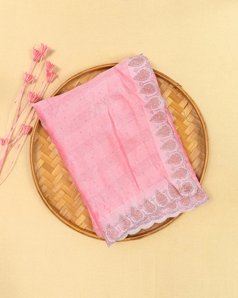 | Blouse | Running plain blouse designed to complement the saree’s sparkling stone detailing, creating a simple yet elegant finish to complete the ensemble. |