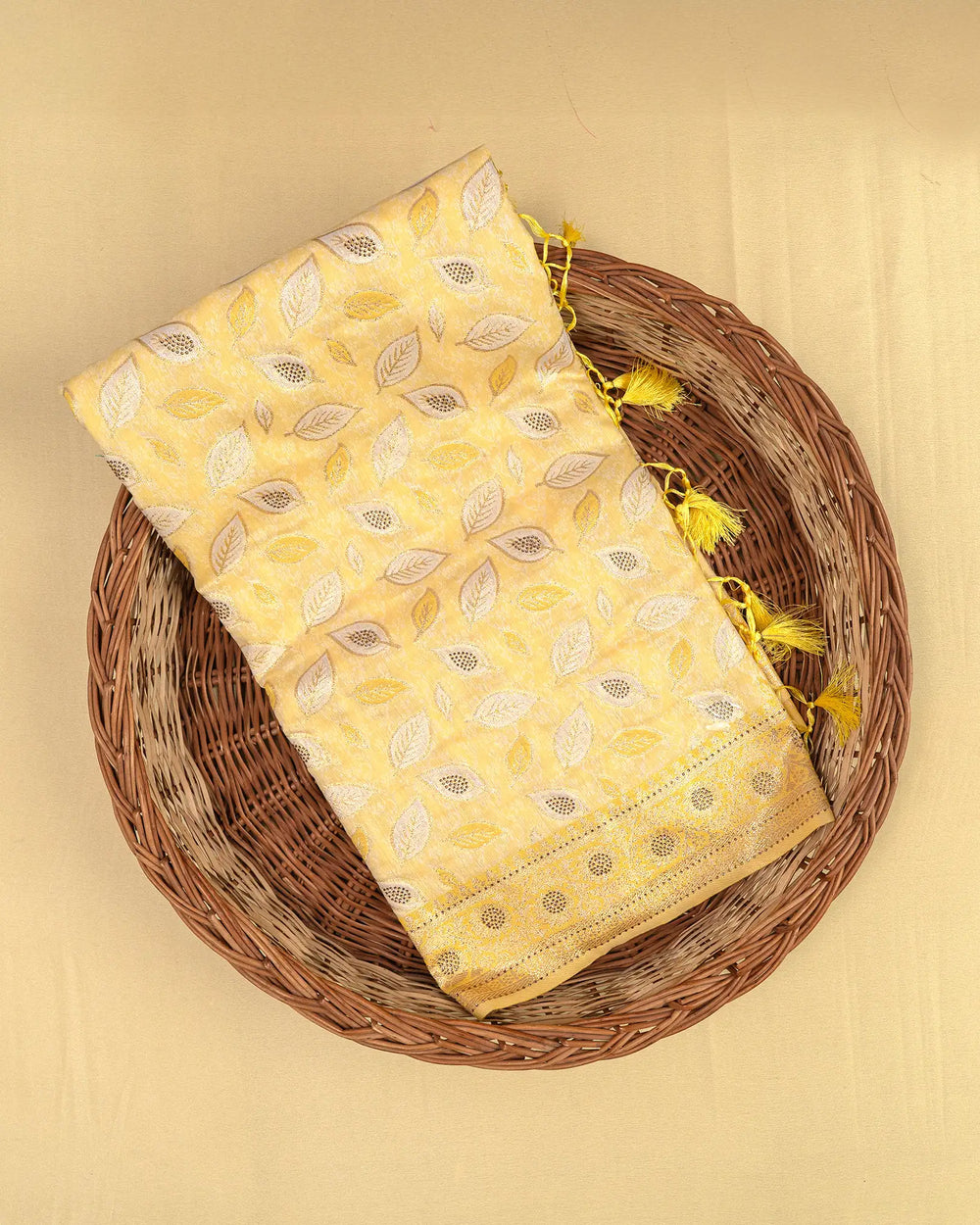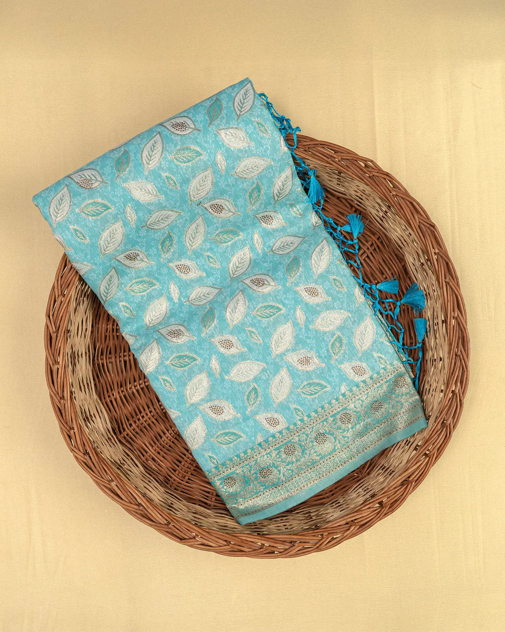 | Description | Elegant cotton brasso saree adorned with zari butta designs and copper stone embellishments, perfect for festive occasions and casual celebrations. |