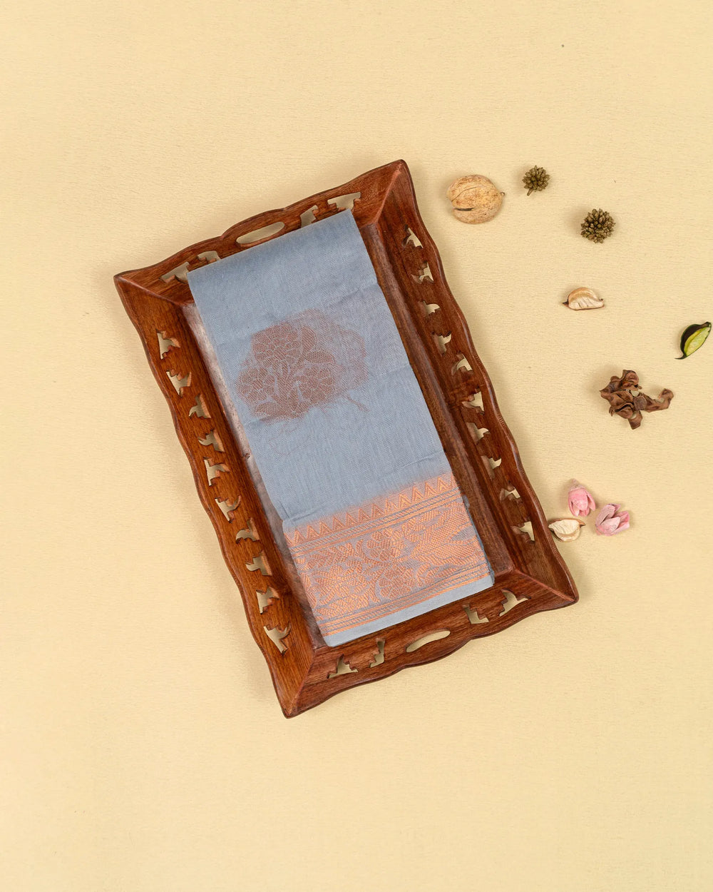 | Description | Classic cotton saree featuring intricate copper zari work, offering a refined and elegant look for everyday wear or special occasions. |