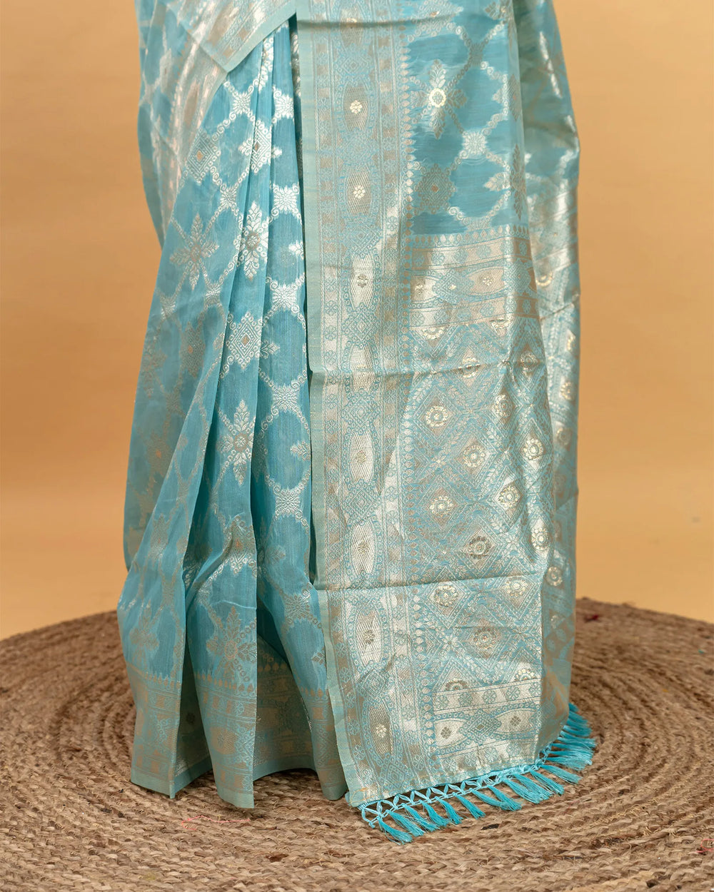 | Description | Elegant cotton saree featuring intricate weaving patterns highlighted with neem zari, blending traditional charm with subtle sophistication. |