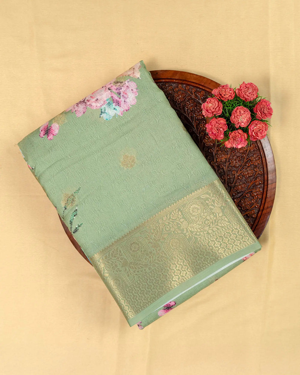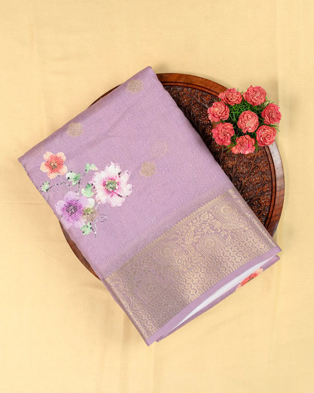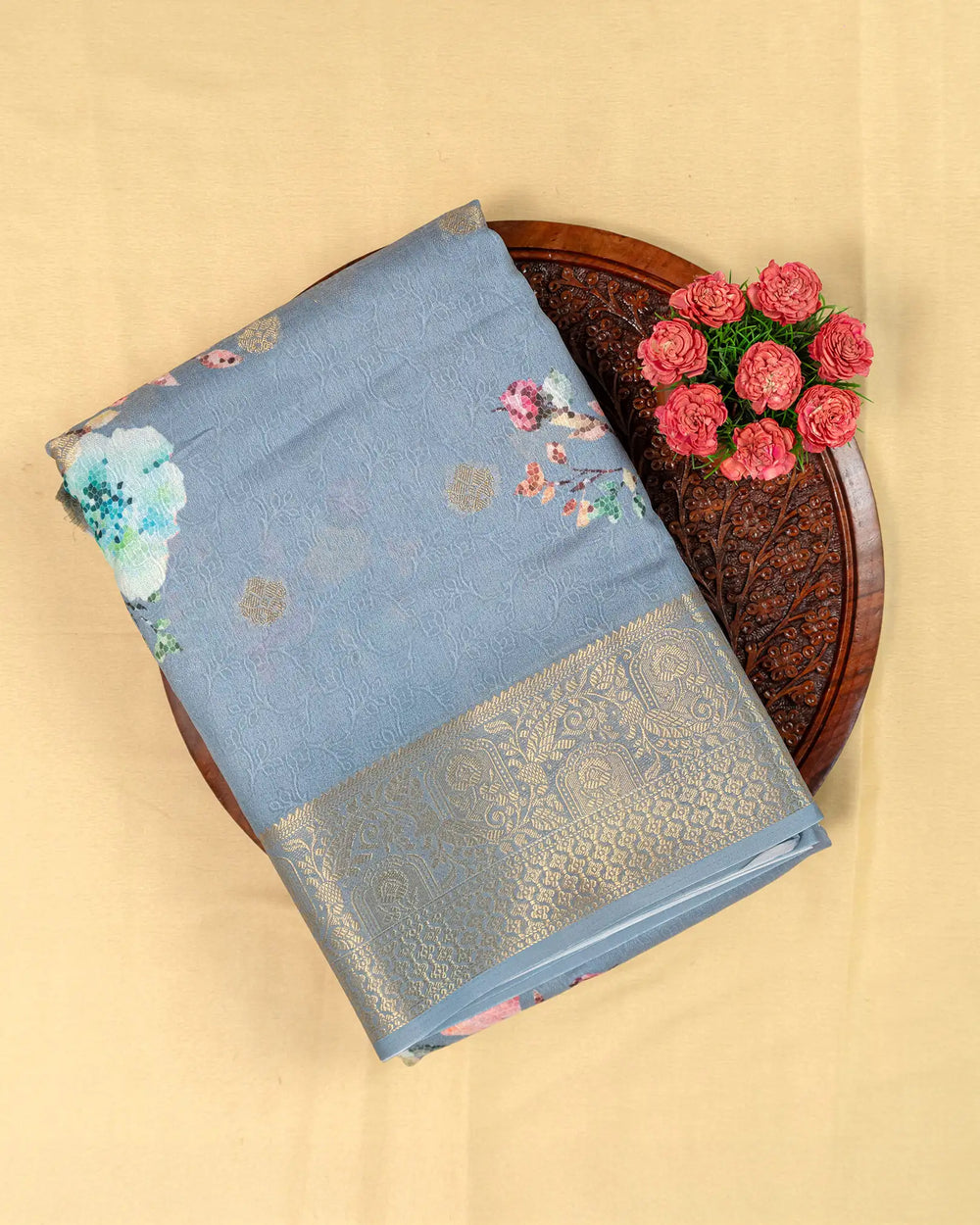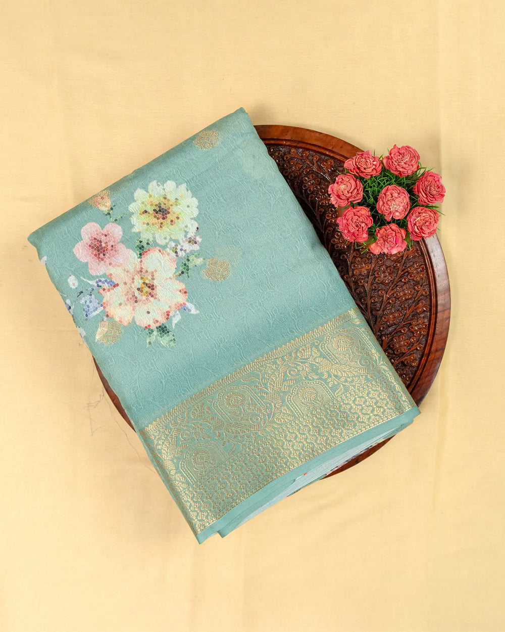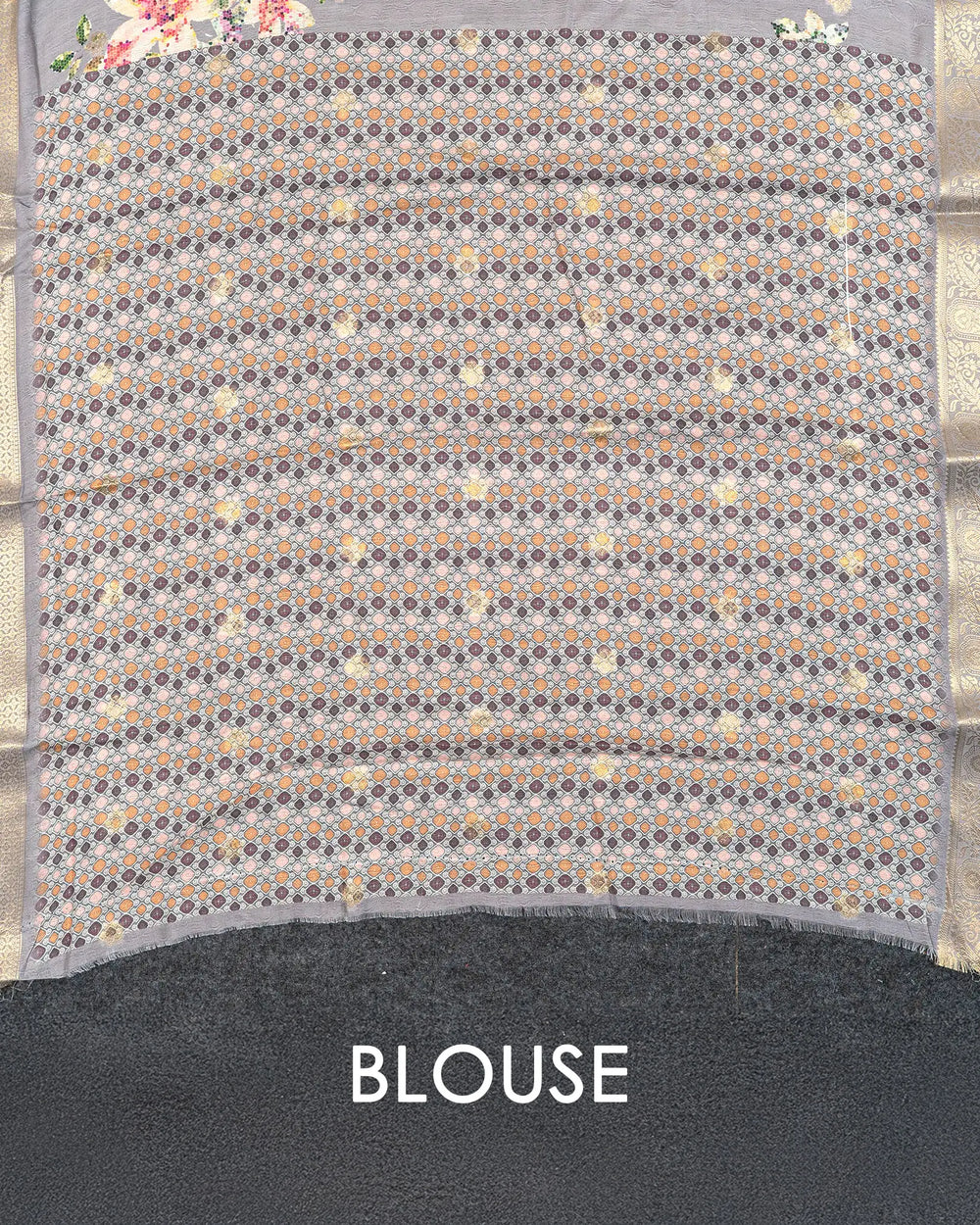 | Style | Saree highlighted with digital print and gold border, complemented with matching blouse |