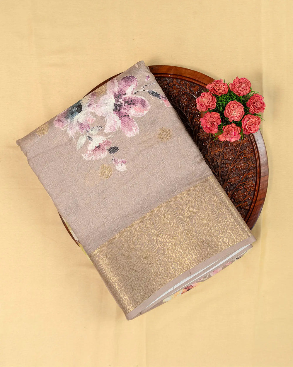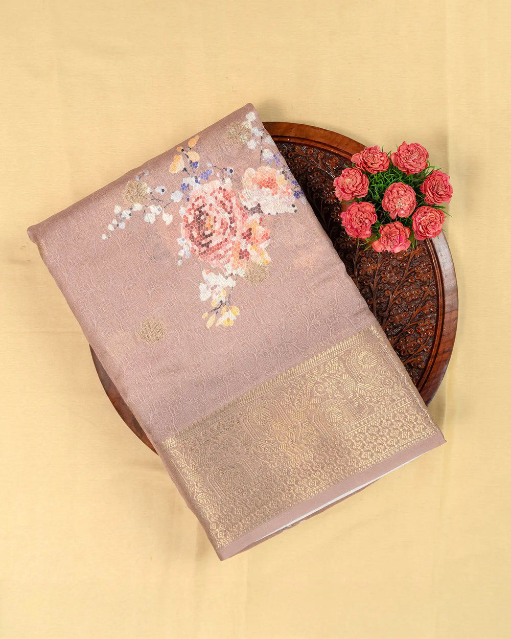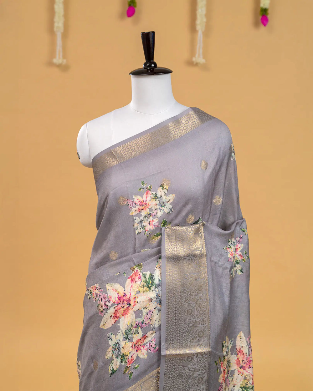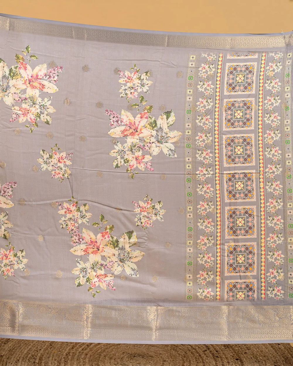 | Description | Dola saree with elegant digital print and gold border, perfect for festive and traditional occasions. |
