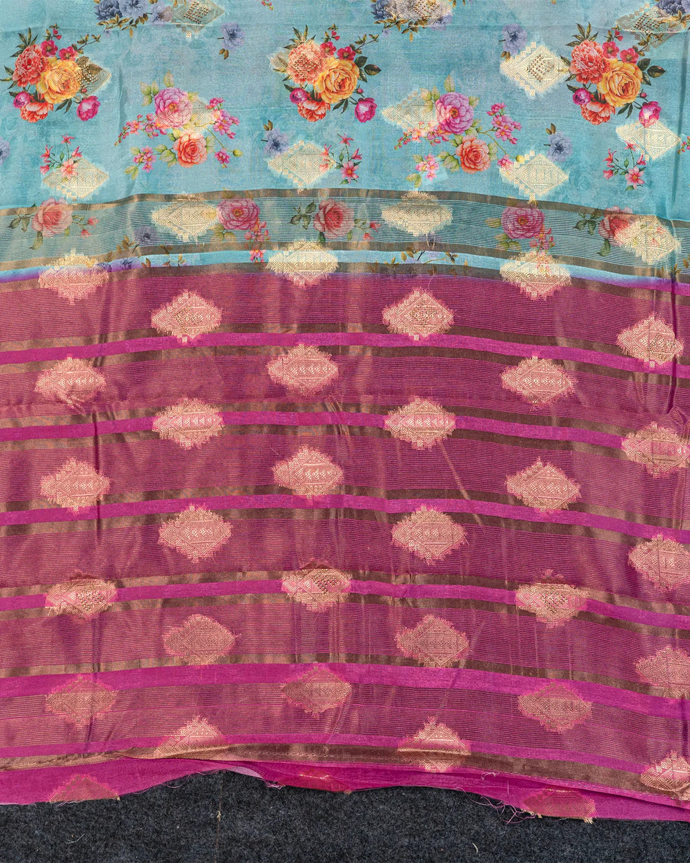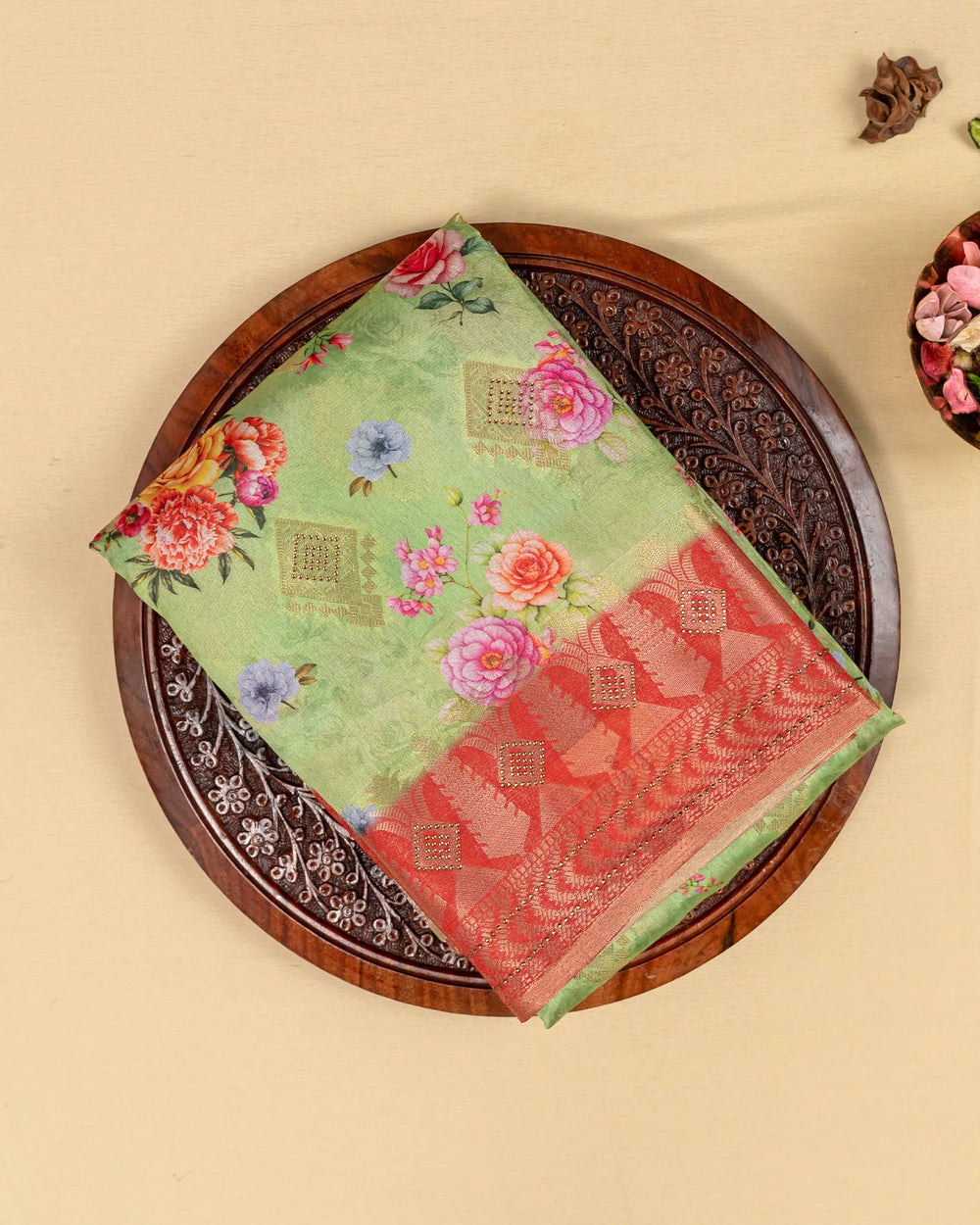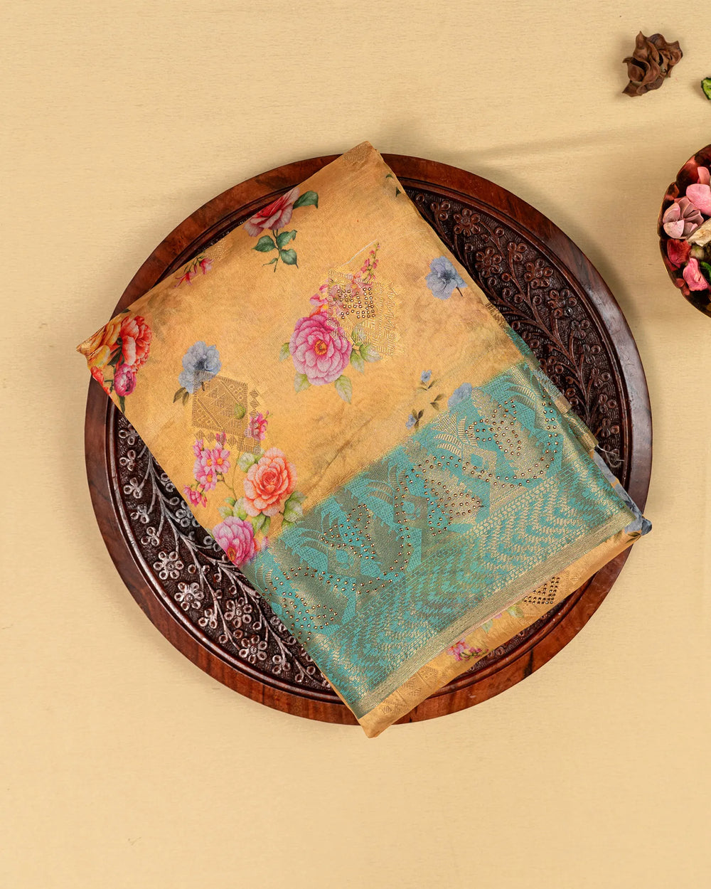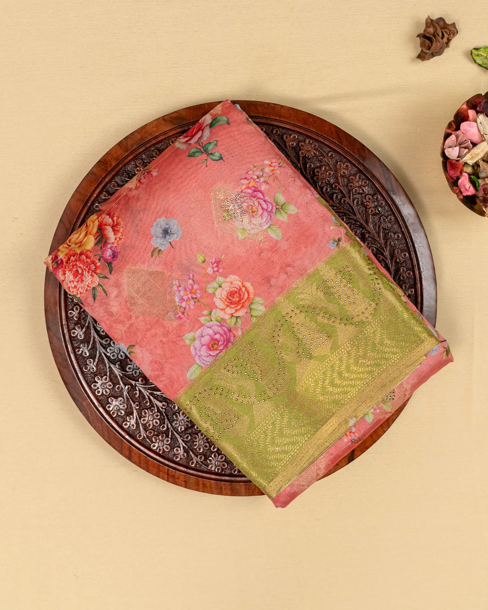 | Style | Modern digital prints combined with shimmering stone highlights add a luxurious and festive charm to the classic Dola weave |