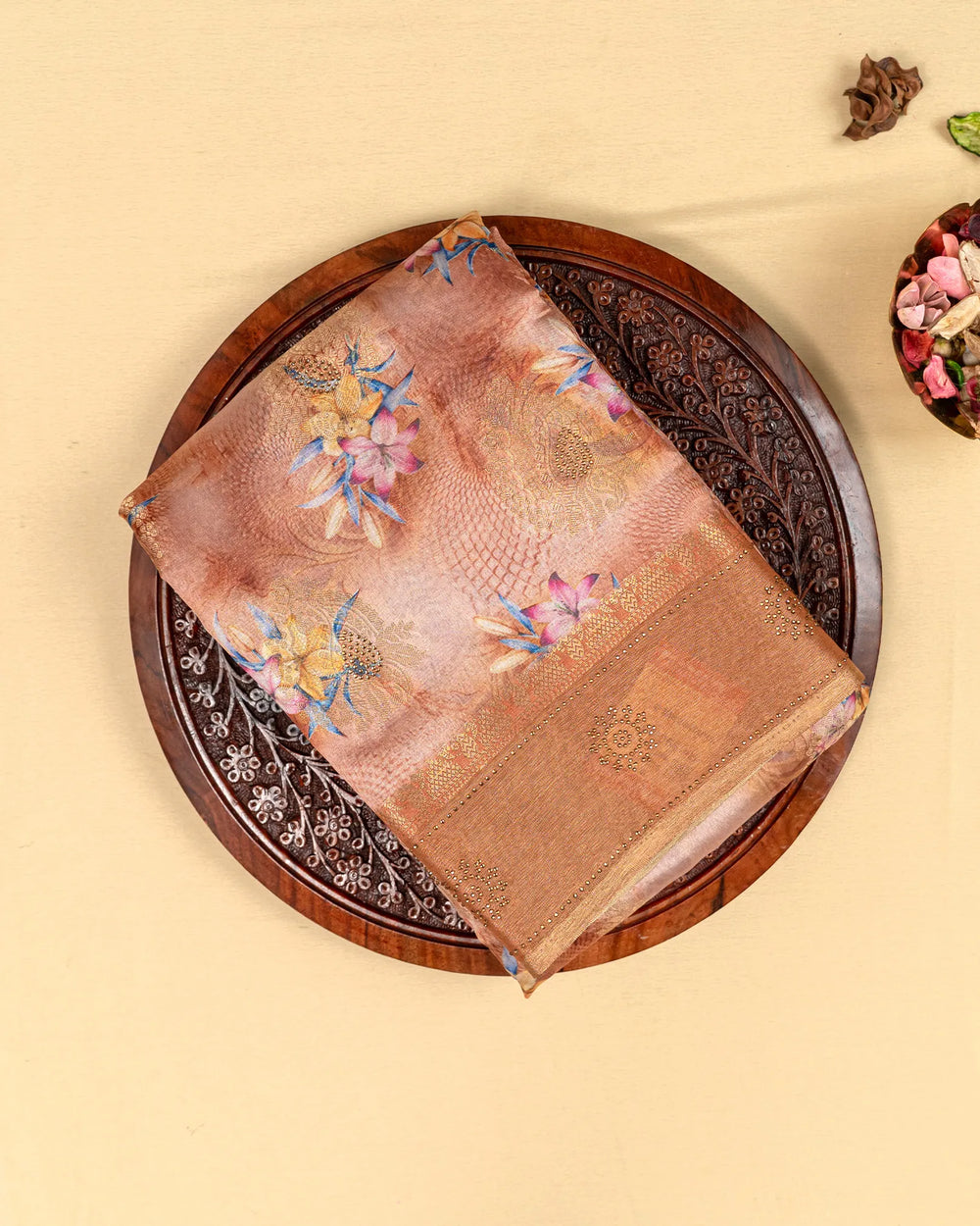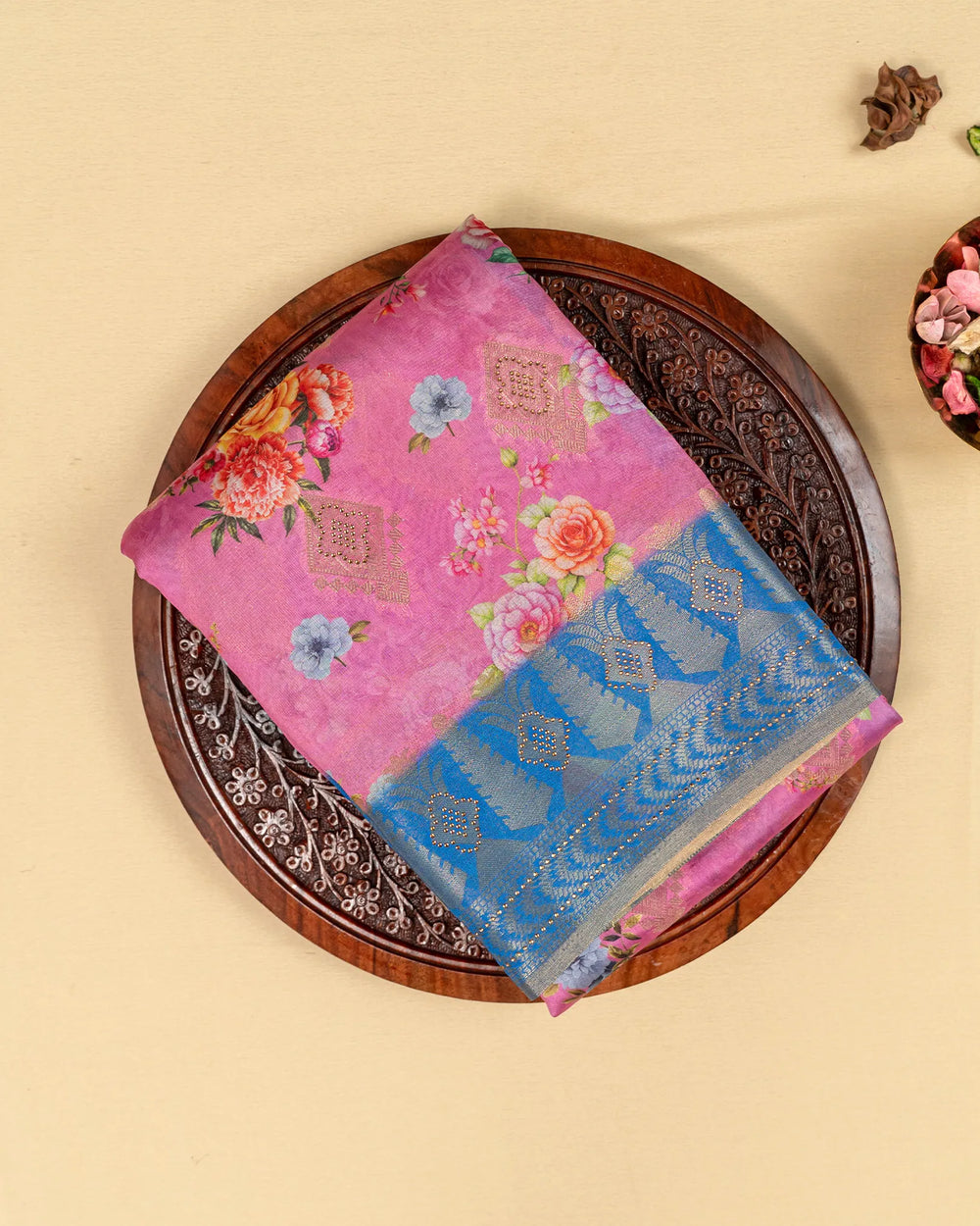 | Blouse | Contrast tissue blouse with delicate butta weaving, crafted to complement the digital print and stone embellishments of the saree |