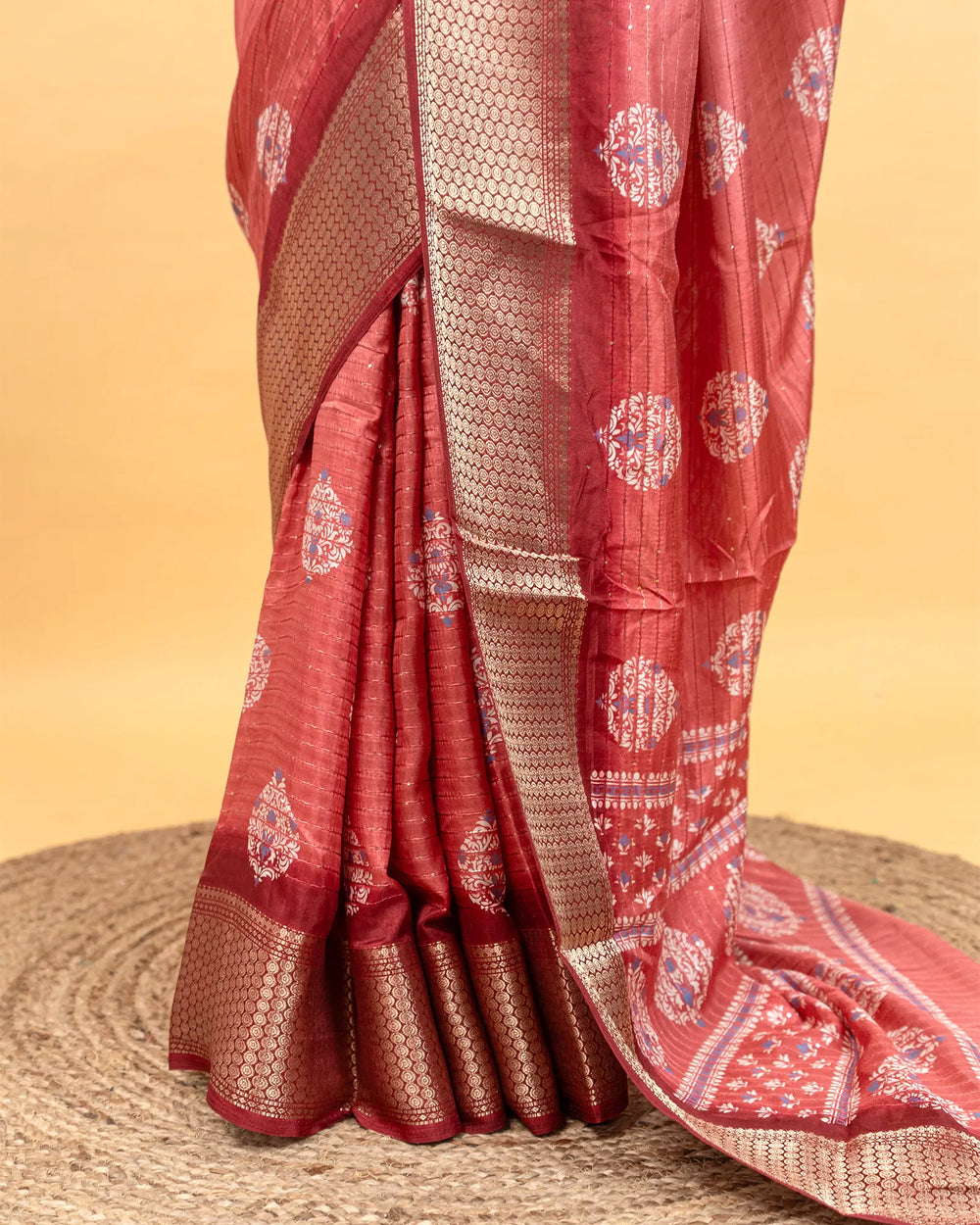 | Blouse | Running blouse with digital print and delicate sequence work, adding a contemporary sparkle to complement the Bandhini pattern and rich embroidery of the saree |