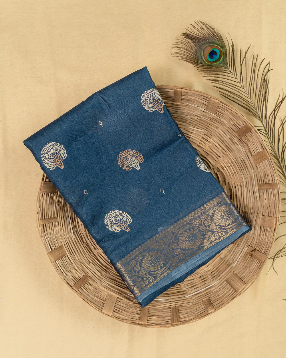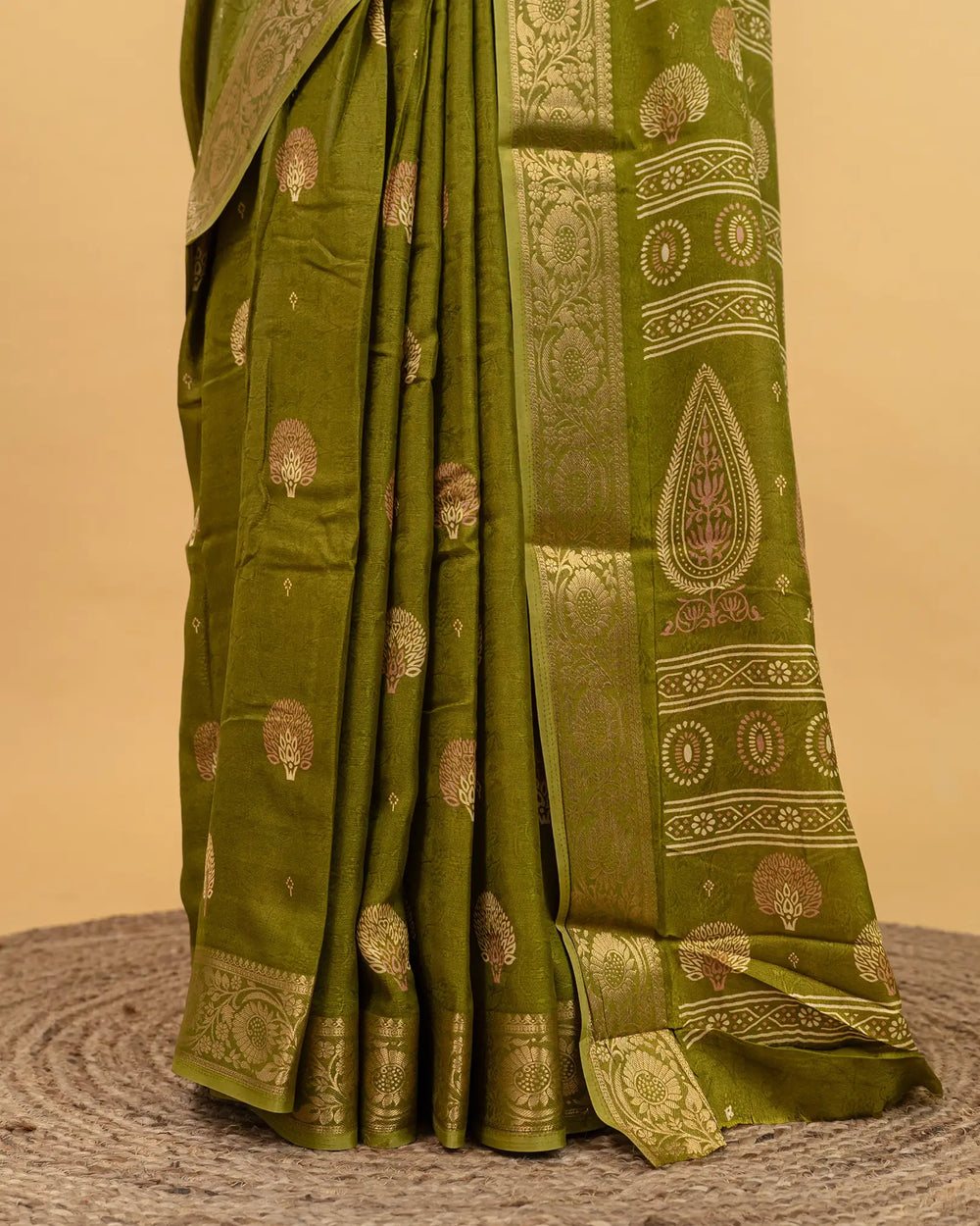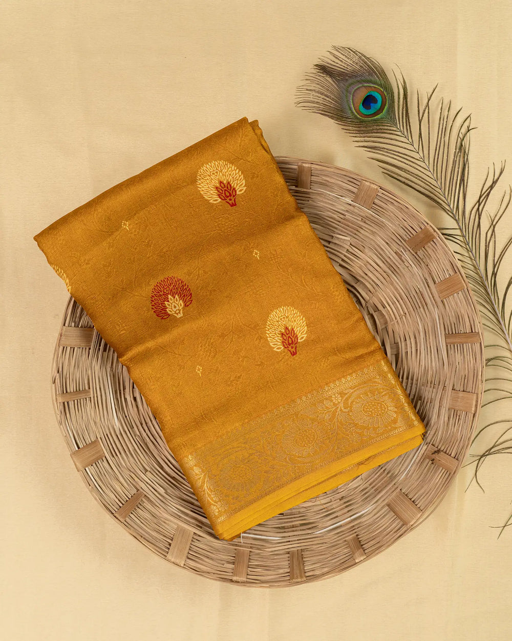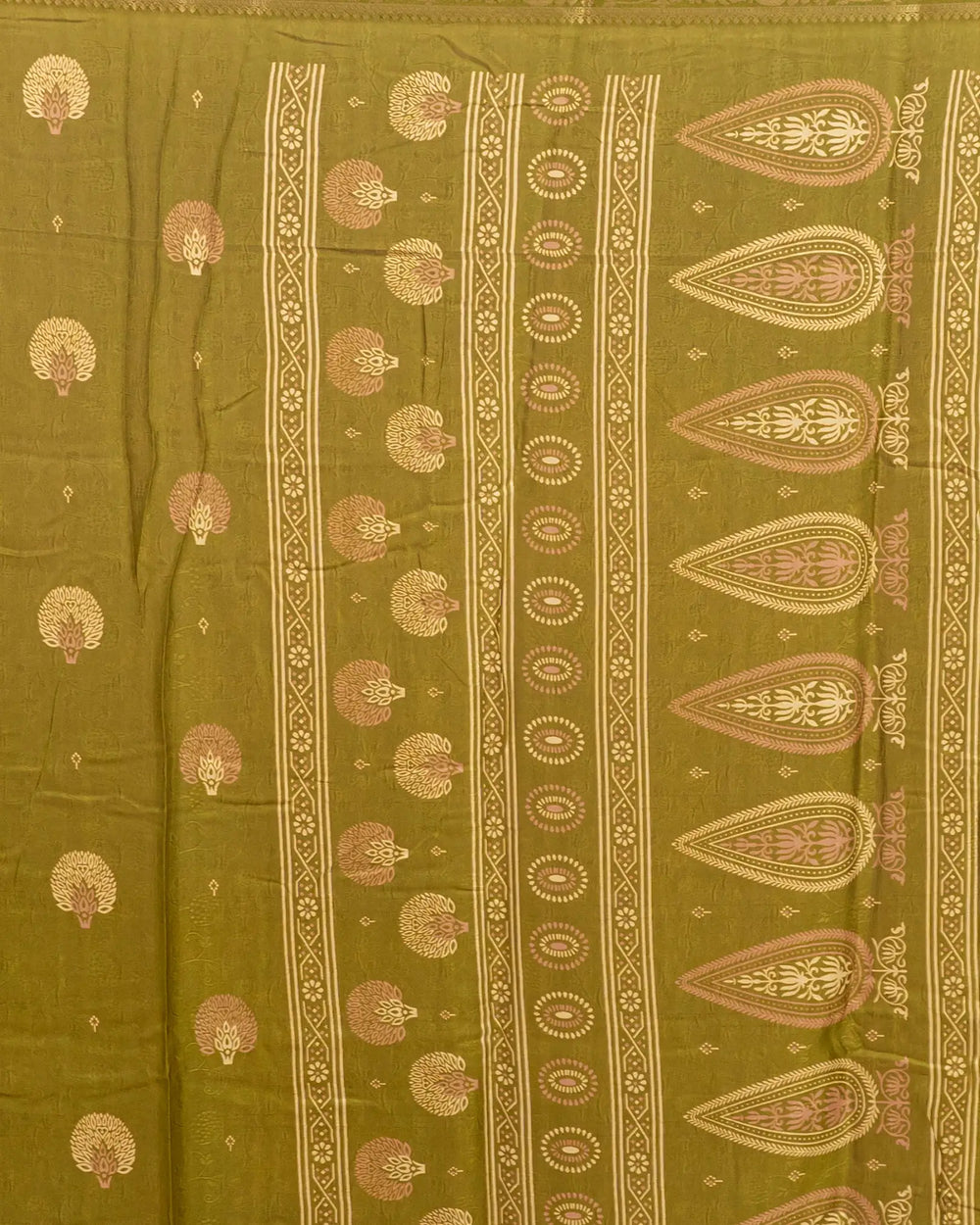 | Style | Saree adorned with embossed digital print, complemented by blouse with gold border detailing |