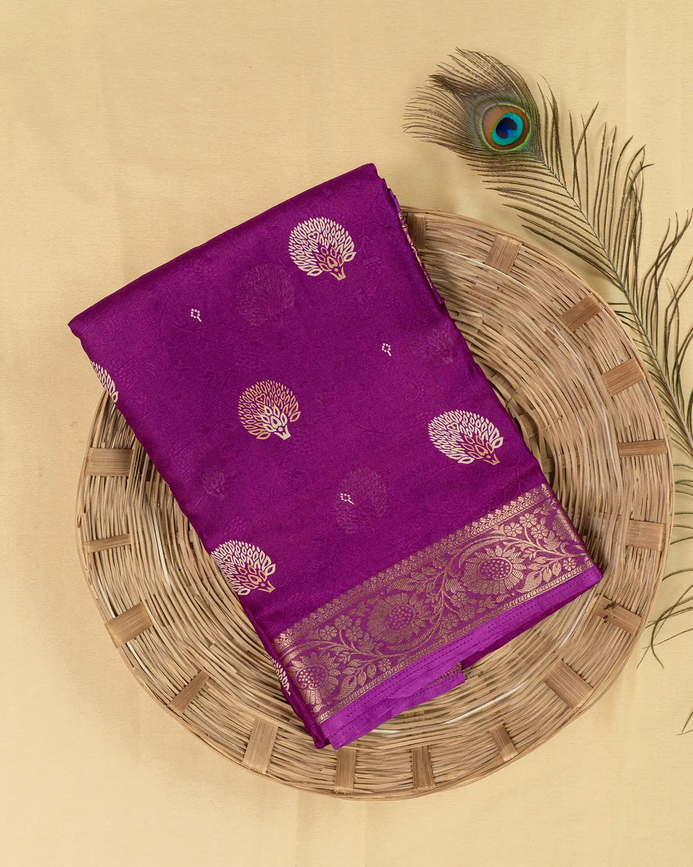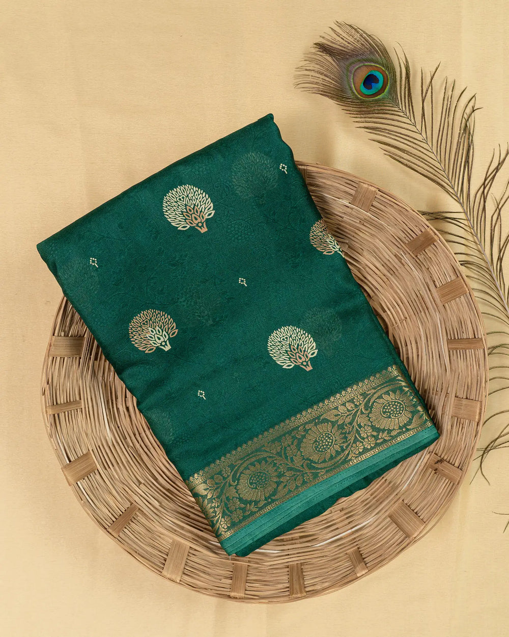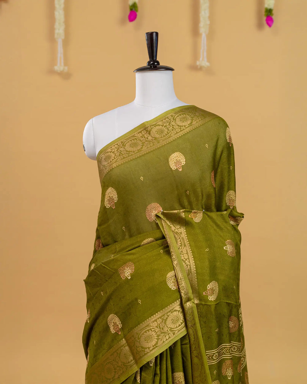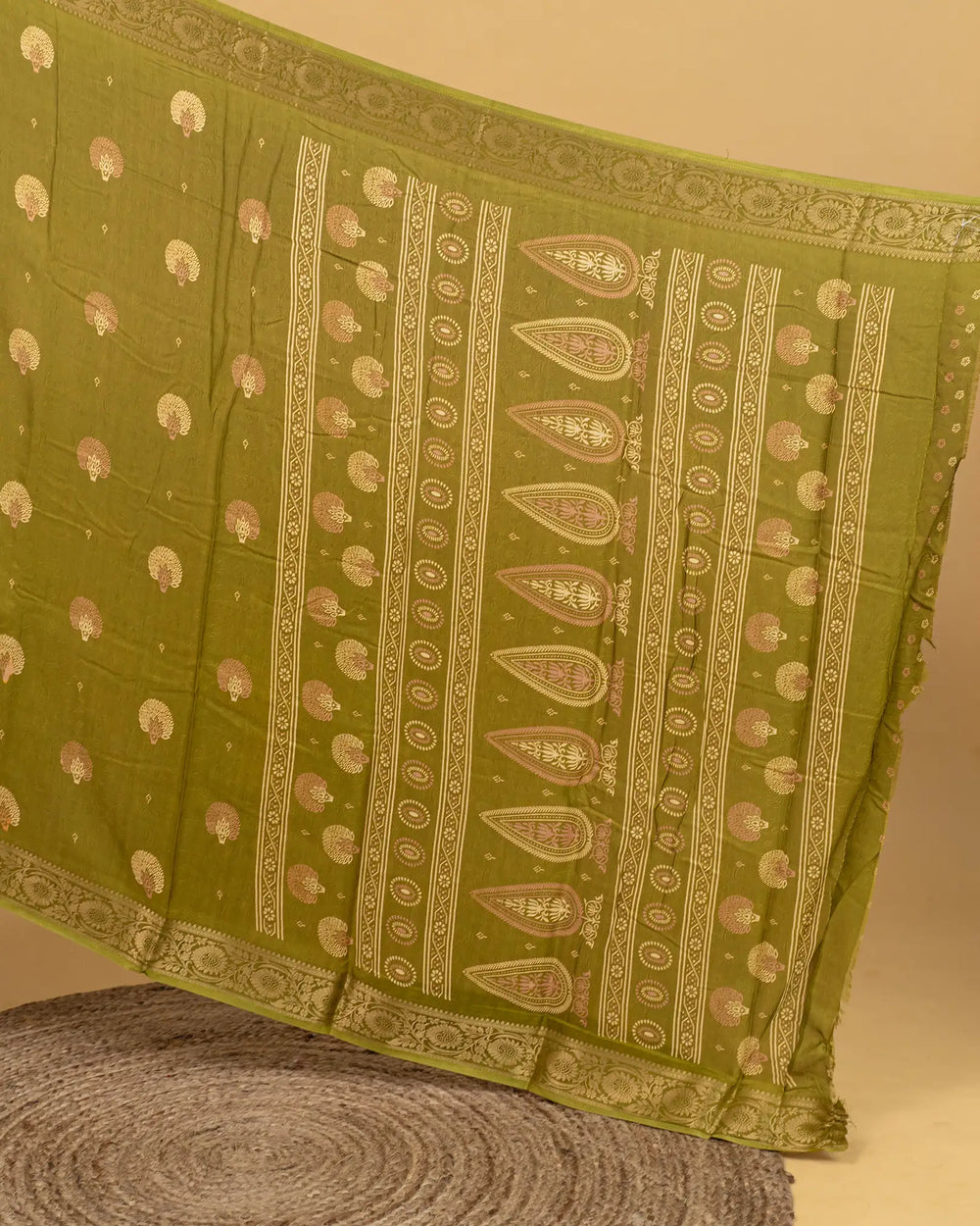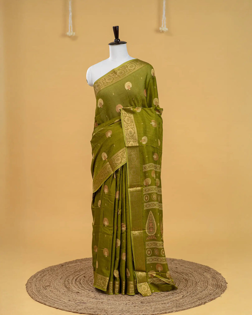 | Style | Saree adorned with embossed digital print, complemented by blouse with gold border detailing |