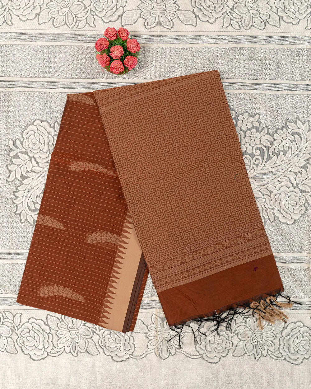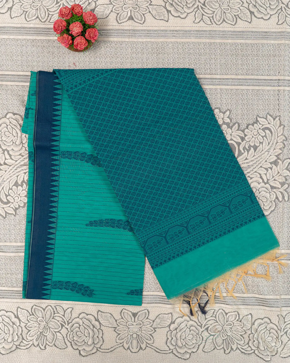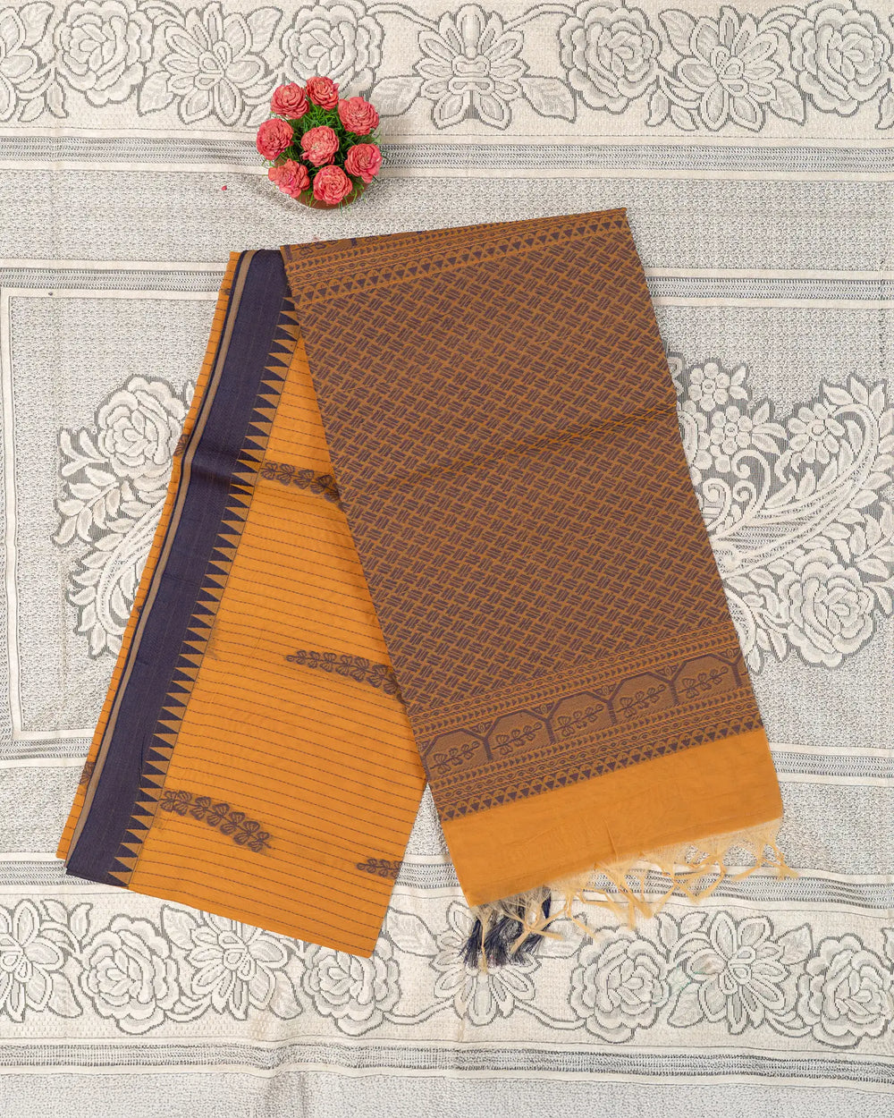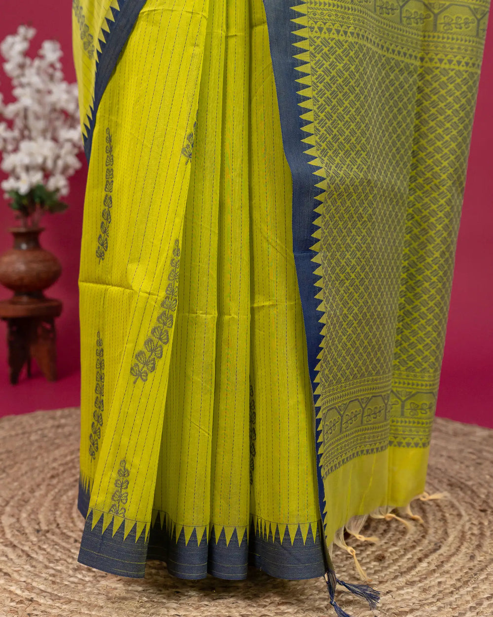 | Style | Saree adorned with thread work, complemented by a simple running plain blouse |