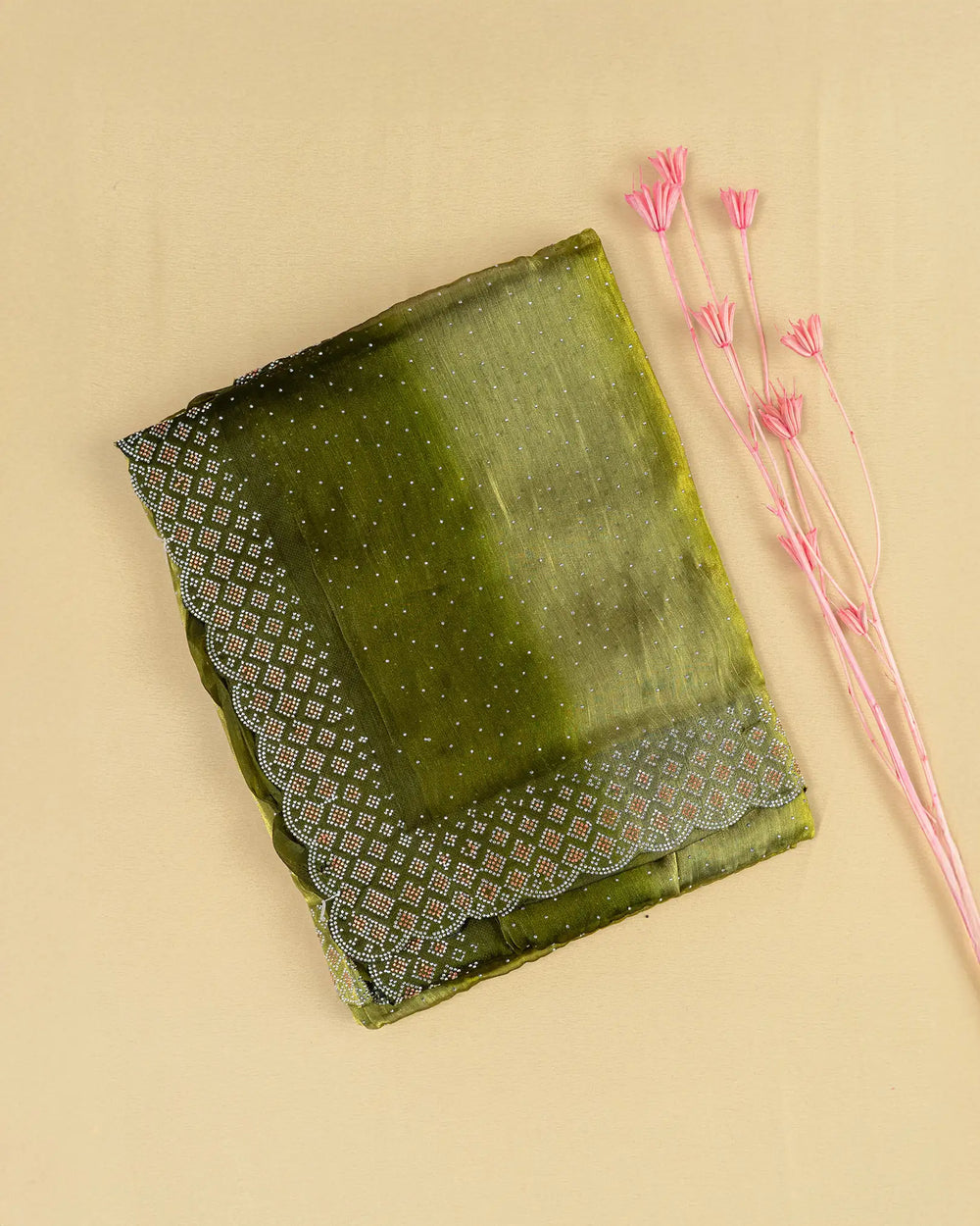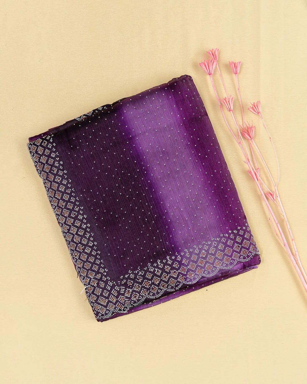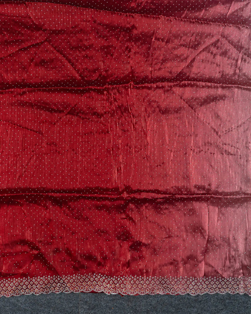 | Description | Elegant Fendy saree featuring sparkling silver stones along the body and dual-stone embellishments along the border, creating a festive and eye-catching look. |