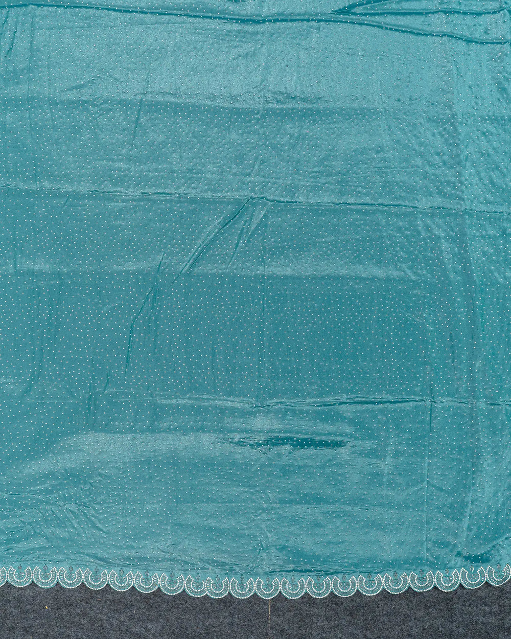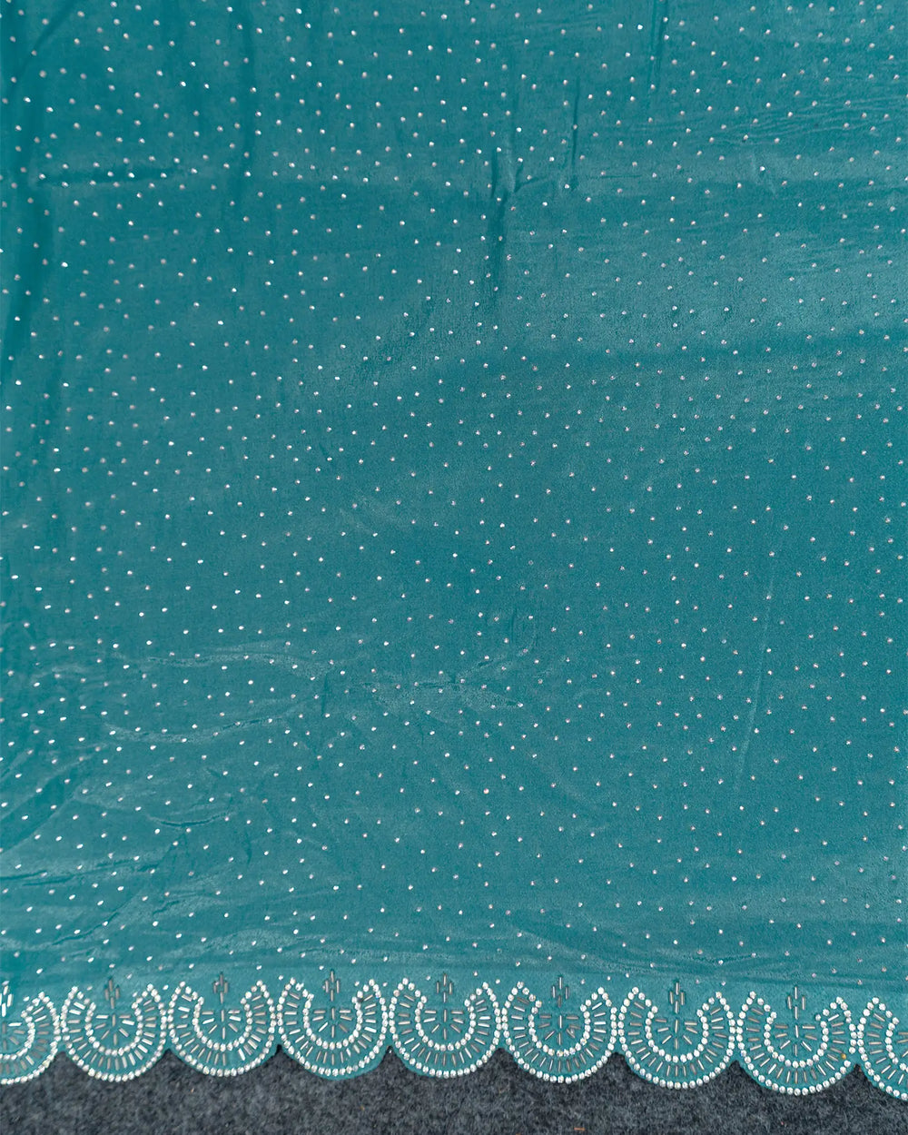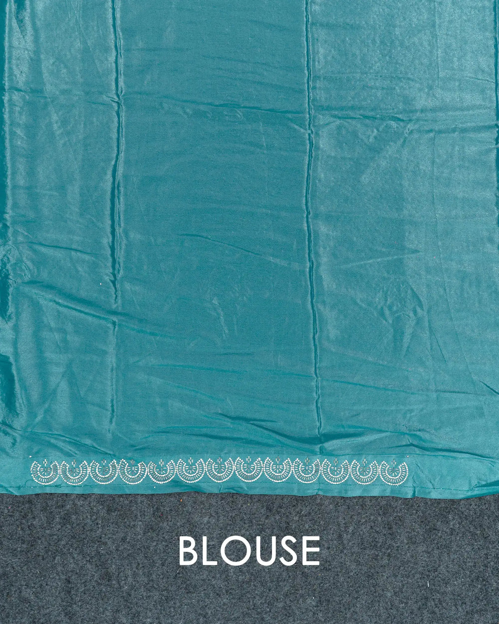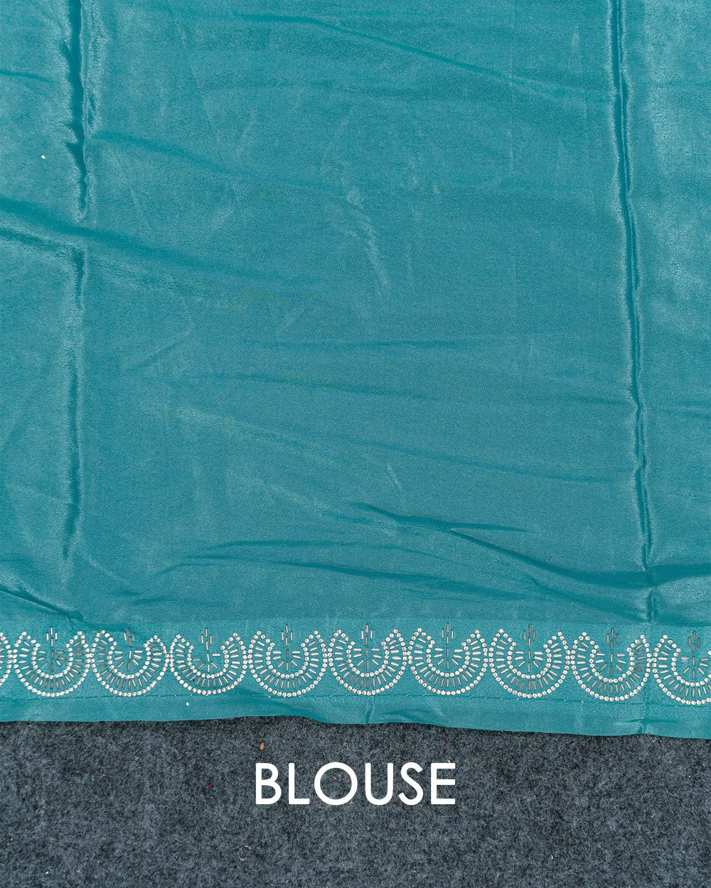 | Description | Luxurious Fendy satin saree adorned with silver stone embellishments and Jarjoshi work along the border, creating an elegant and festive look. |