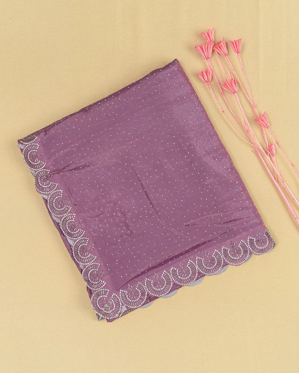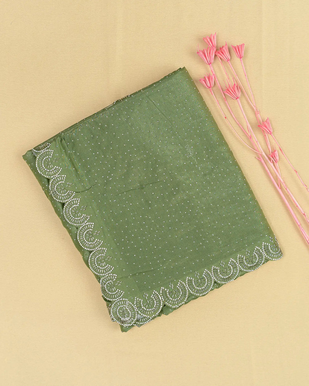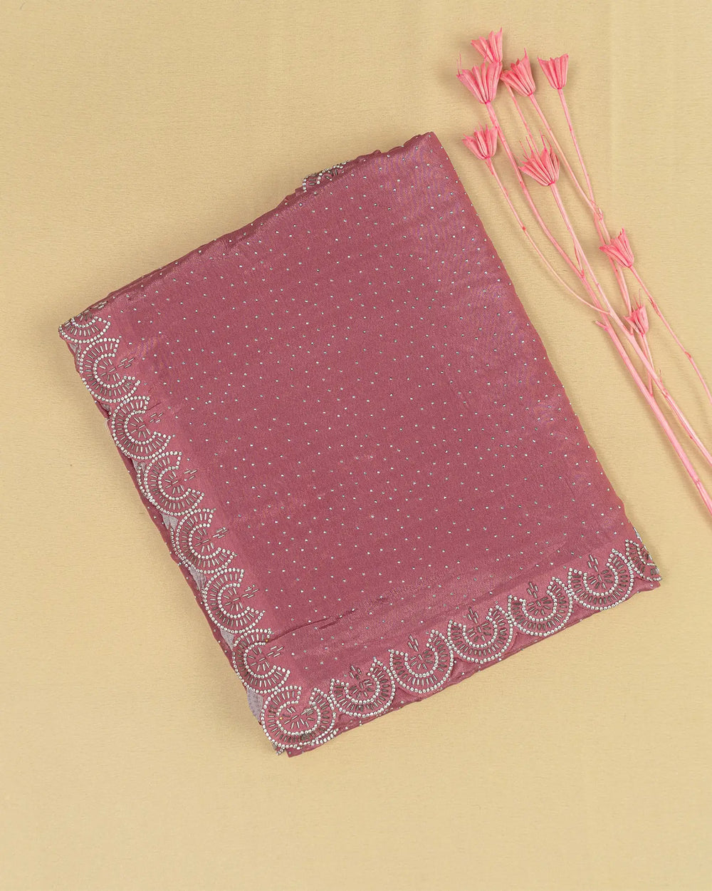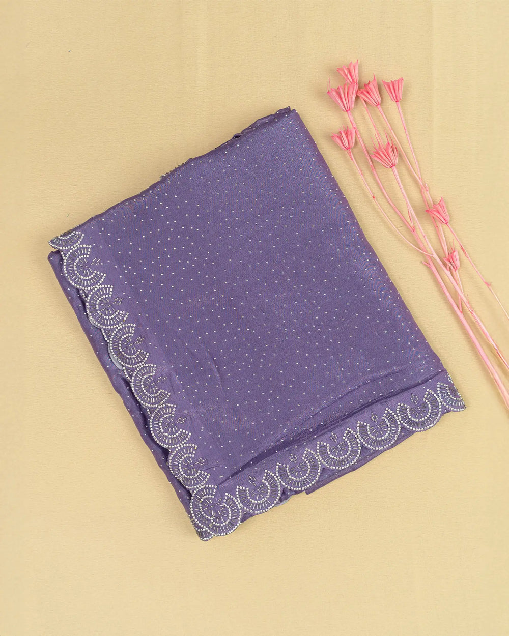 | Description | Luxurious Fendy satin saree adorned with silver stone embellishments and Jarjoshi work along the border, creating an elegant and festive look. |