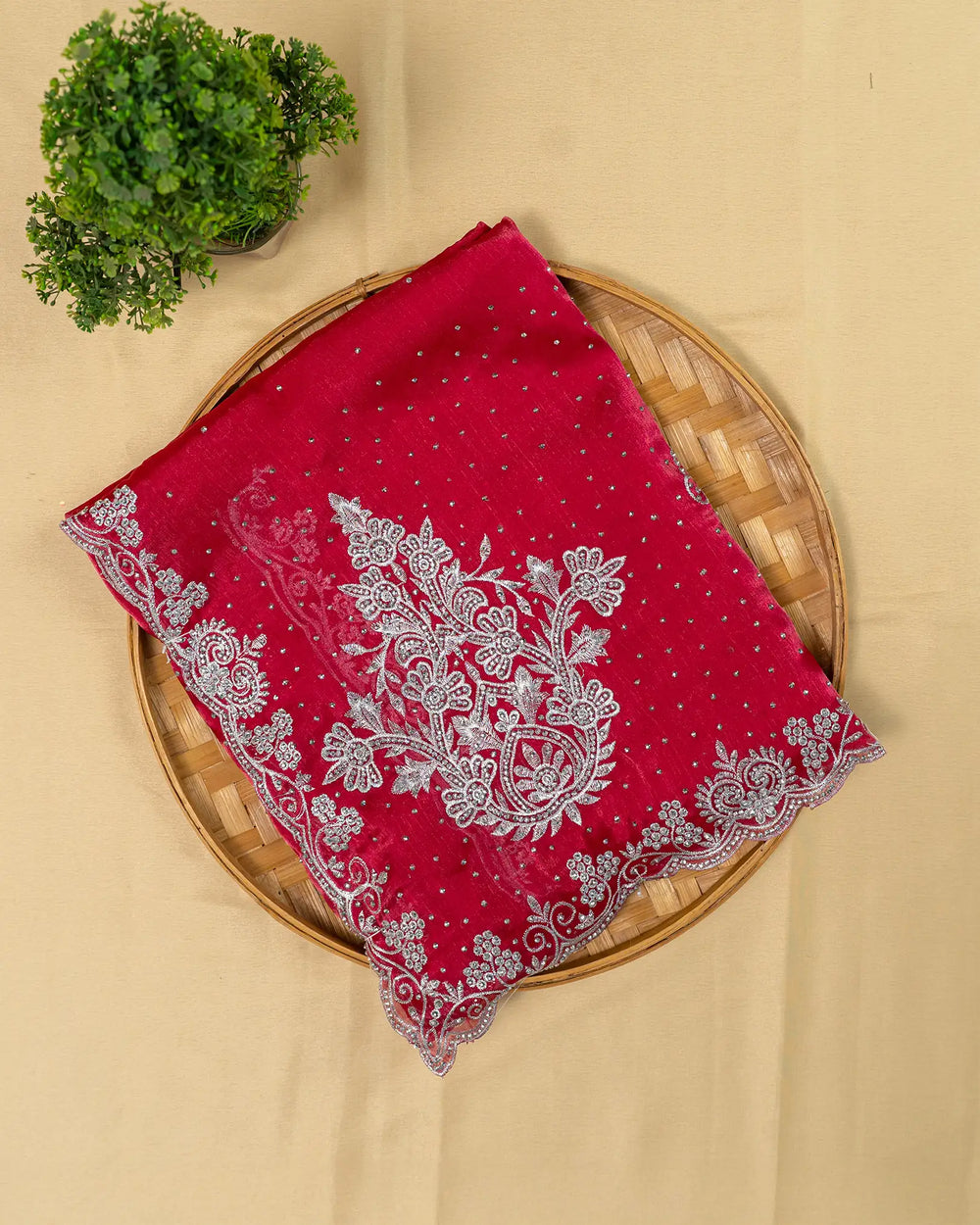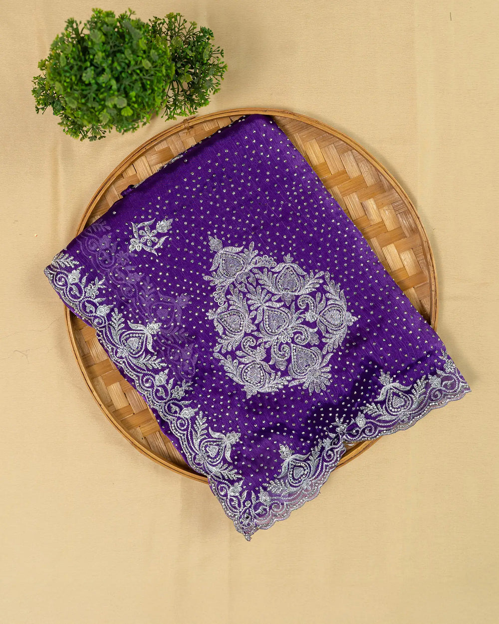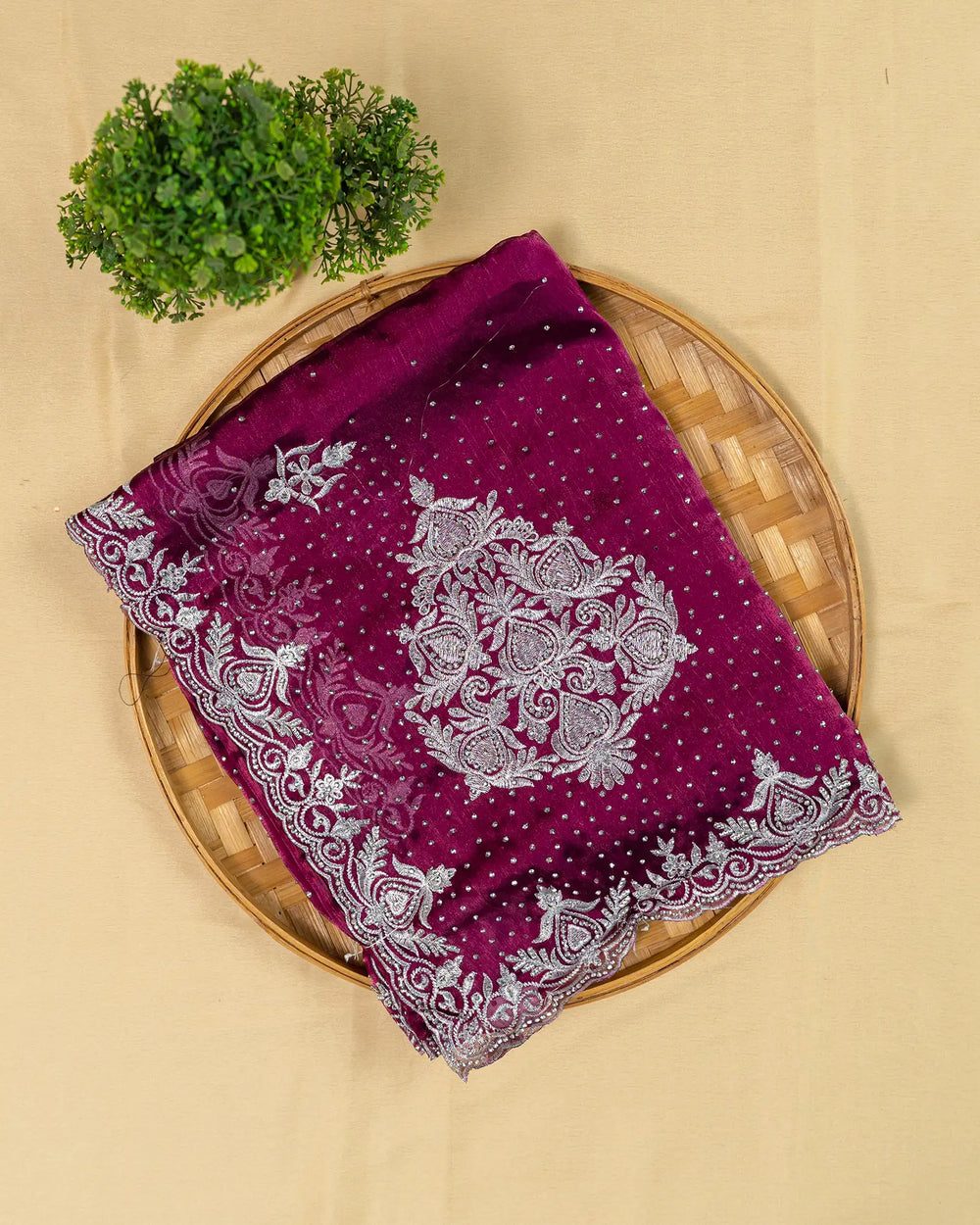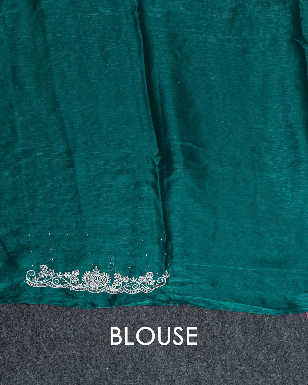 | Style | Saree accented with handmade stonework, complemented by running blouse with stone detailing on hands |