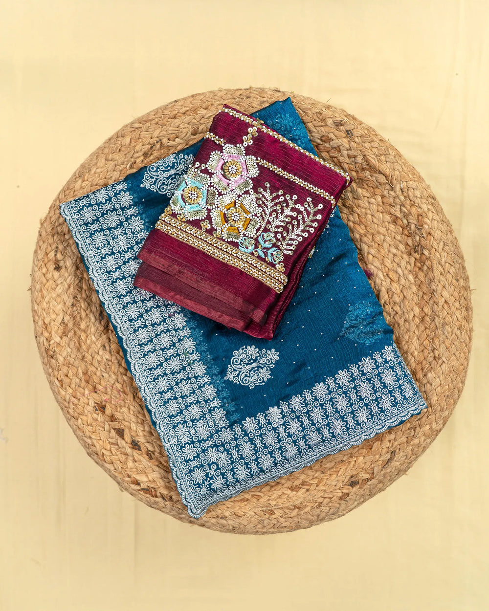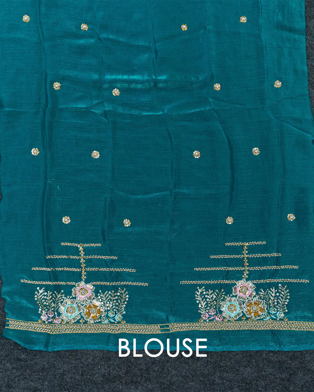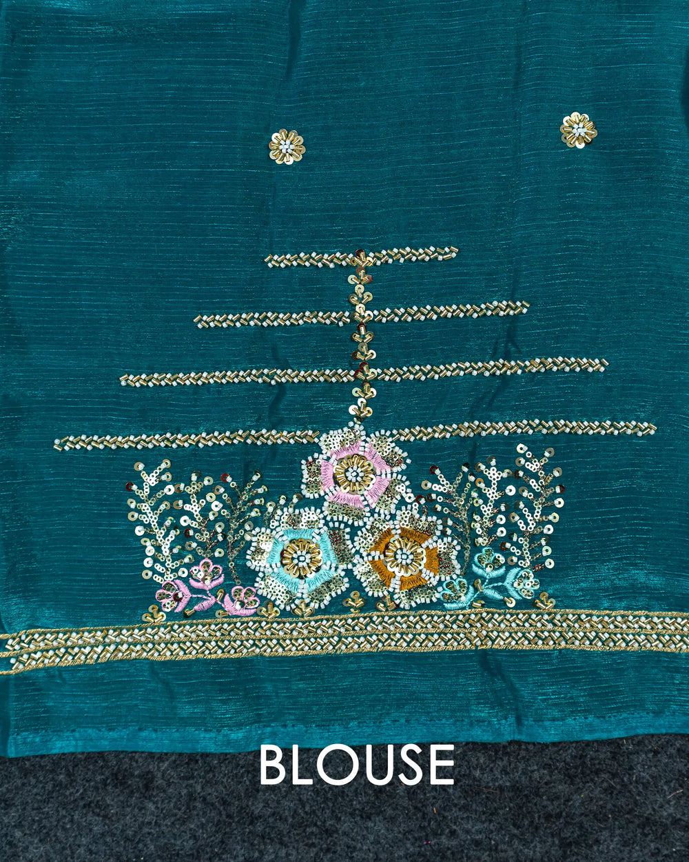 | Blouse | Separate sequence blouse work featuring intricate patterns and delicate detailing to complement the saree’s premium stone finish |