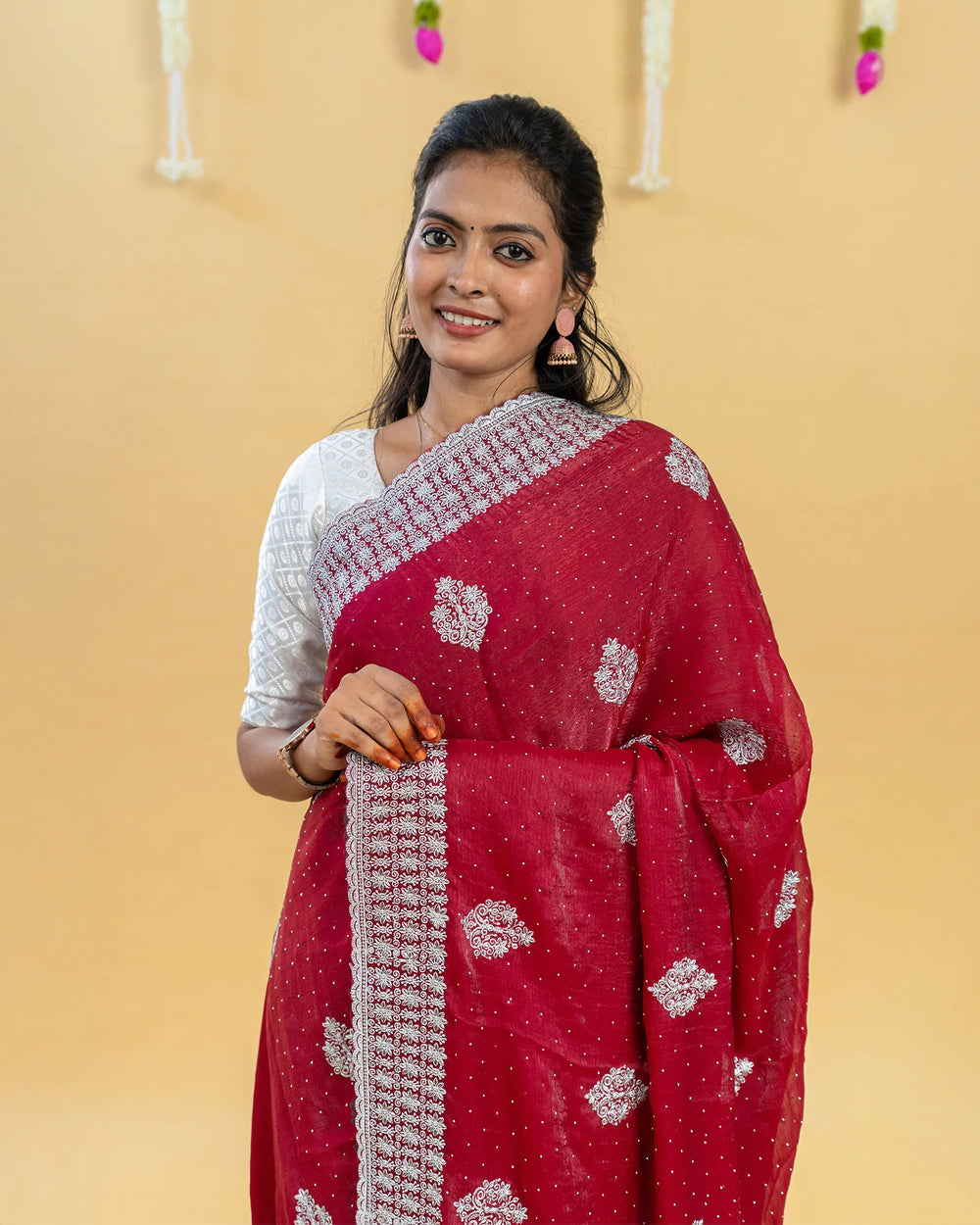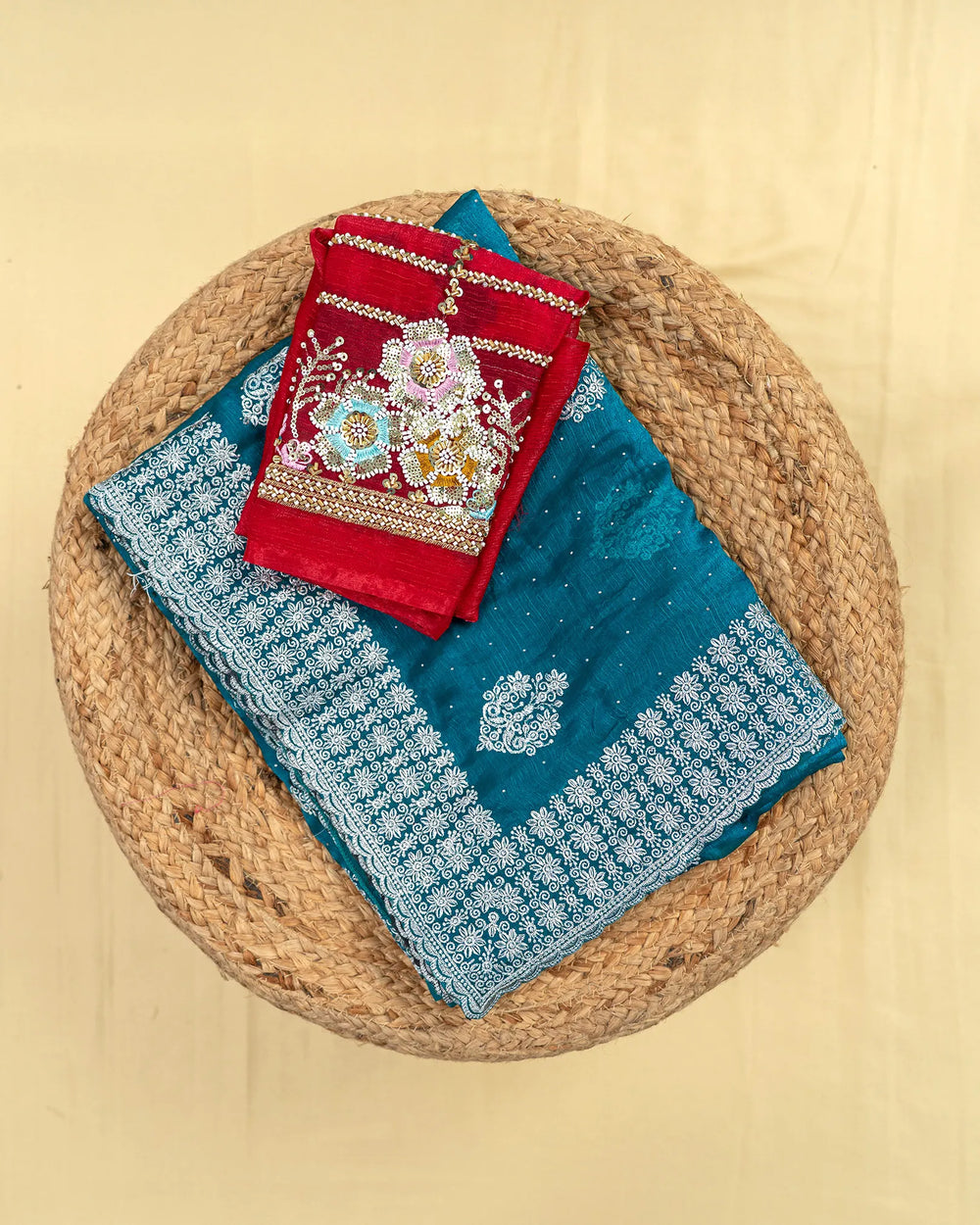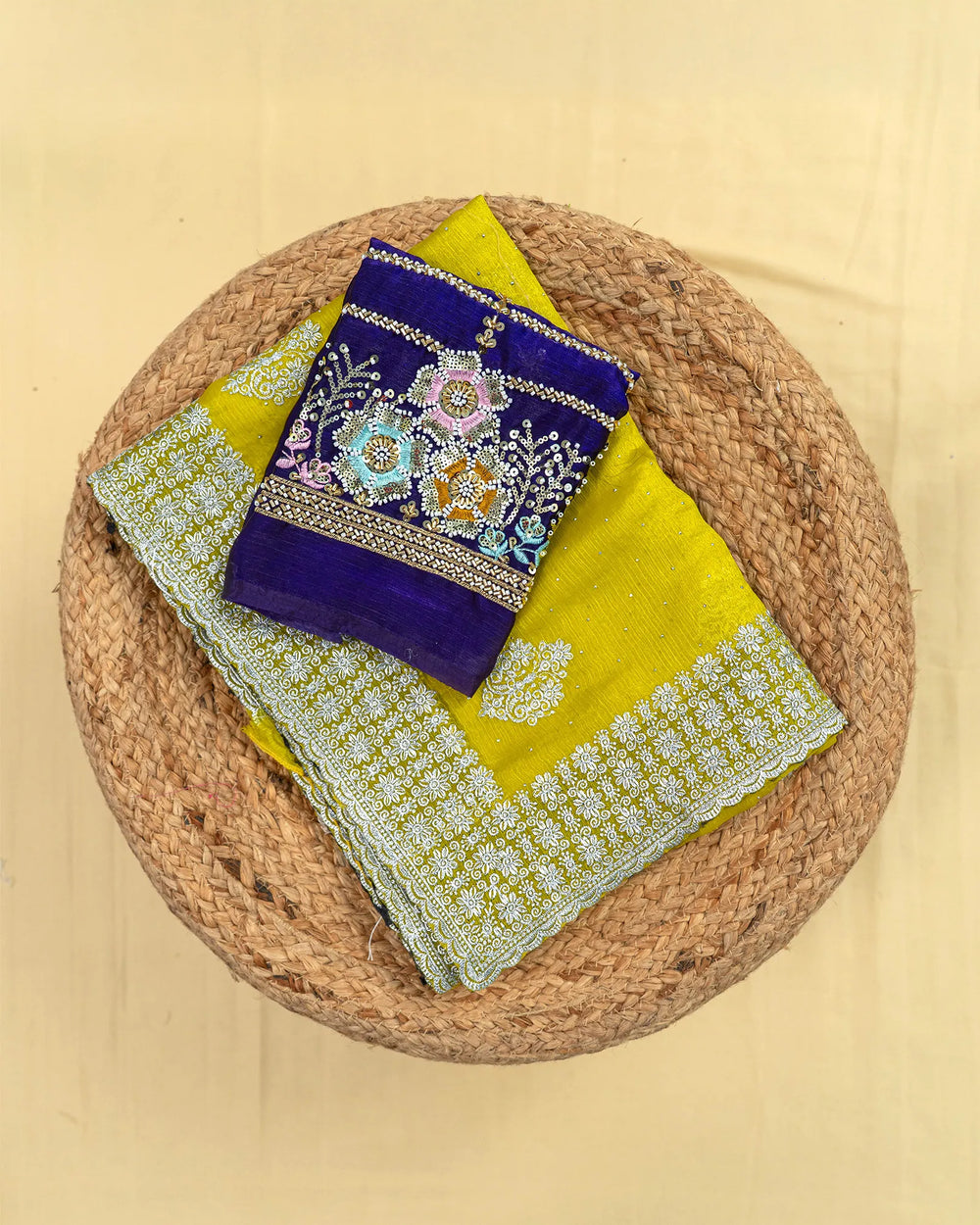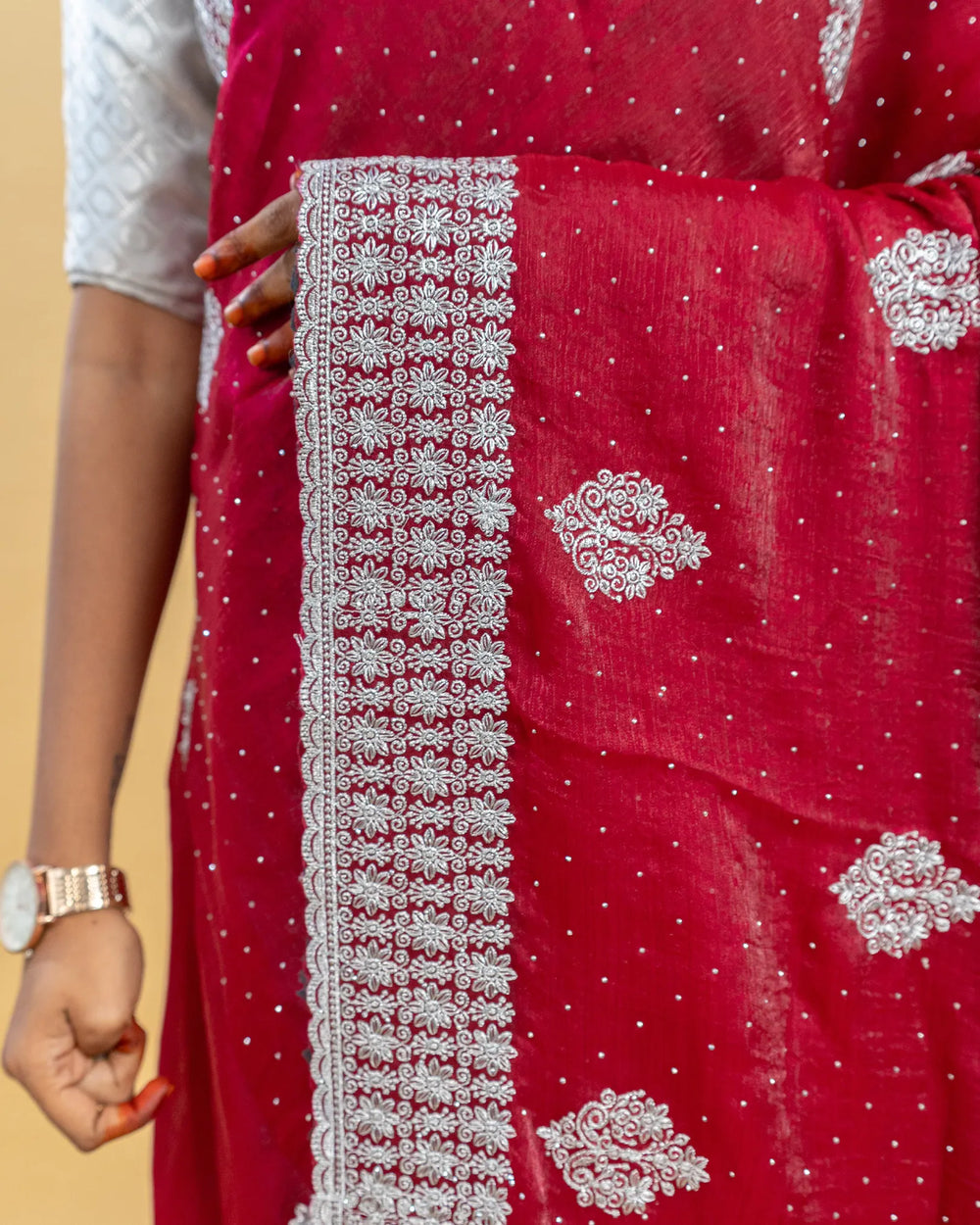 | Blouse | Separate sequence blouse work featuring intricate patterns and delicate detailing to complement the saree’s premium stone finish |