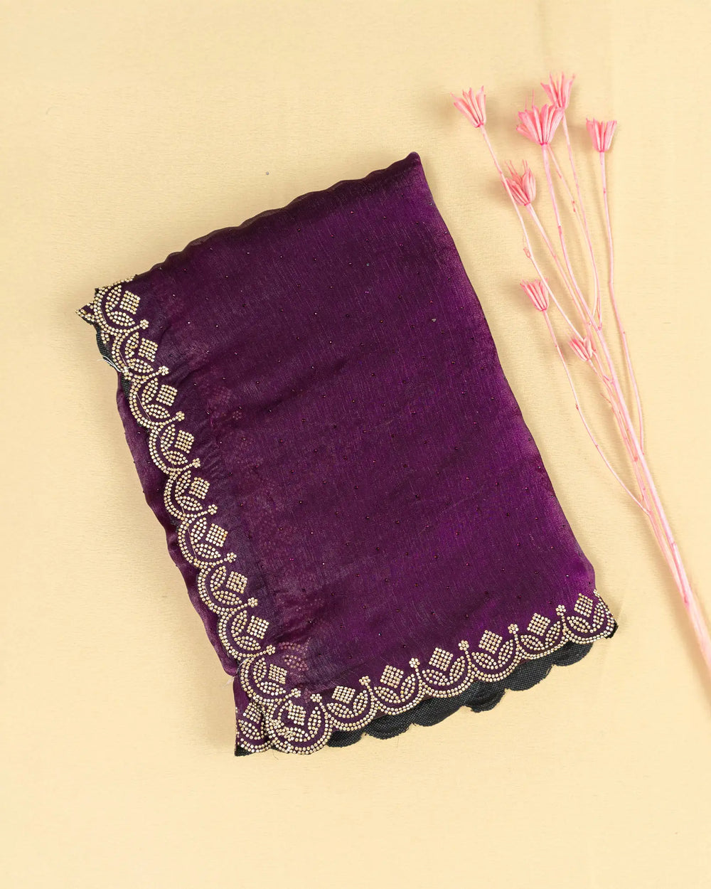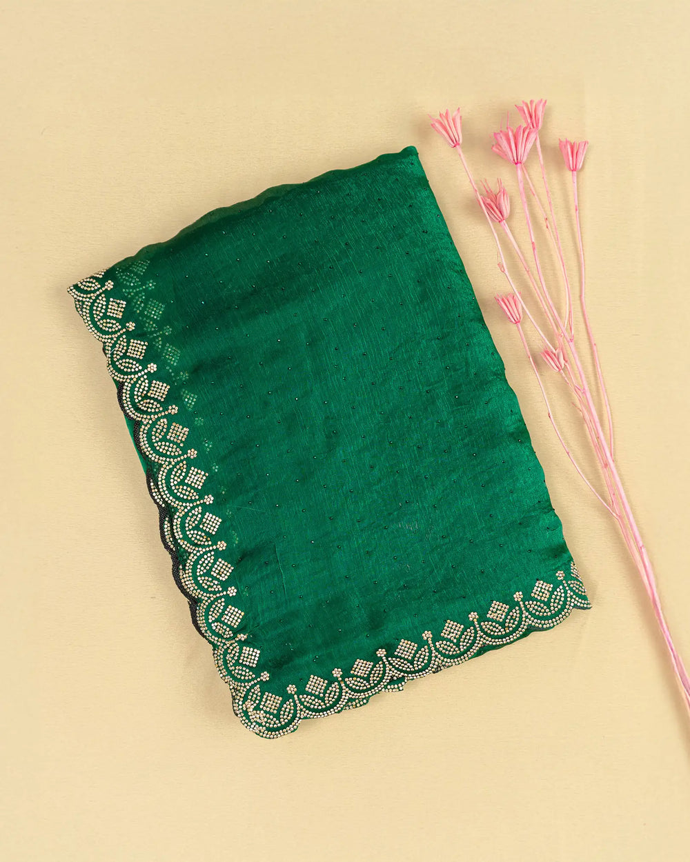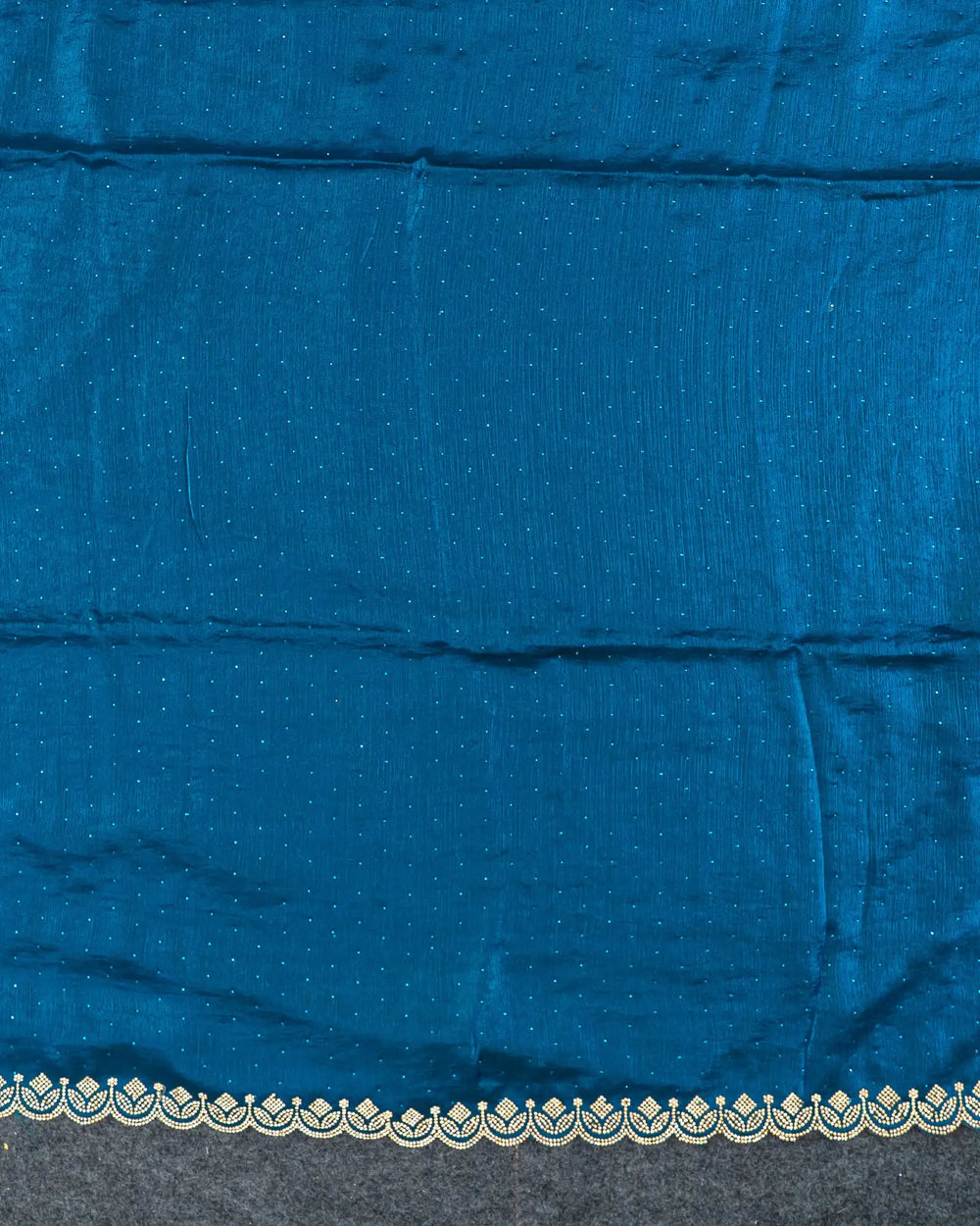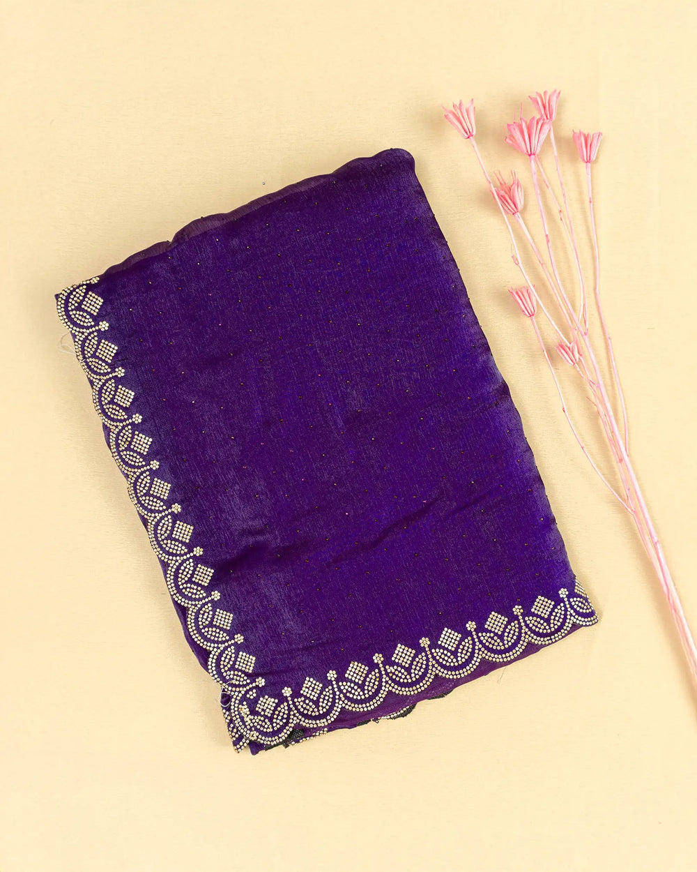| Description | Elegant Fendy saree adorned with self stones across the body and luxurious Jharkhand gold stone embellishments along the border, creating a stunning festive and celebratory look. |