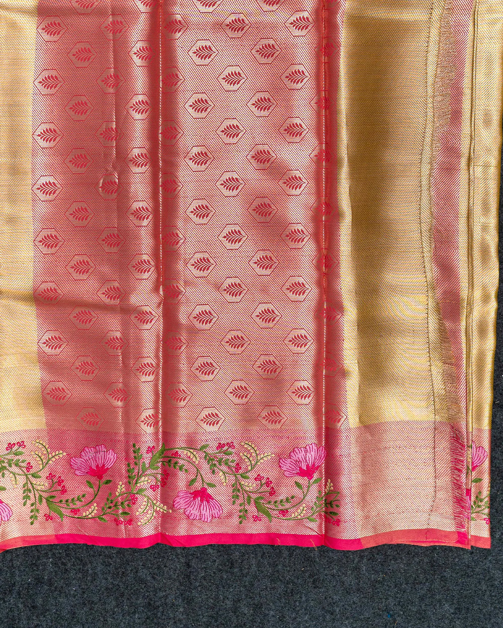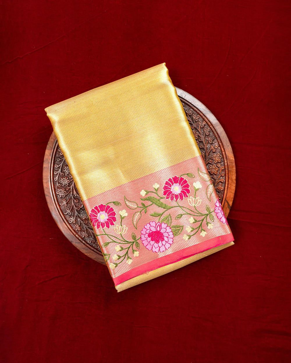 | Description | Elegant gold tissue saree featuring a rich Zari body with premium border work, perfect for festive occasions, weddings, and celebrations requiring a sophisticated look. |