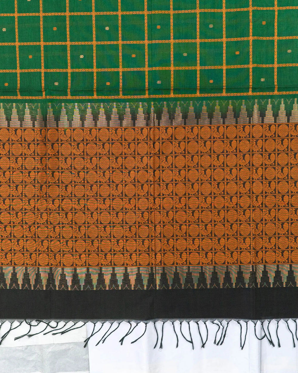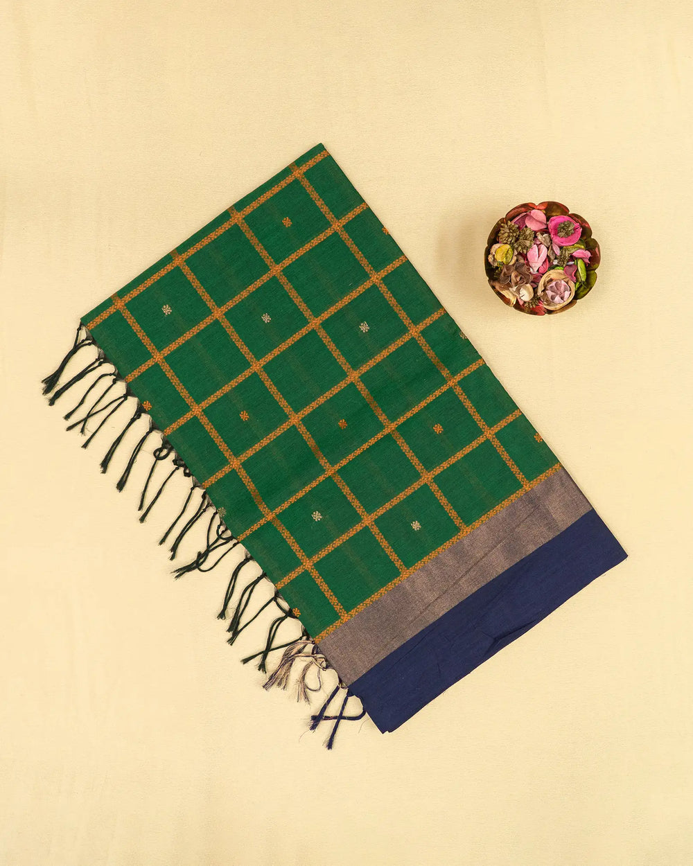 | Description | Handloom cotton saree featuring checked butta patterns, offering a traditional yet versatile look for casual and festive occasions. |