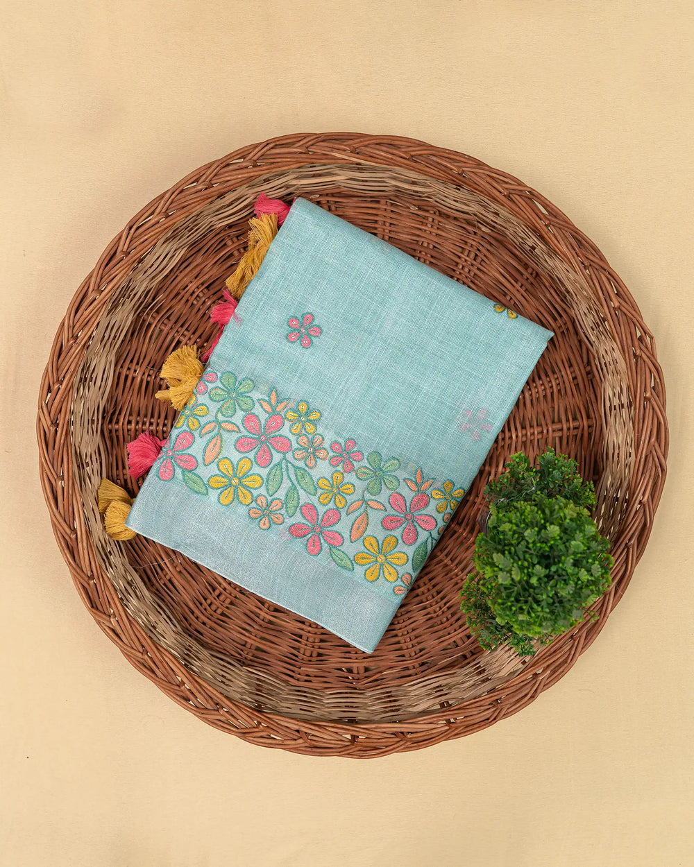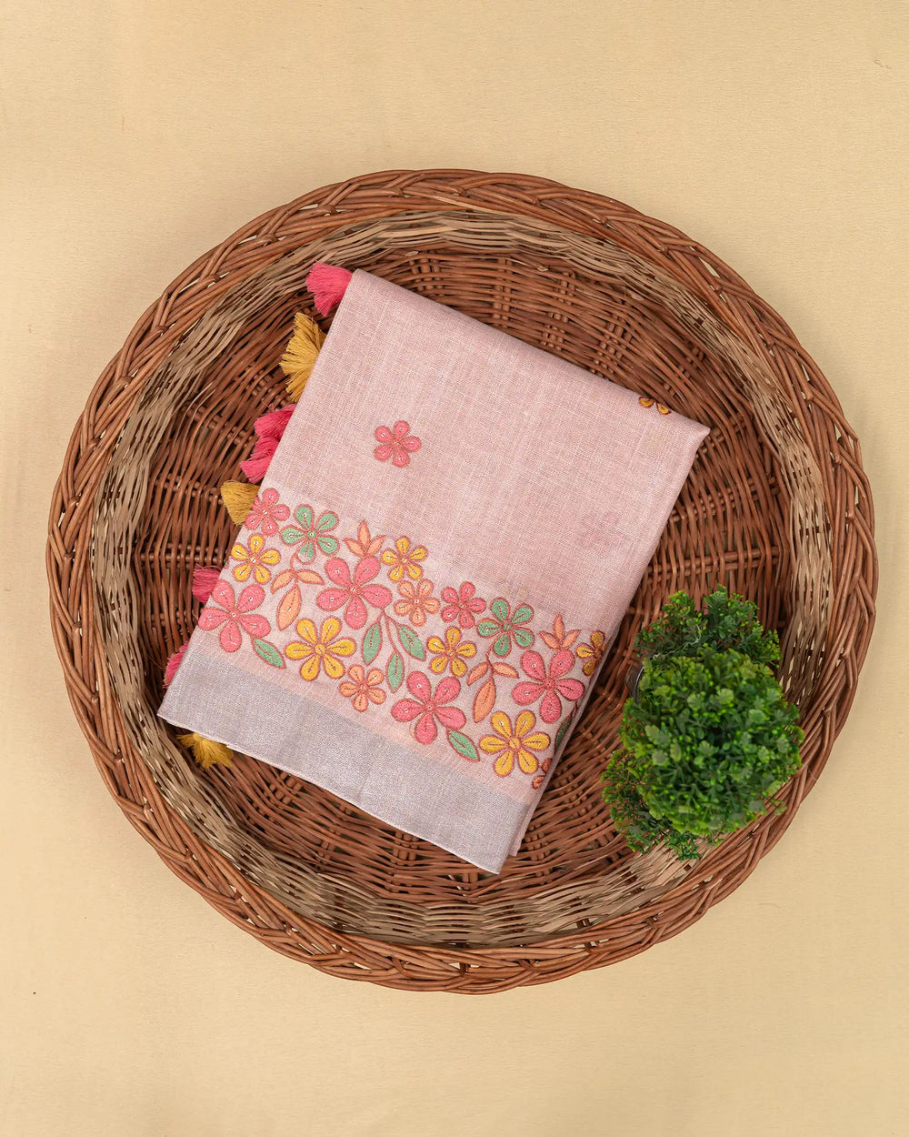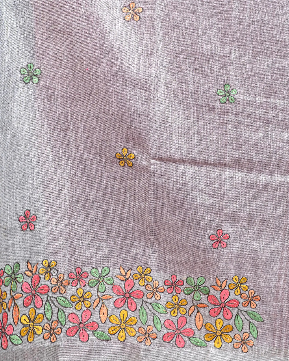 | Description | Linen cotton saree with delicate border embroidery, combining elegance with subtle charm for casual and festive occasions. |