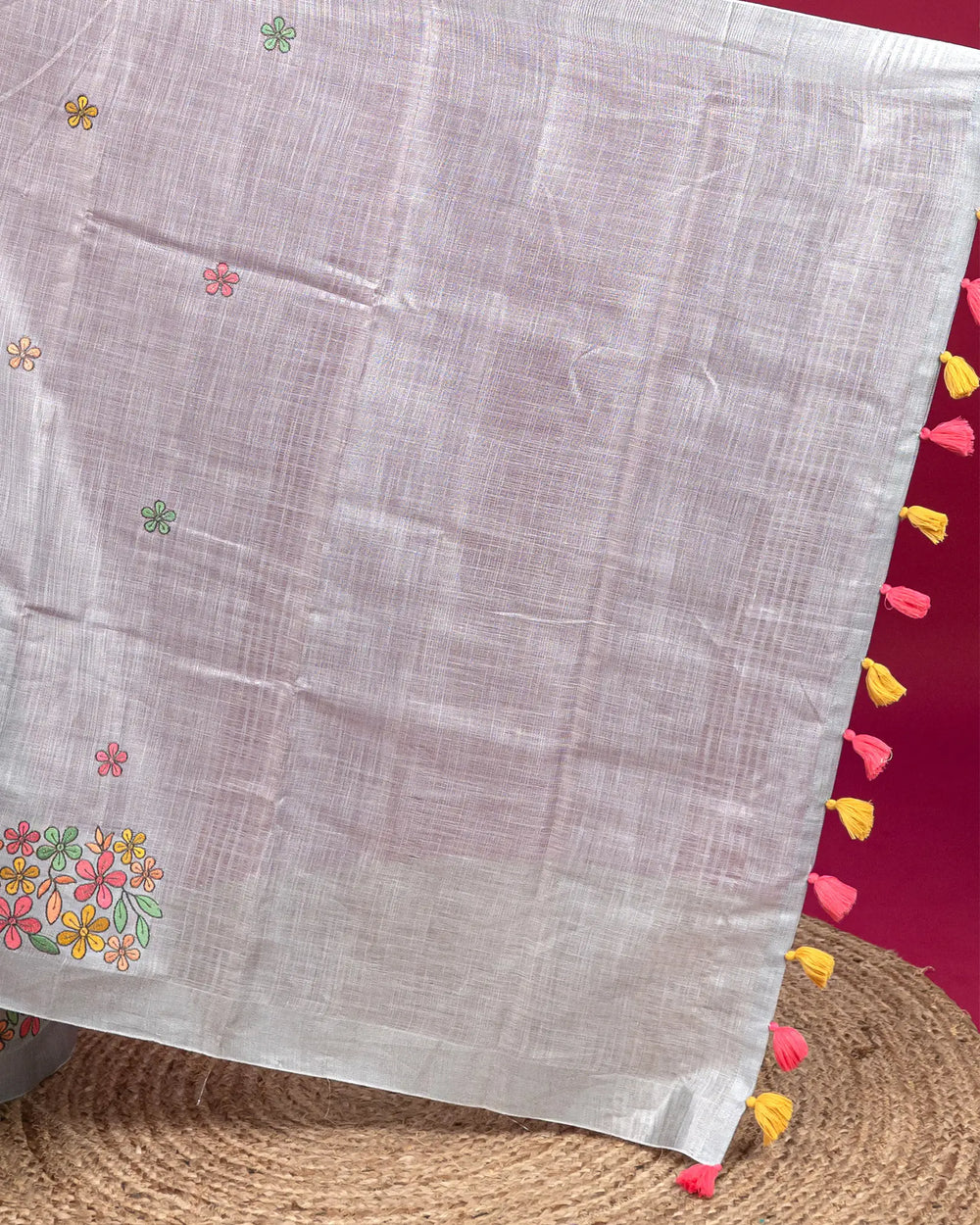 | Style | Traditional linen cotton saree design with embroidered borders, perfect for refined and elegant styling |