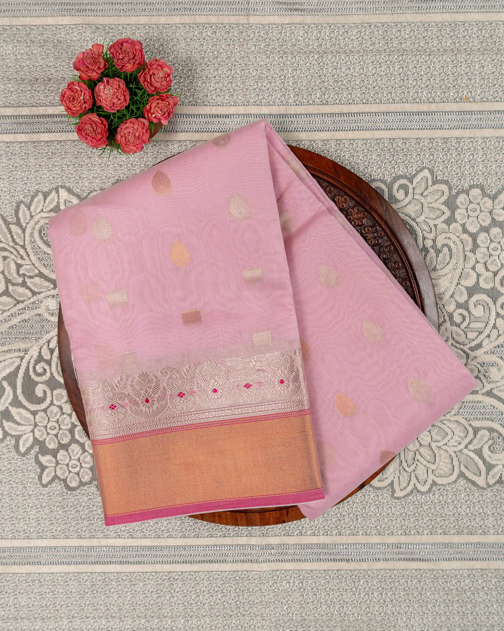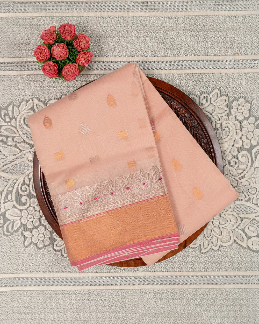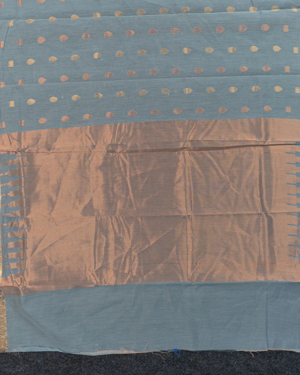 | Style | Saree accented with copper and gold zari, complemented by running butta blouse with copper zari |