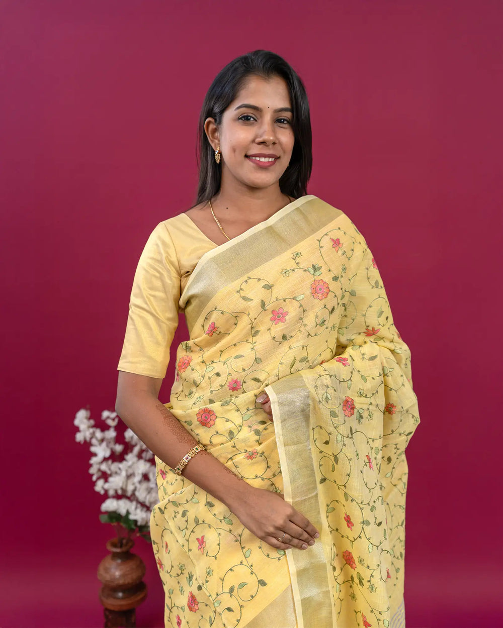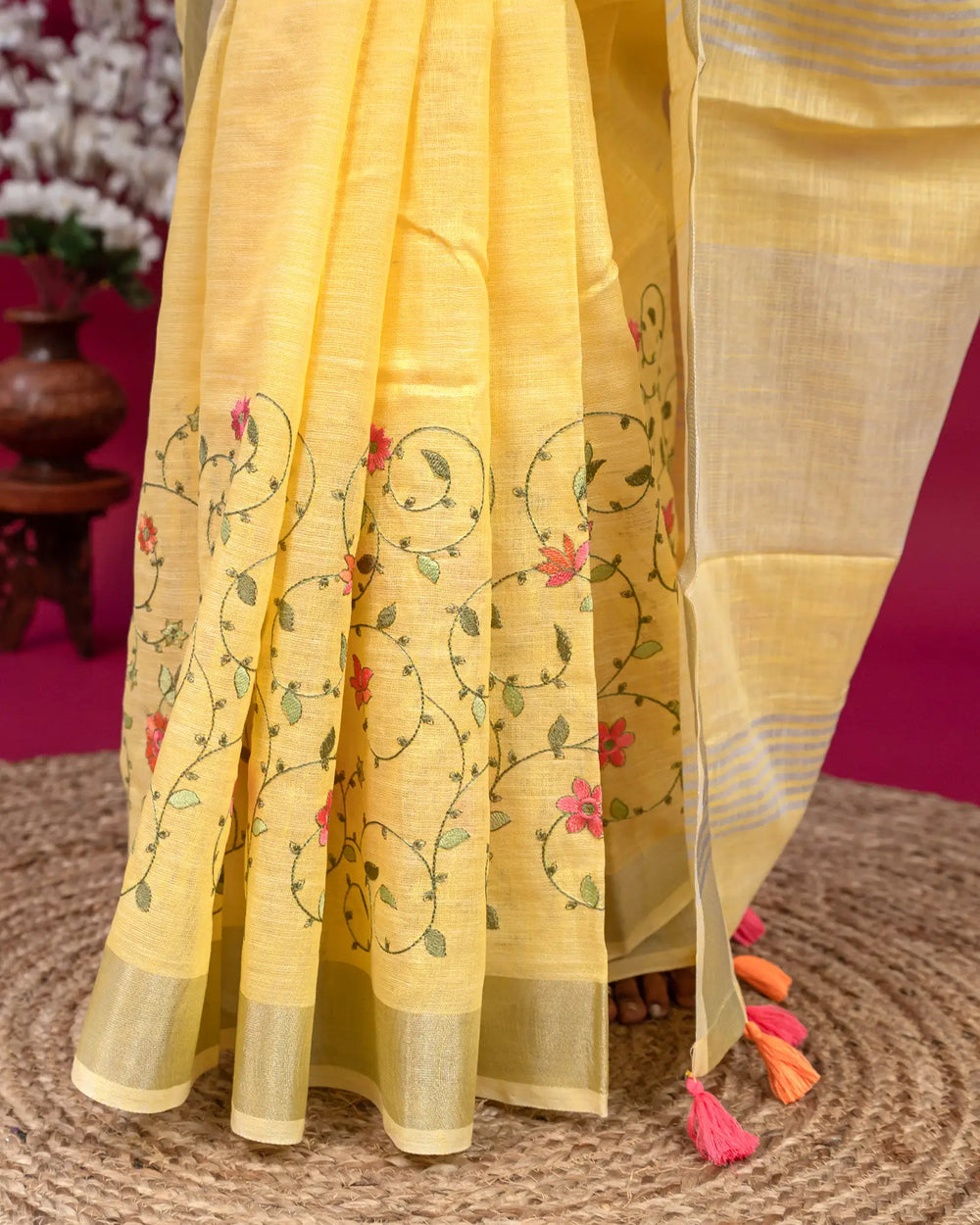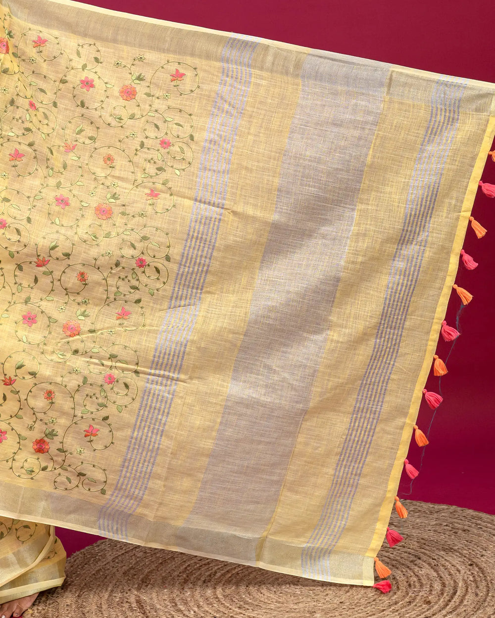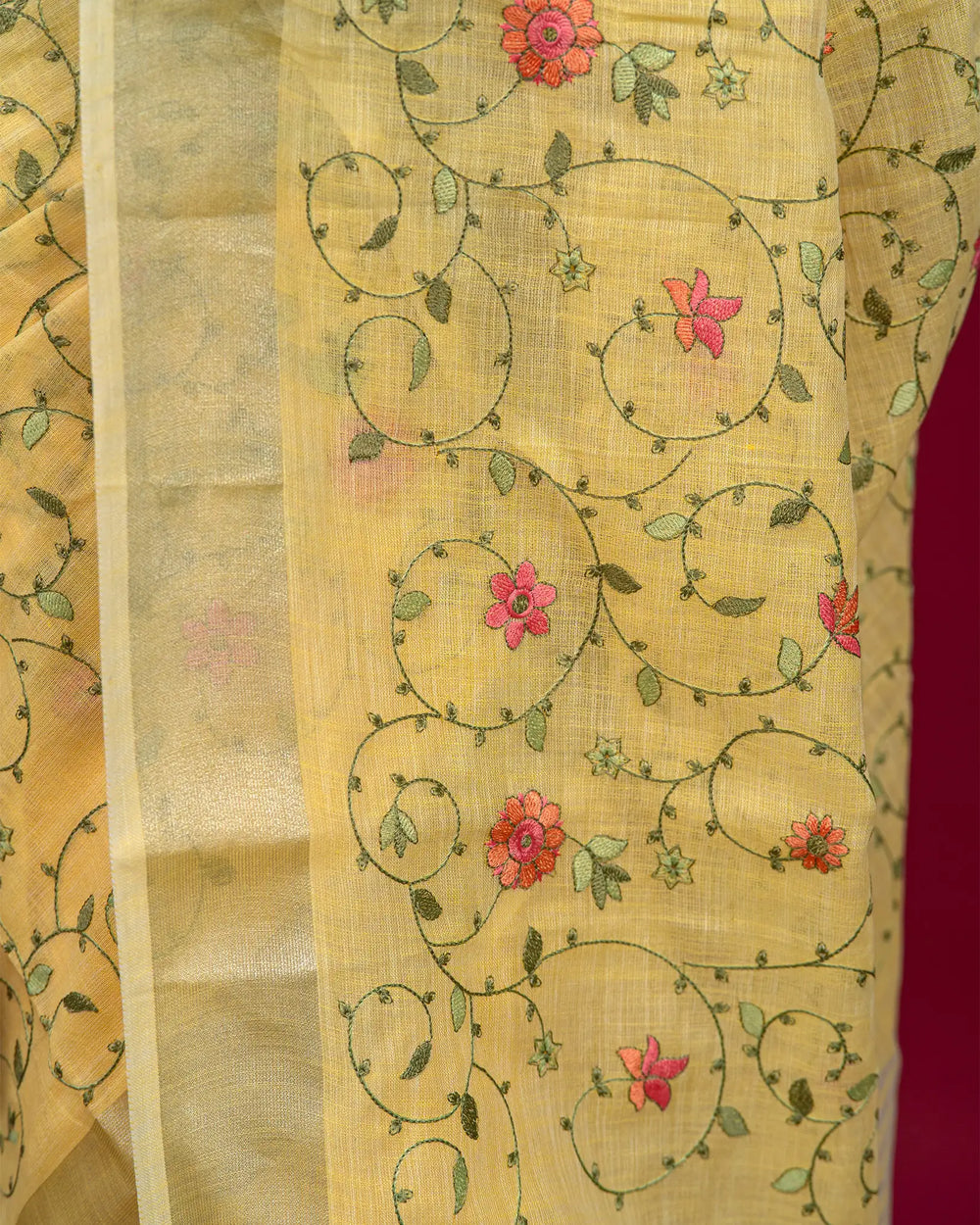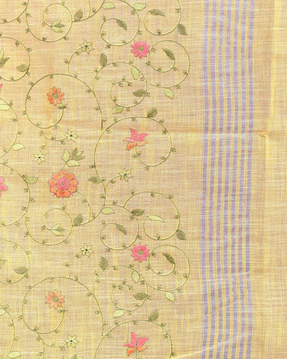 | Style | Traditional linen cotton saree design with full embroidery, perfect for elegant and refined styling |