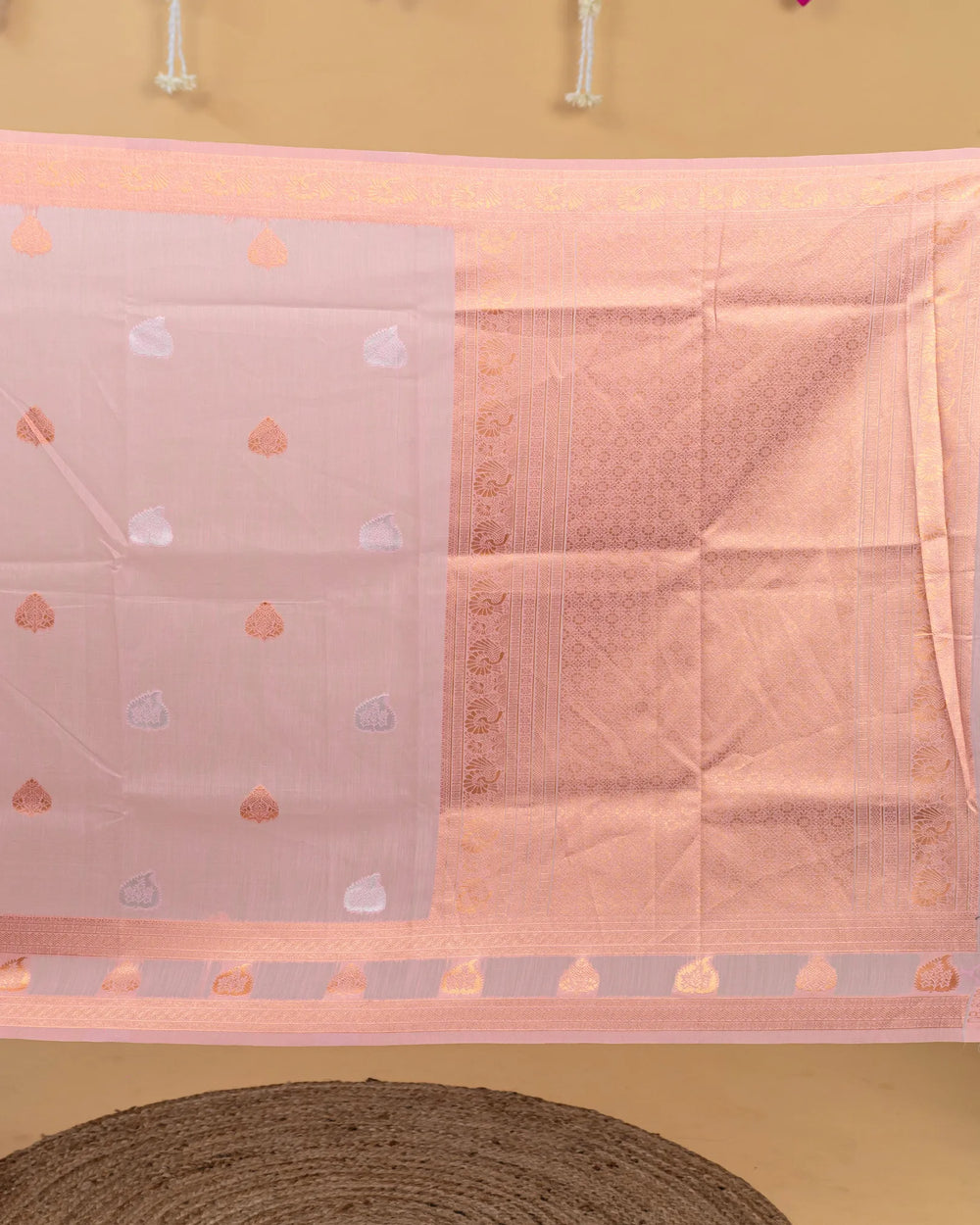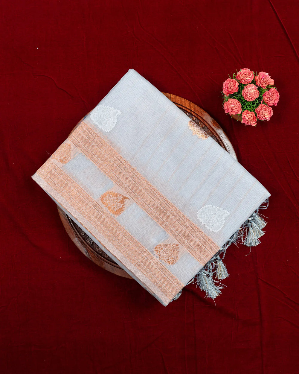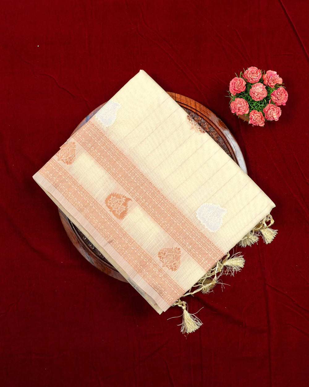 | Description | Elegant linen saree featuring intricate copper and silver butta motifs across the body, offering a subtle shimmer and timeless appeal. Perfect for festive gatherings and sophisticated everyday wear. |