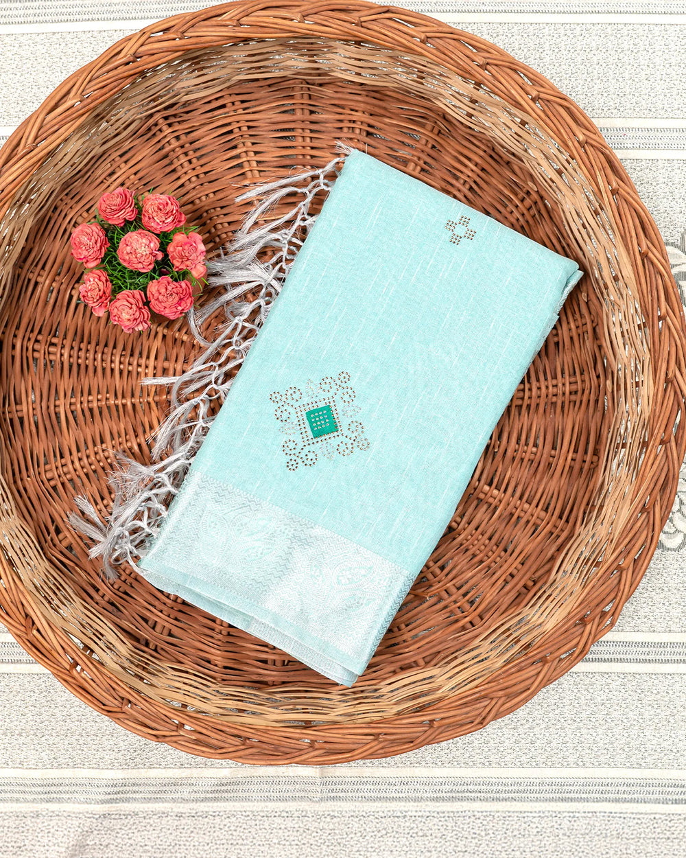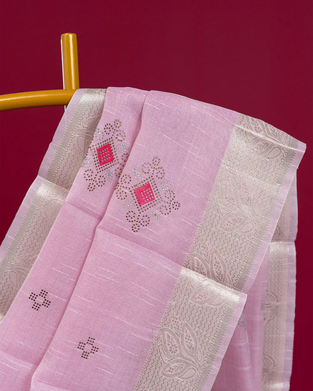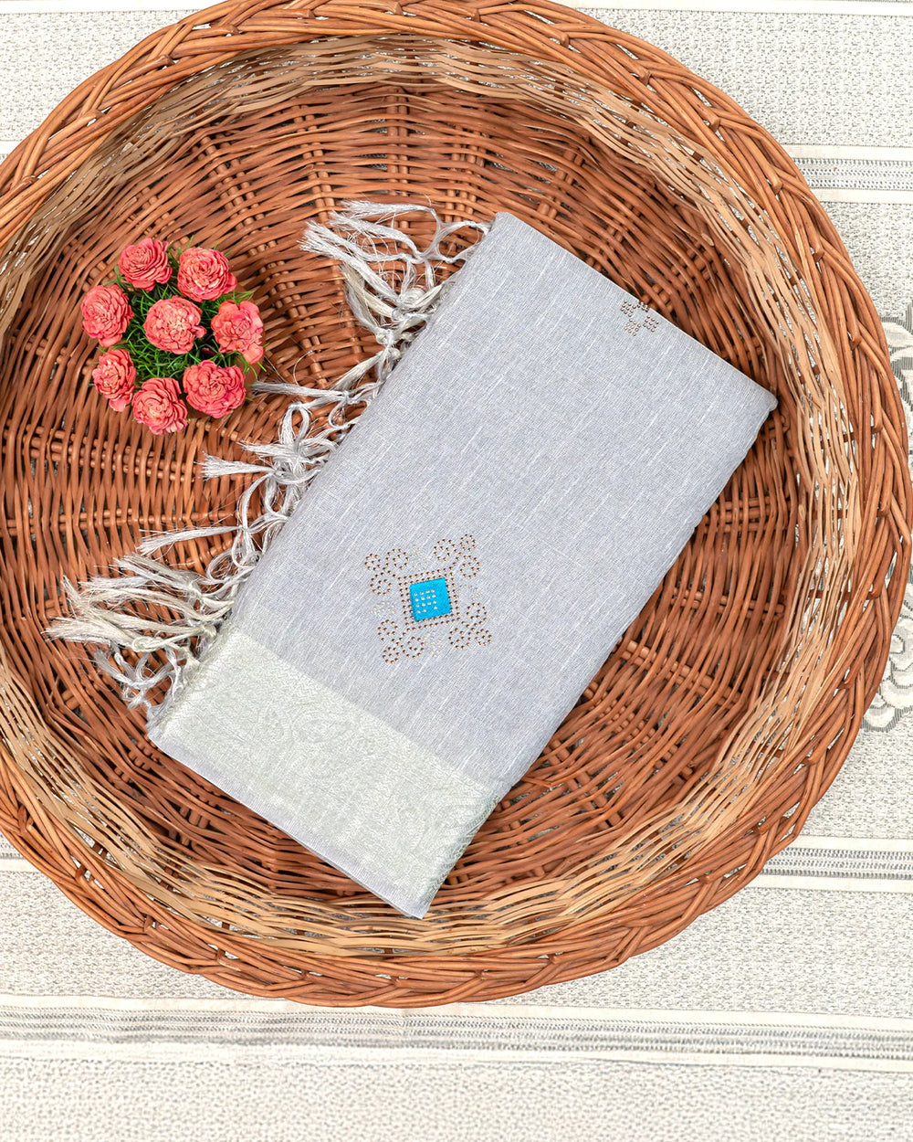 | Style | Elegant linen saree with fine multi-stone accents and a silver-bordered blouse for a refined, festive look. |