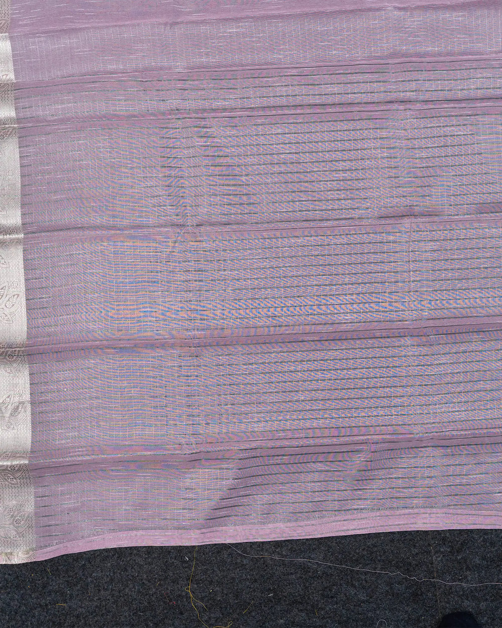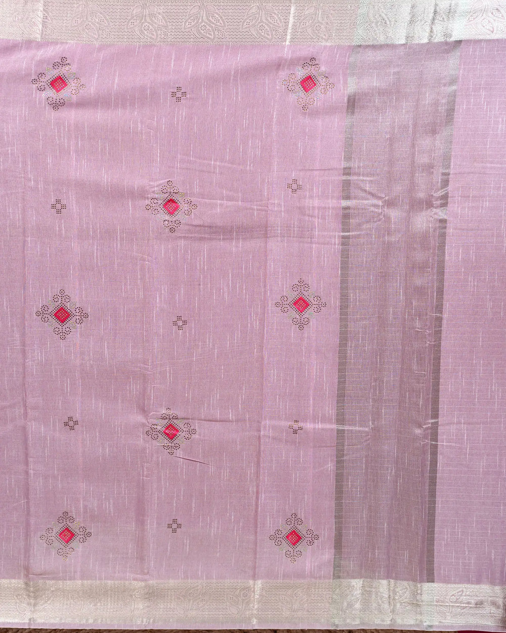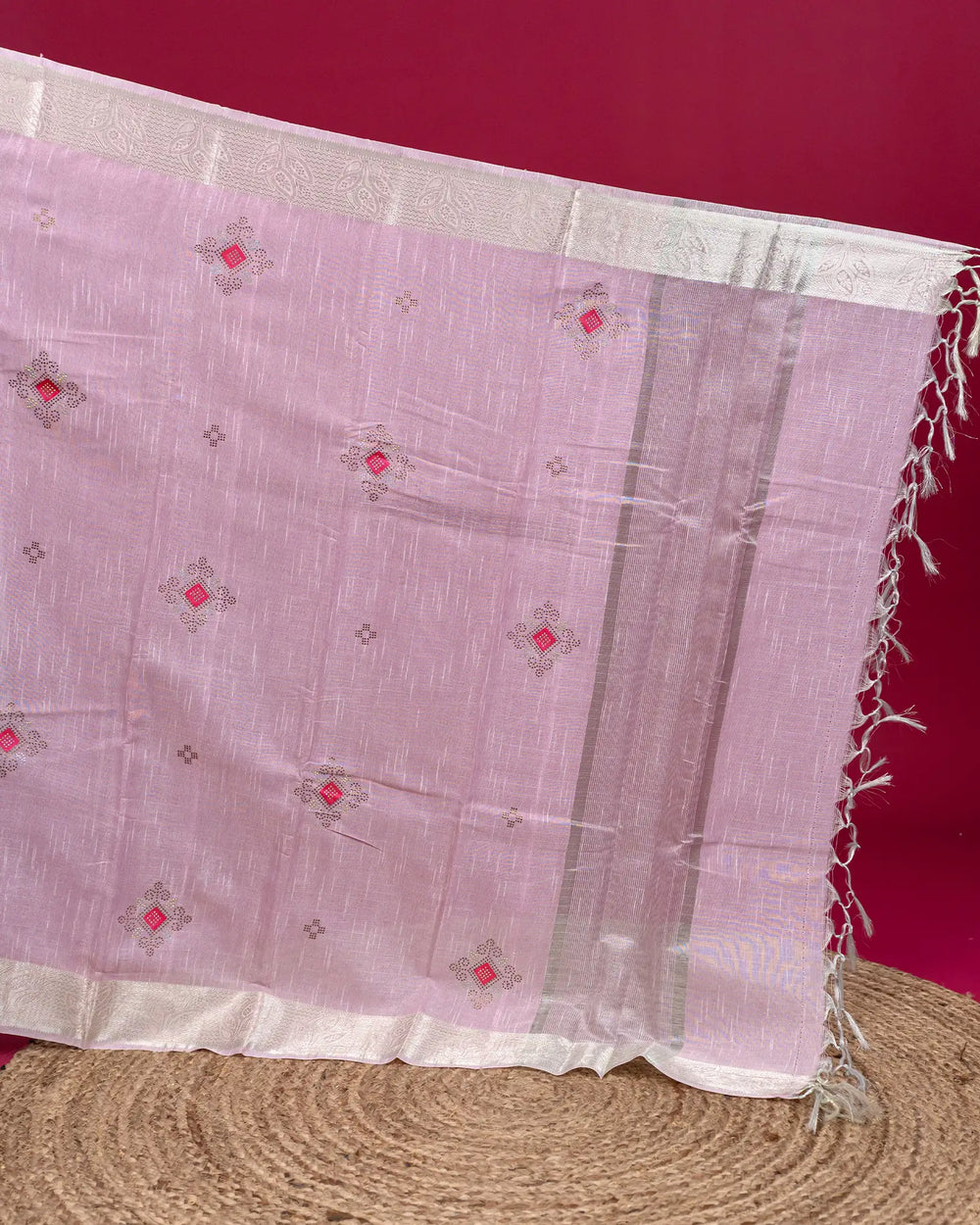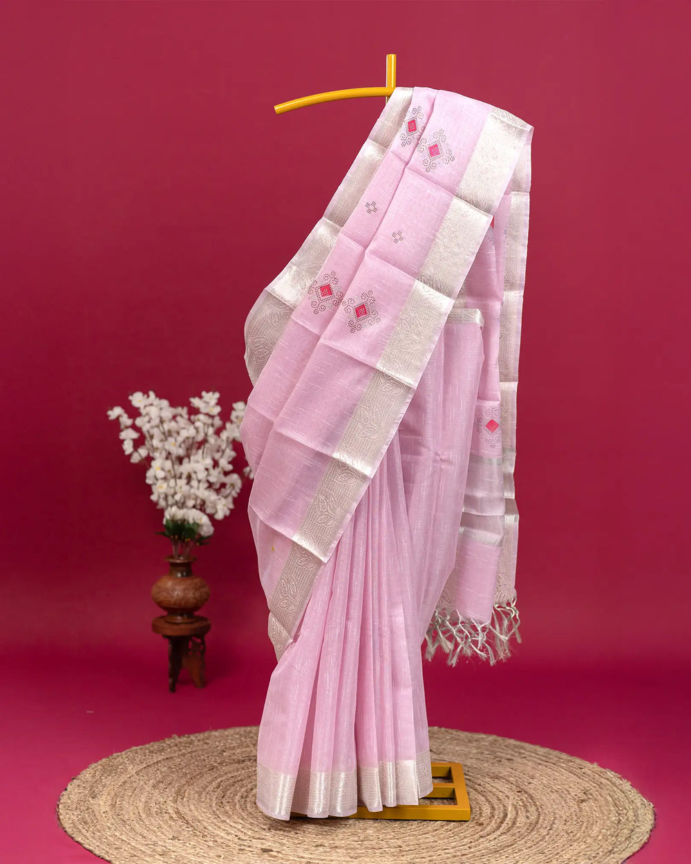 | Style | Elegant linen saree with fine multi-stone accents and a silver-bordered blouse for a refined, festive look. |