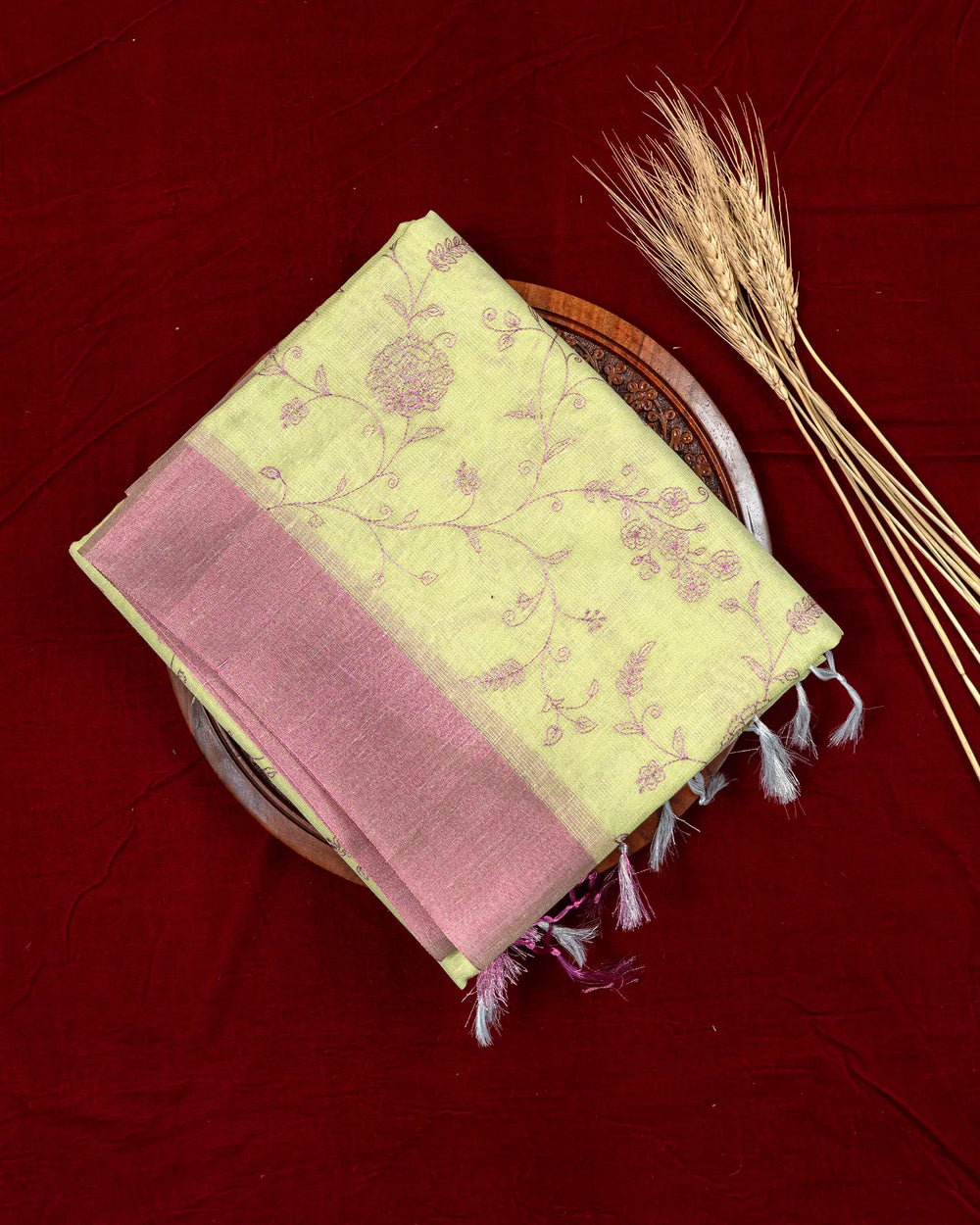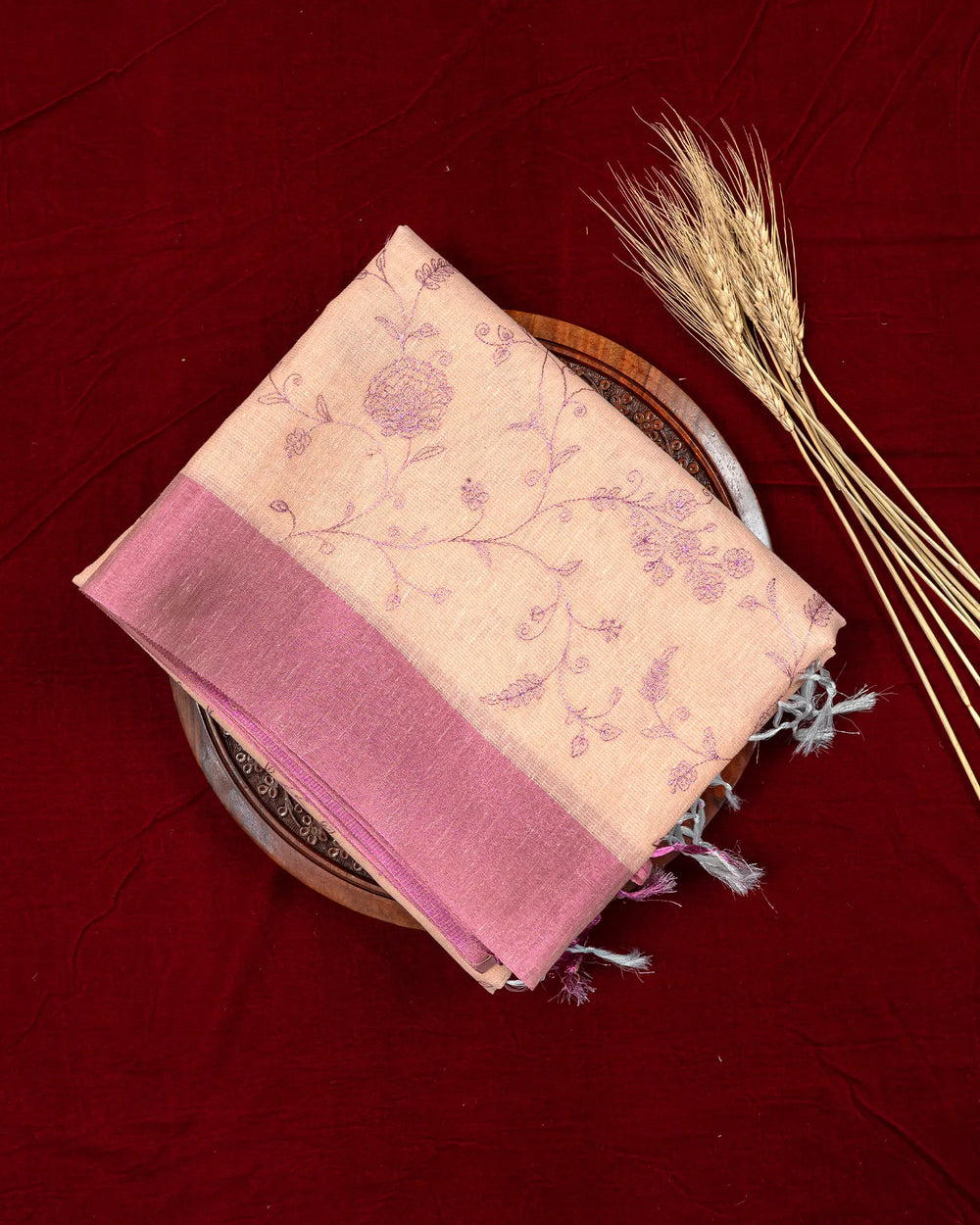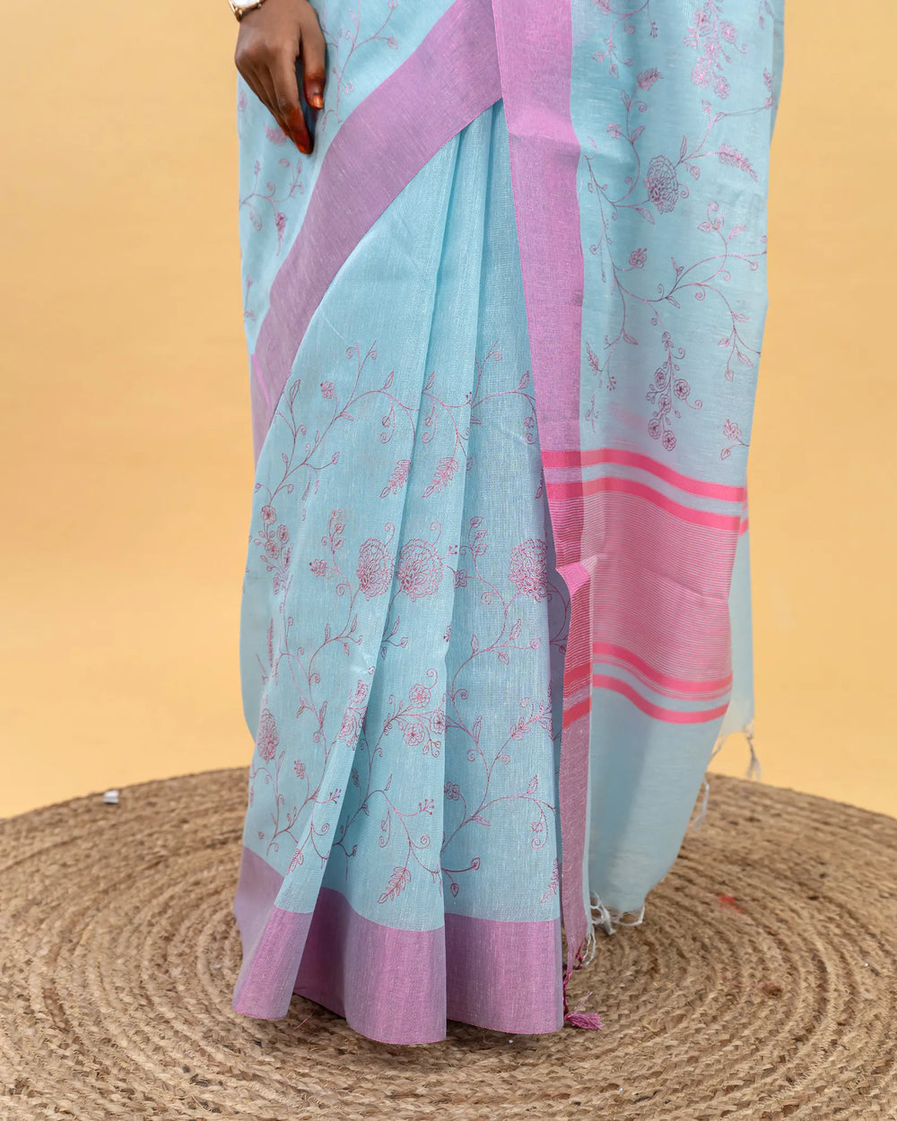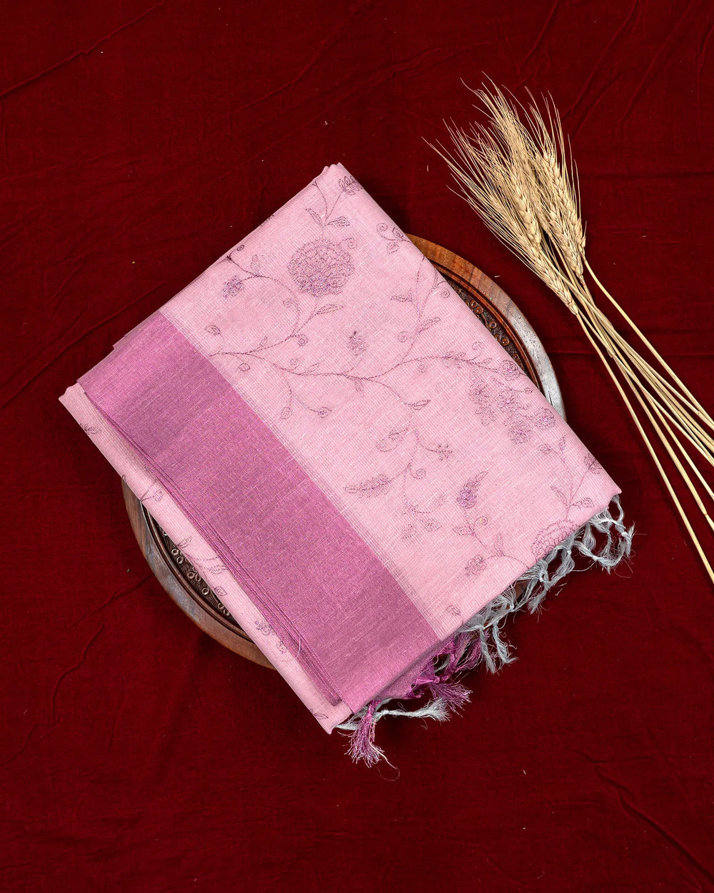 | Description | Beautiful tissue linen saree adorned with delicate pink embroidery all over, blending understated elegance with a pop of subtle color. A graceful choice for festive gatherings, casual celebrations, and refined everyday wear. |