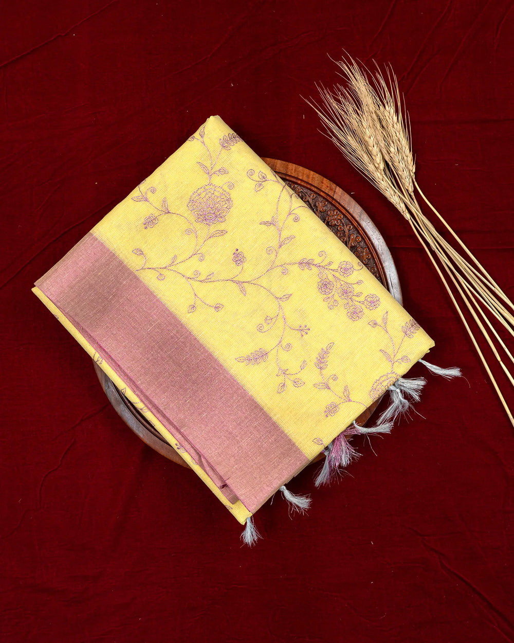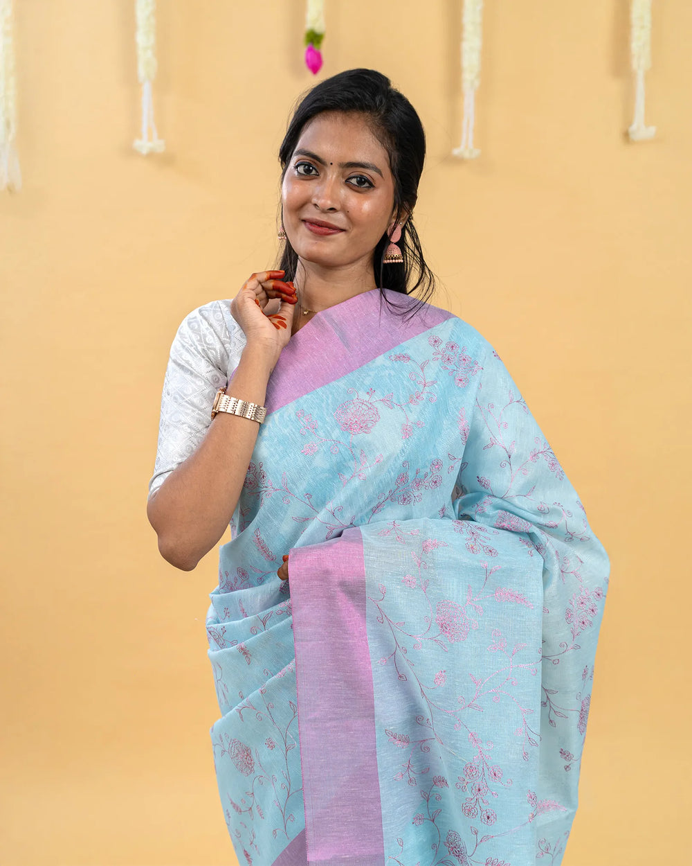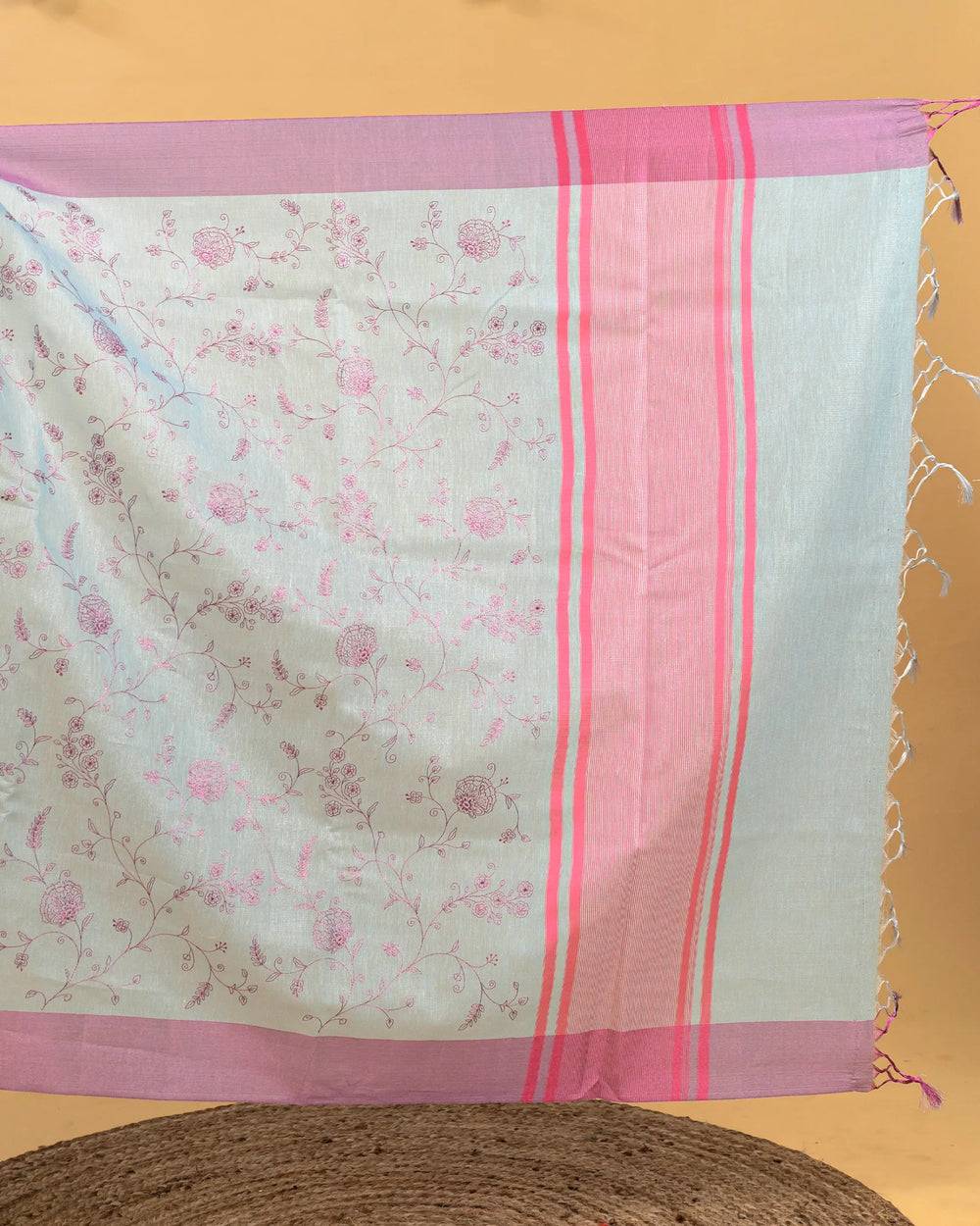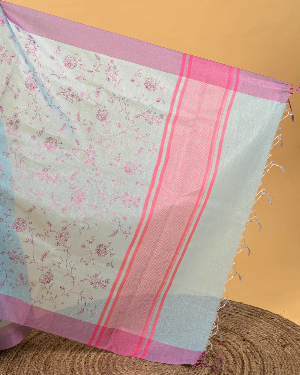 | Description | Beautiful tissue linen saree adorned with delicate pink embroidery all over, blending understated elegance with a pop of subtle color. A graceful choice for festive gatherings, casual celebrations, and refined everyday wear. |