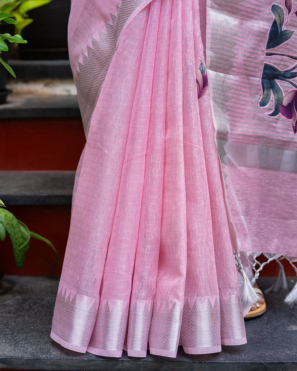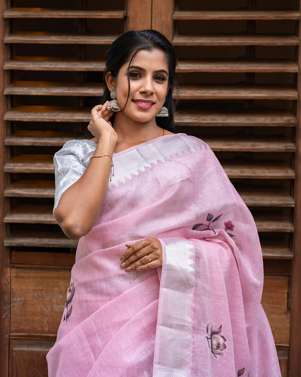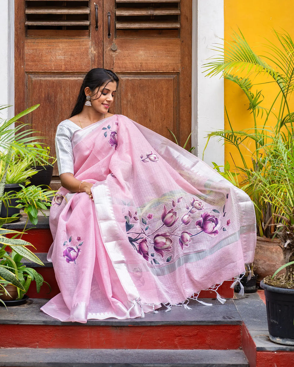 | Description | Elegant linen saree featuring beautiful sticker print work that adds a modern artistic touch to the classic linen texture. |