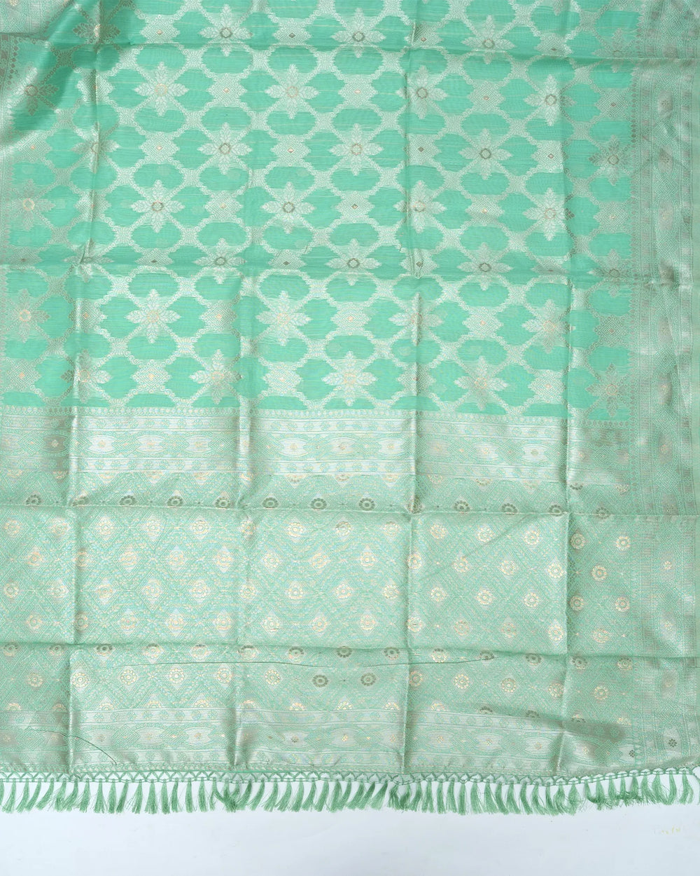 | Style | Traditional thread butta artistry combined with shimmering neem zari creates a rich and timeless festive aesthetic |