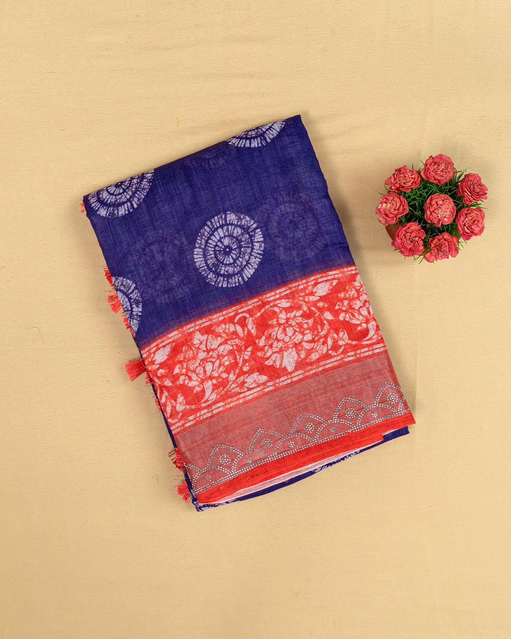| Description | Elegant linen saree featuring traditional Bandhini print enhanced with sparkling border stone work. Perfect for weddings, festive gatherings, and cultural occasions where heritage artistry meets subtle glamour. |