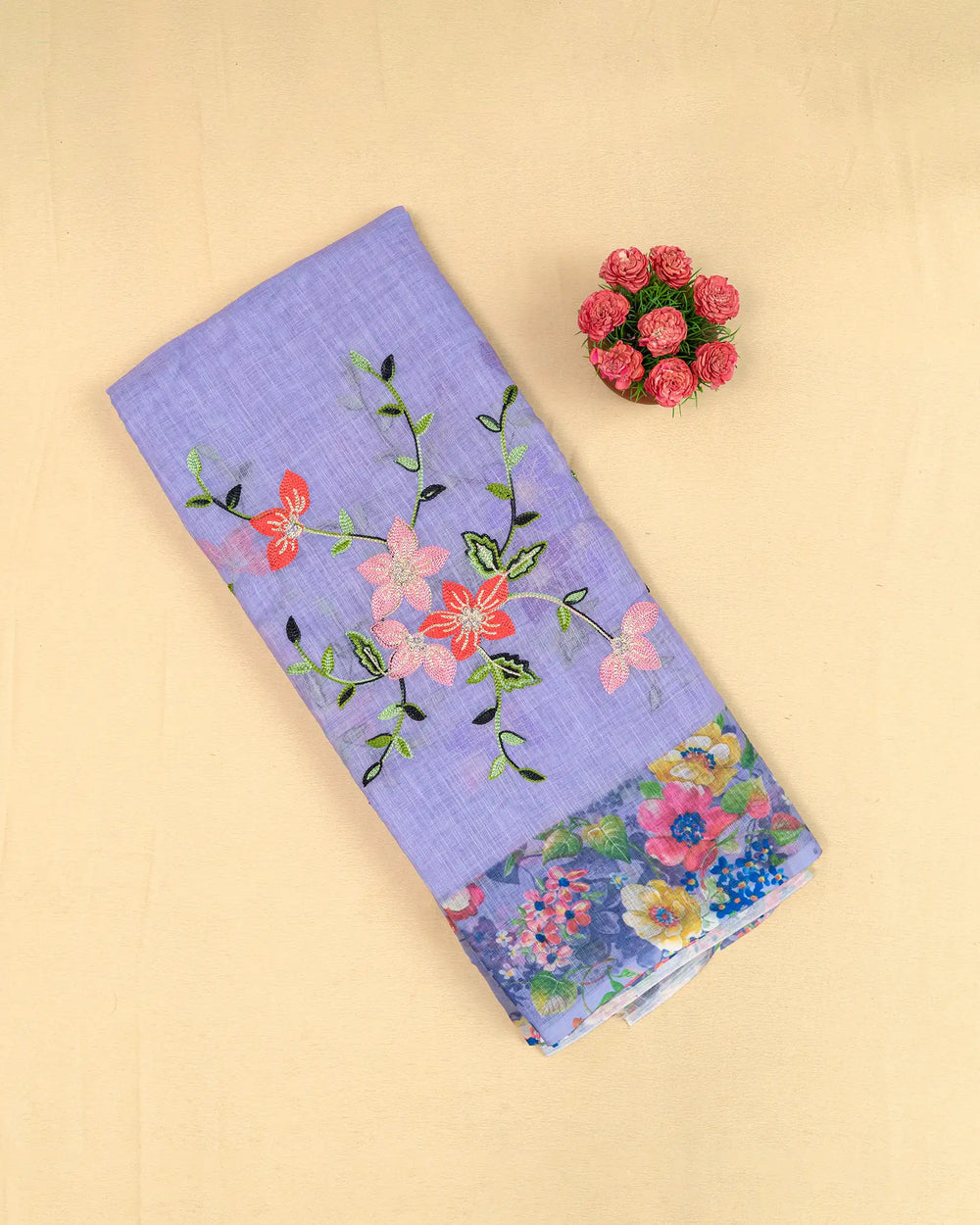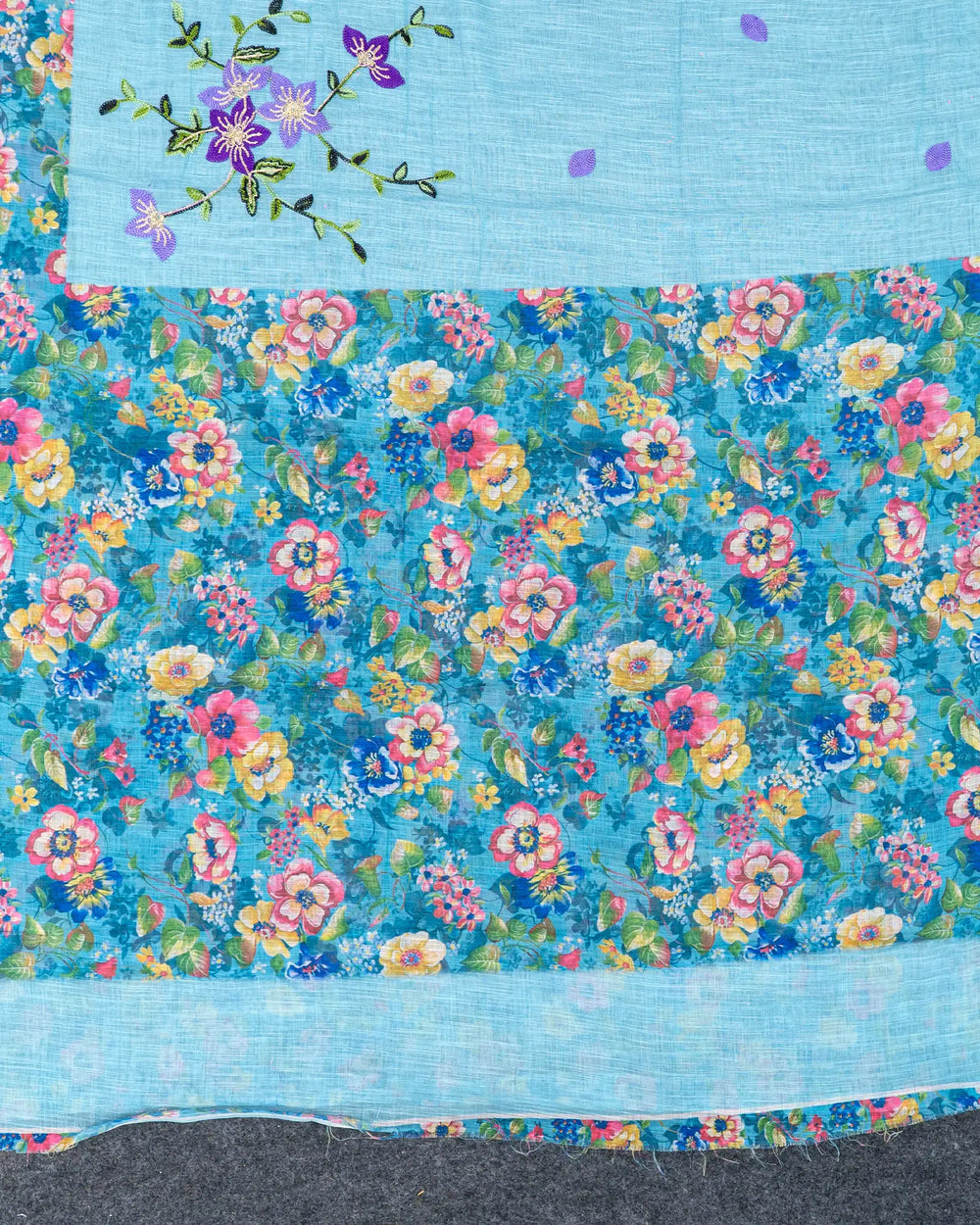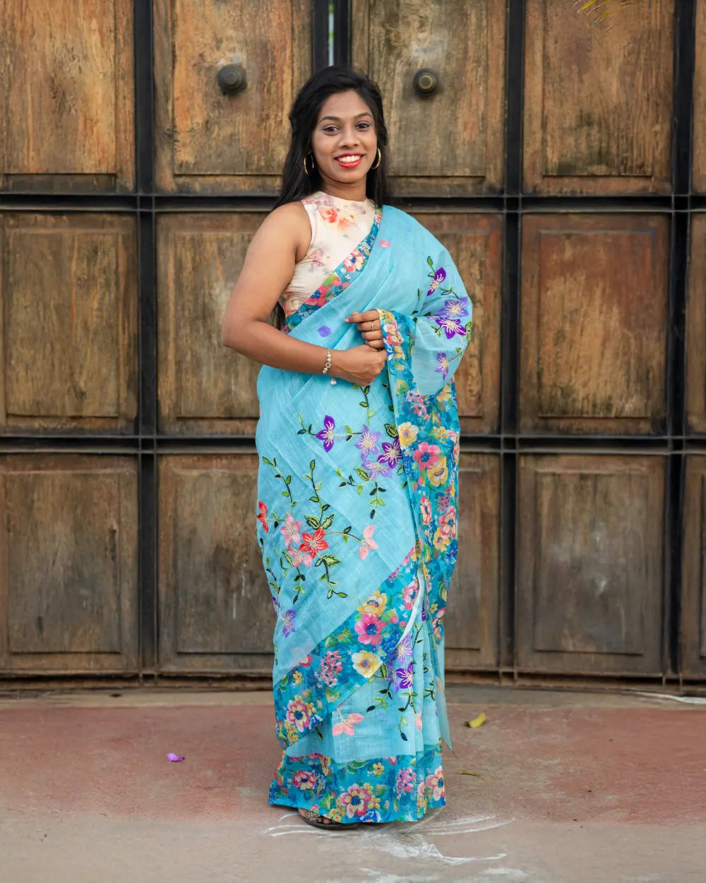 | Description | Elegant linen saree featuring colourful embroidery and chikku work throughout the body, combining traditional craftsmanship with modern design. Perfect for festive and casual occasions. |