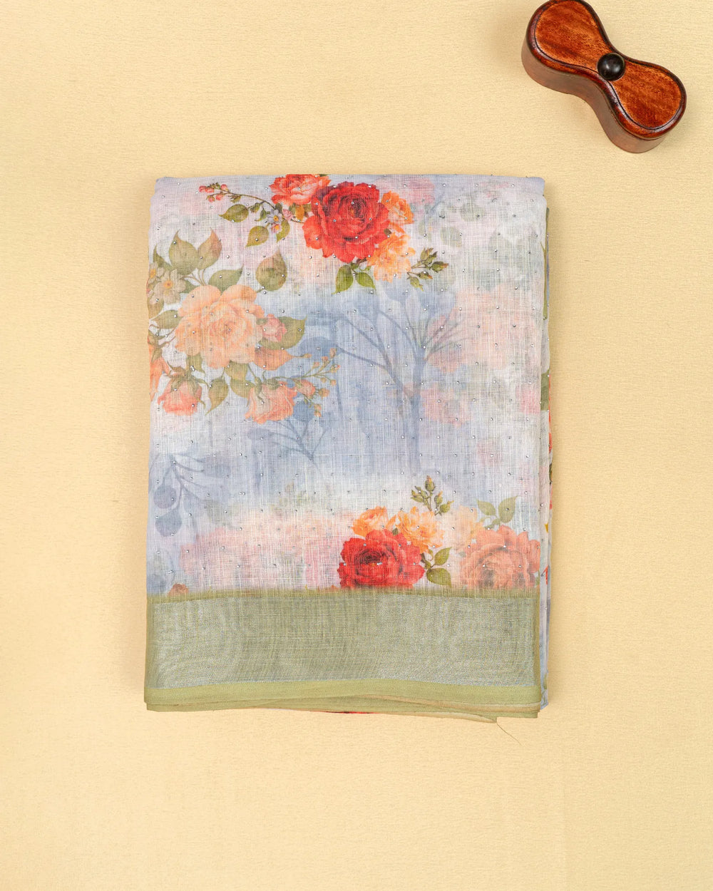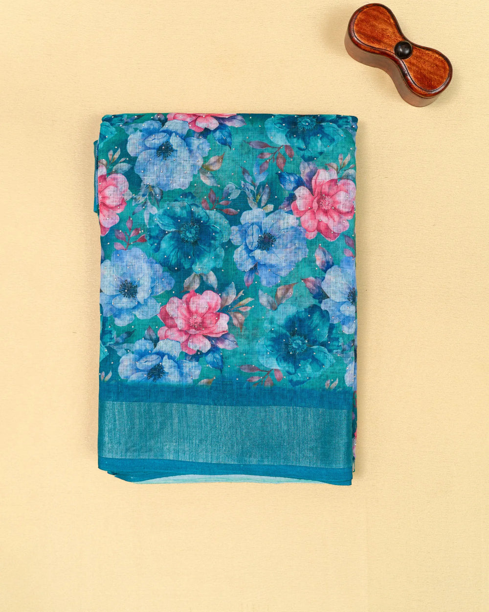 | Style | A stunning fusion of traditional linen with sparkling stones and modern digital print blouse, perfect for adding glamour to any festive occasion. |