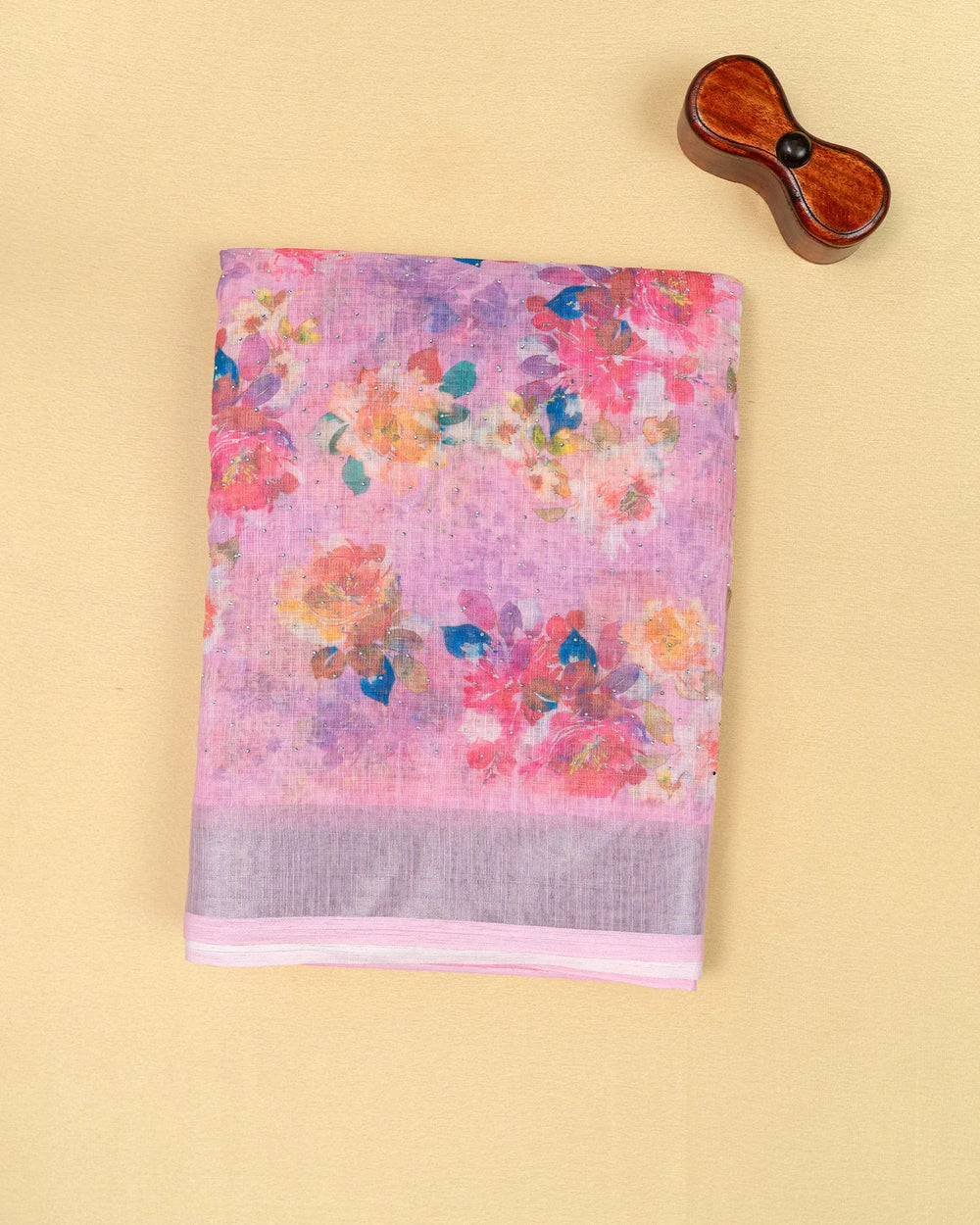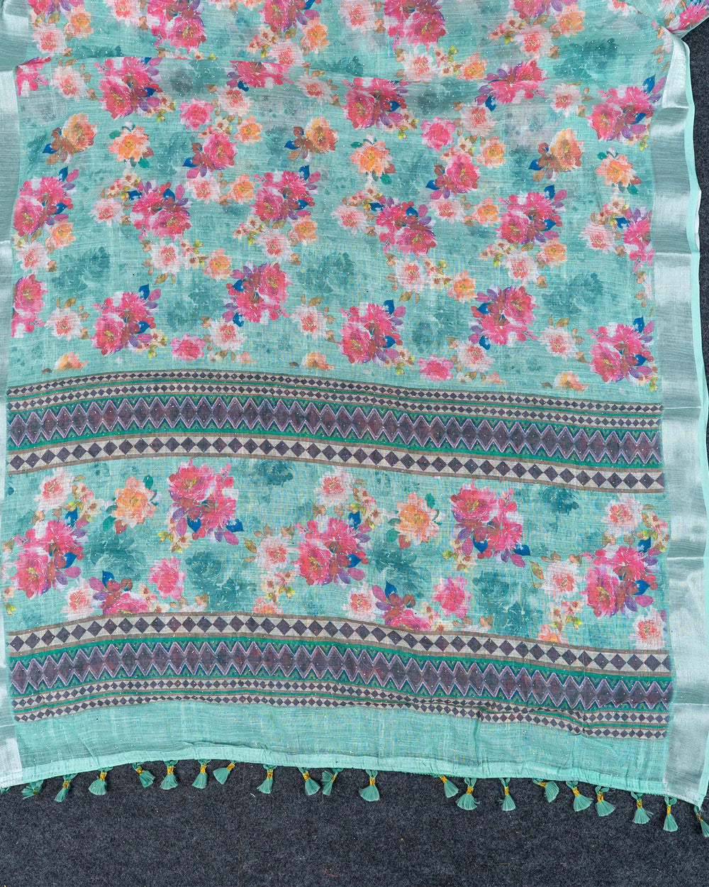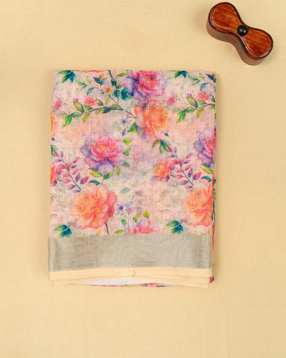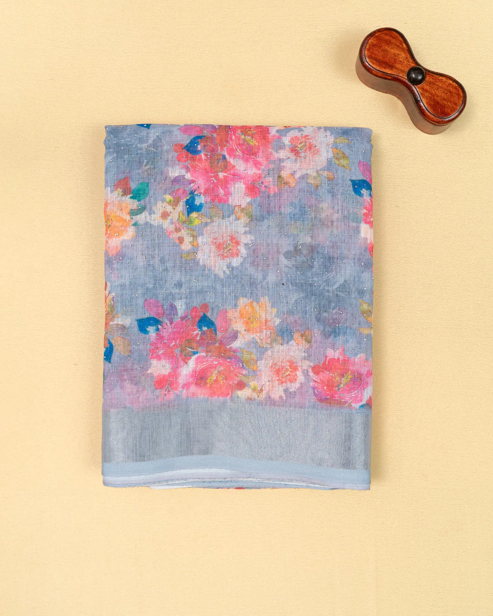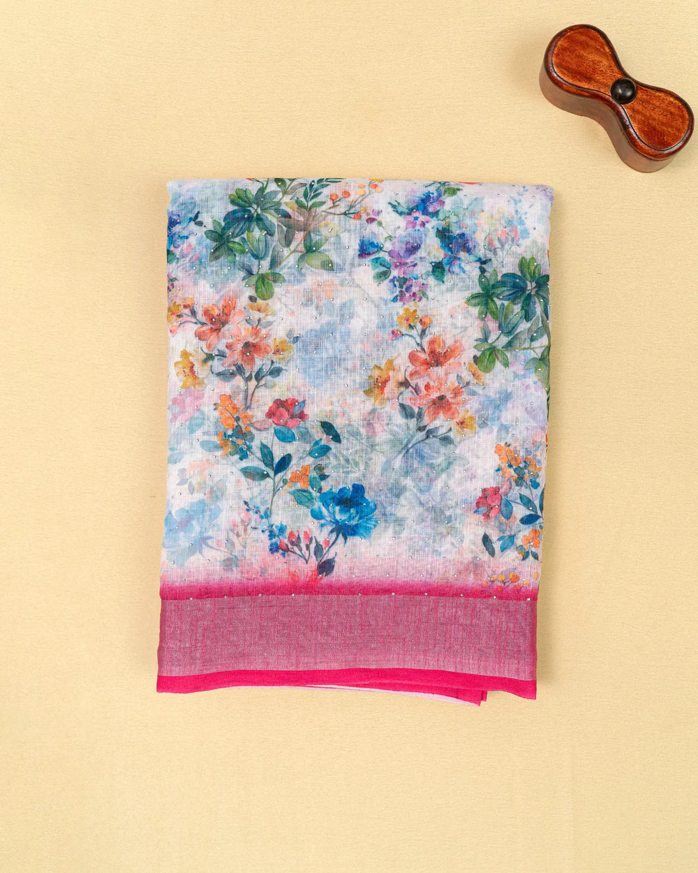 | Style | A stunning fusion of traditional linen with sparkling stones and modern digital print blouse, perfect for adding glamour to any festive occasion. |