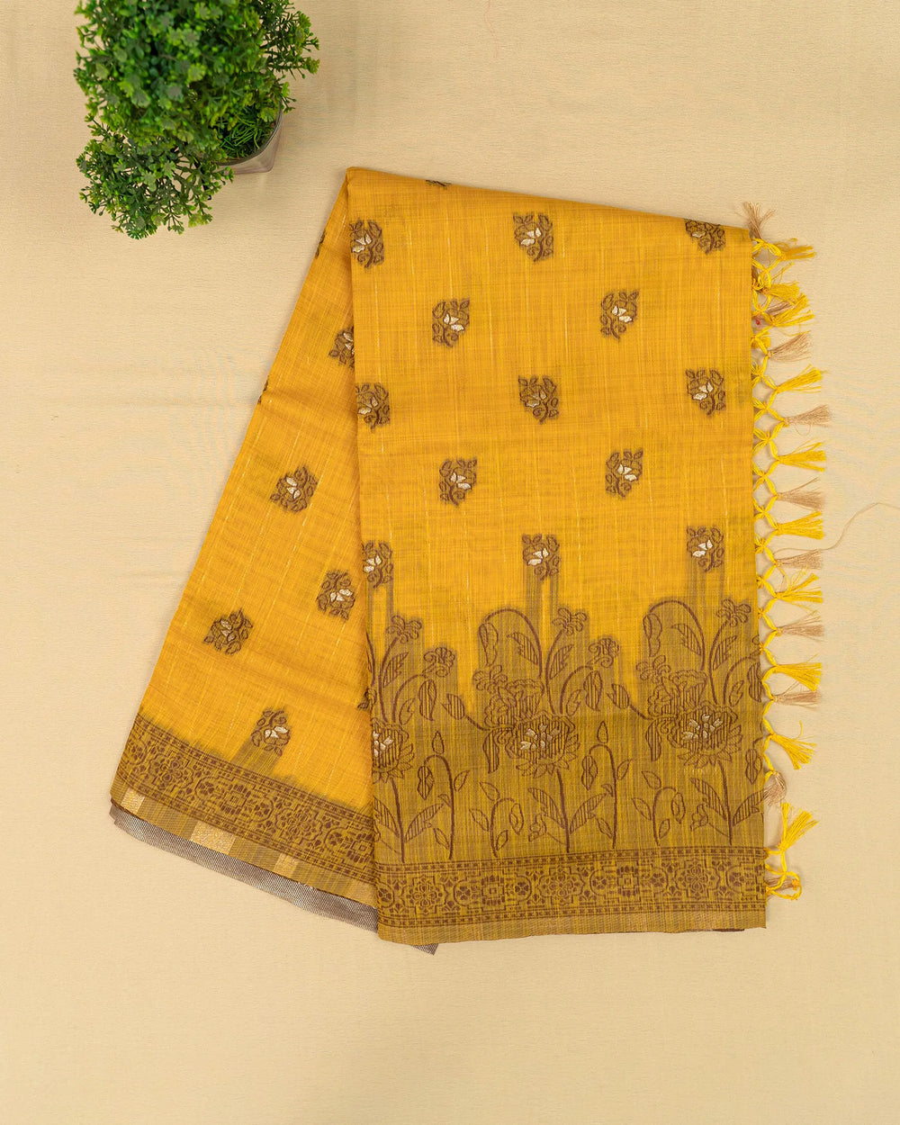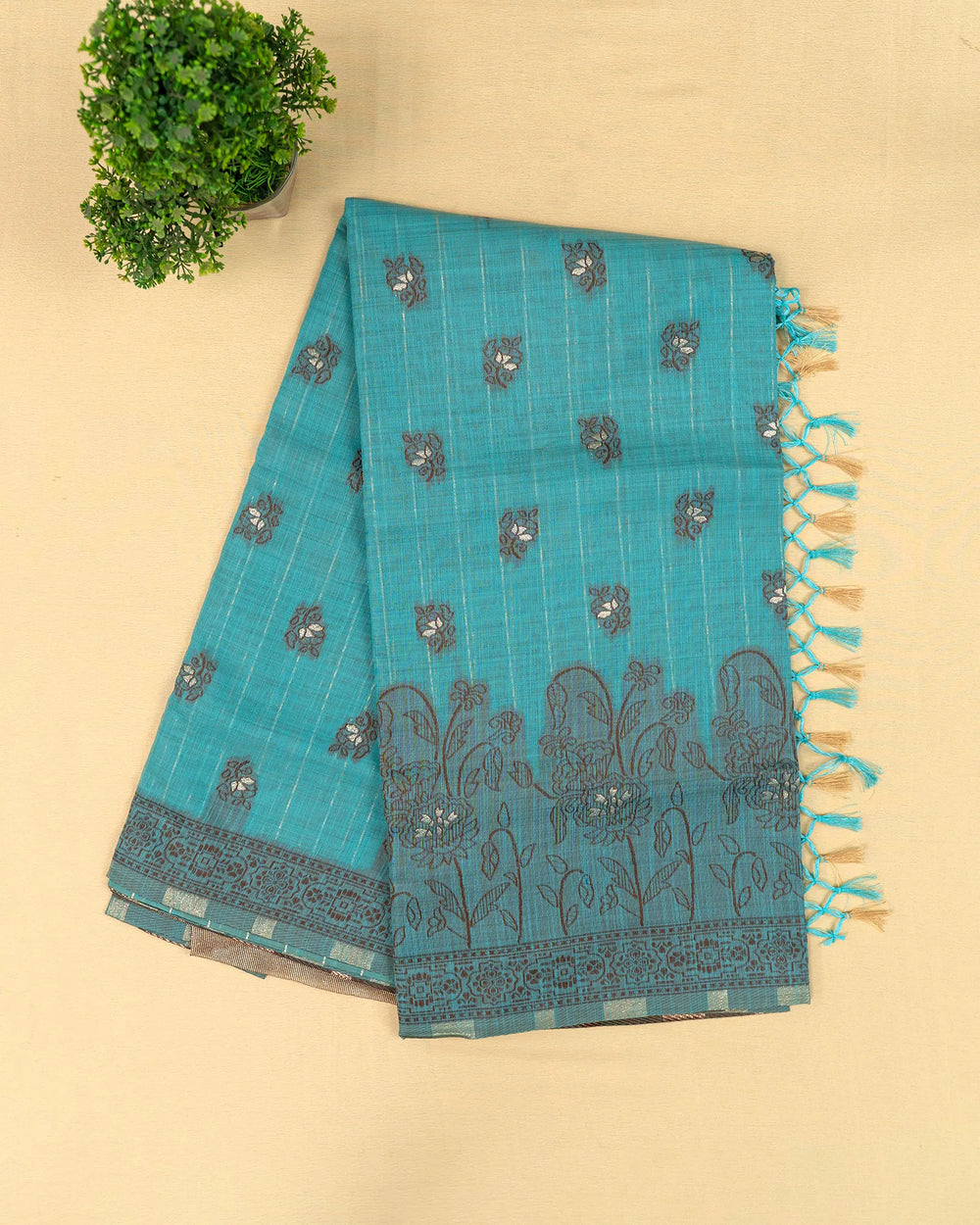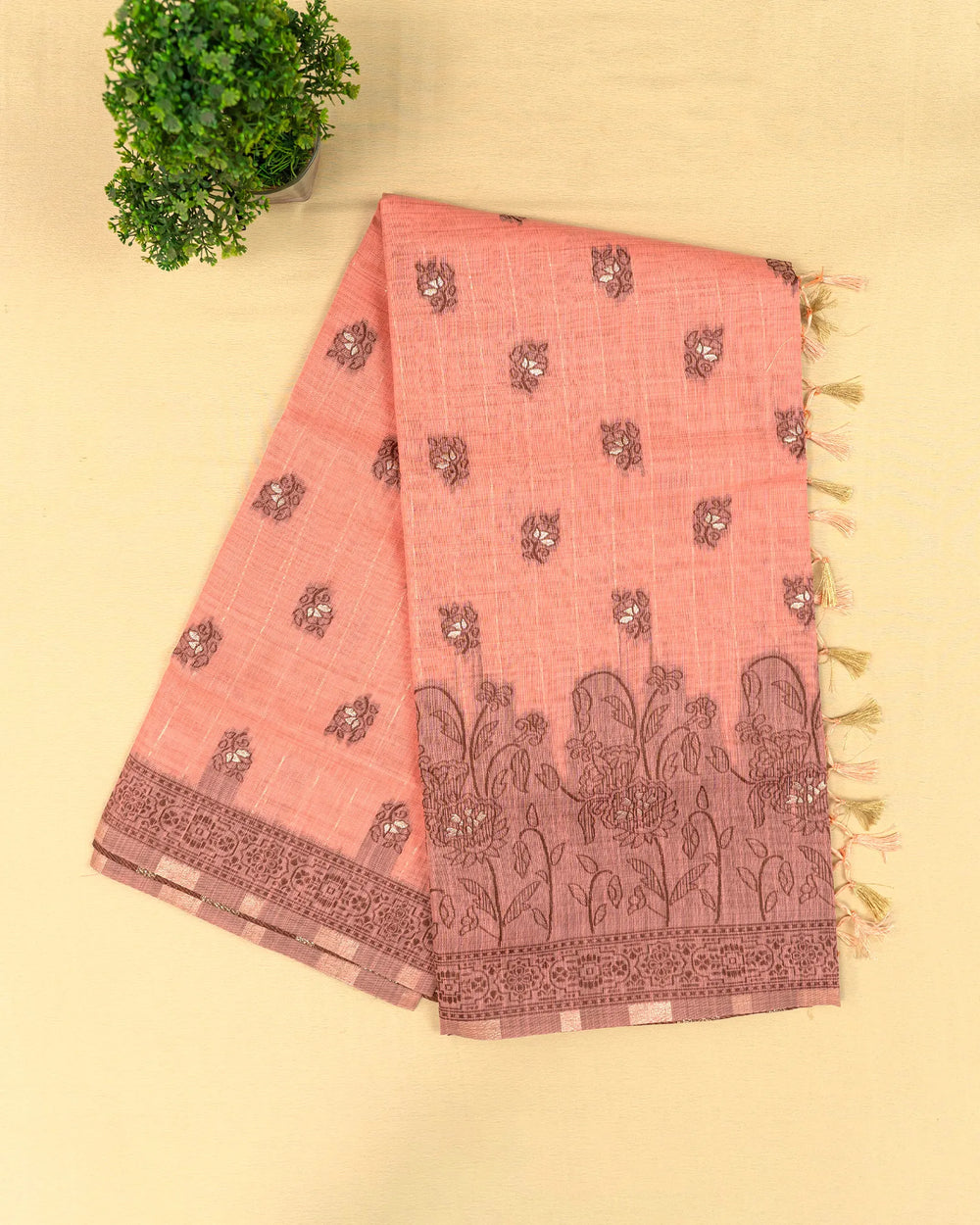 | Description | Classic linen saree enriched with shimmering zari lines and delicate coffee butta motifs, offering a perfect mix of traditional artistry and subtle modern elegance. Ideal for festive occasions, casual gatherings, and graceful everyday wear. |