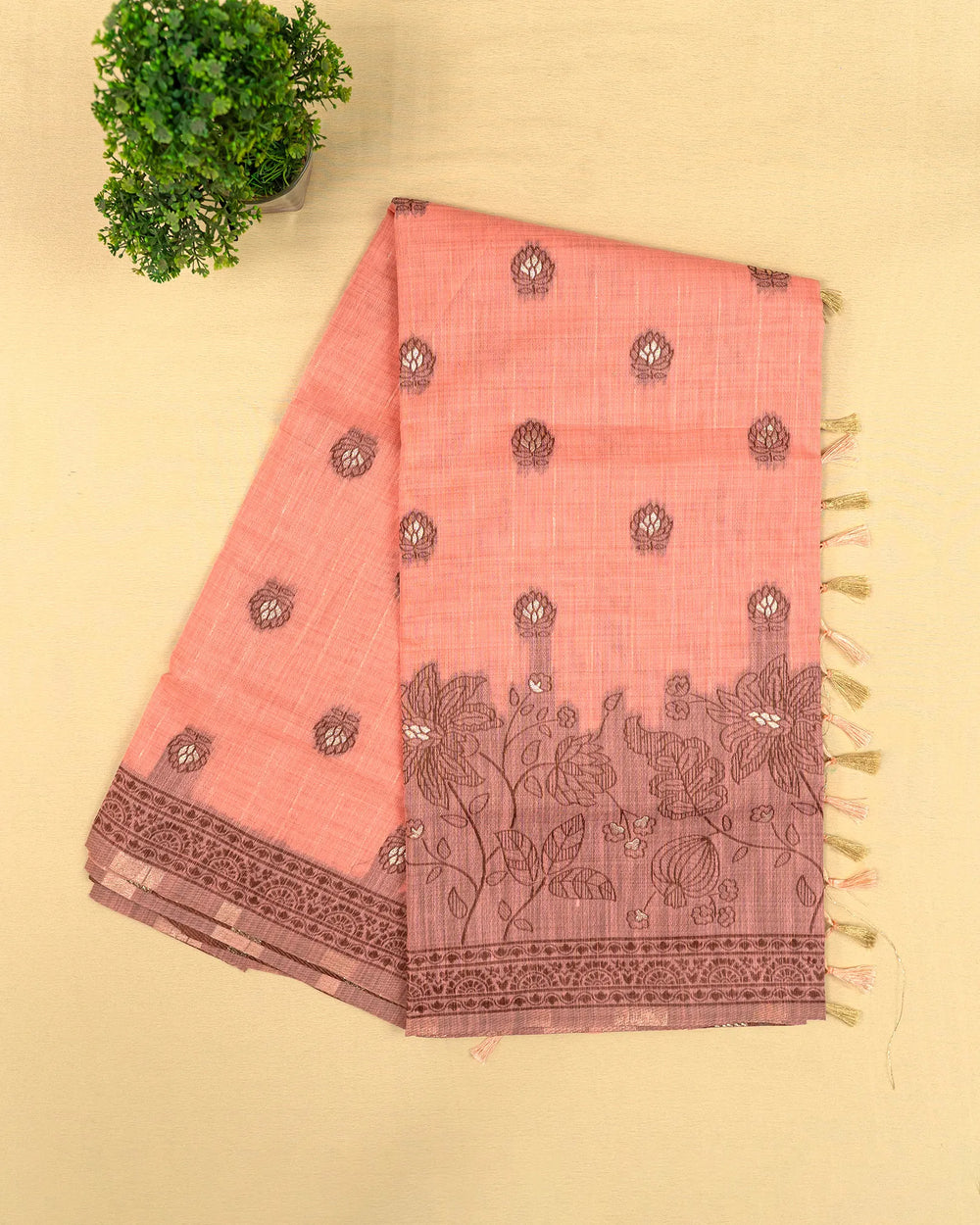 | Description | Classic linen saree enriched with shimmering zari lines and delicate coffee butta motifs, offering a perfect mix of traditional artistry and subtle modern elegance. Ideal for festive occasions, casual gatherings, and graceful everyday wear. |