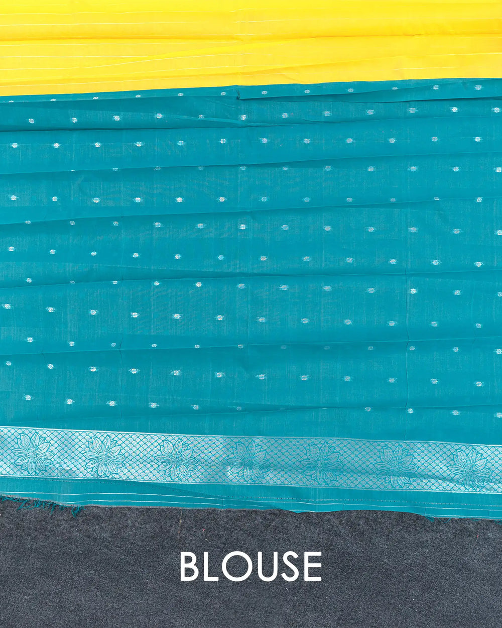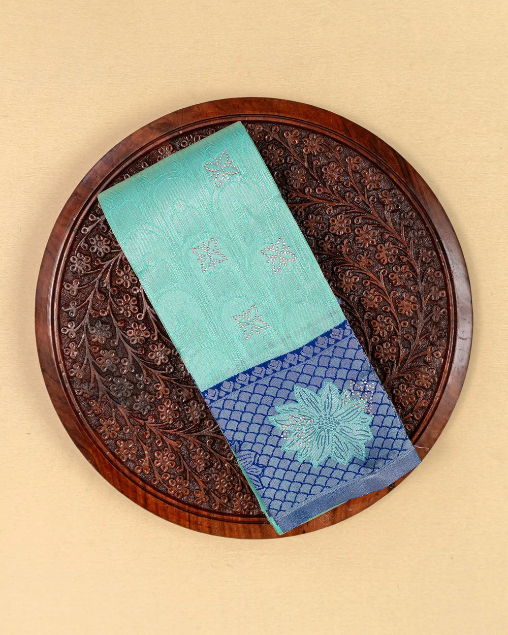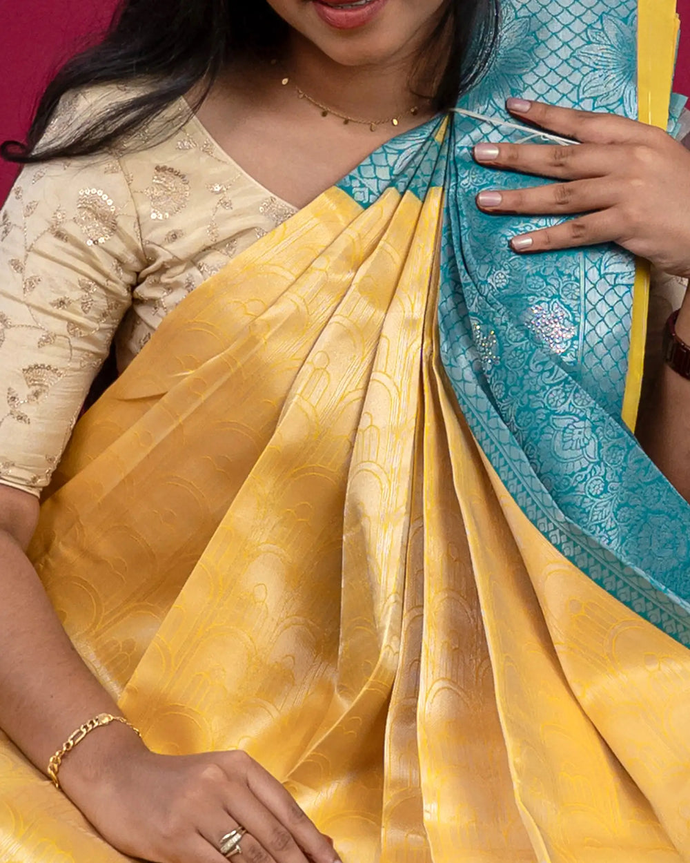 | Blouse | Contrast blouse with silver zari Butta, adding a regal touch to complement the multi-stone saree |