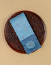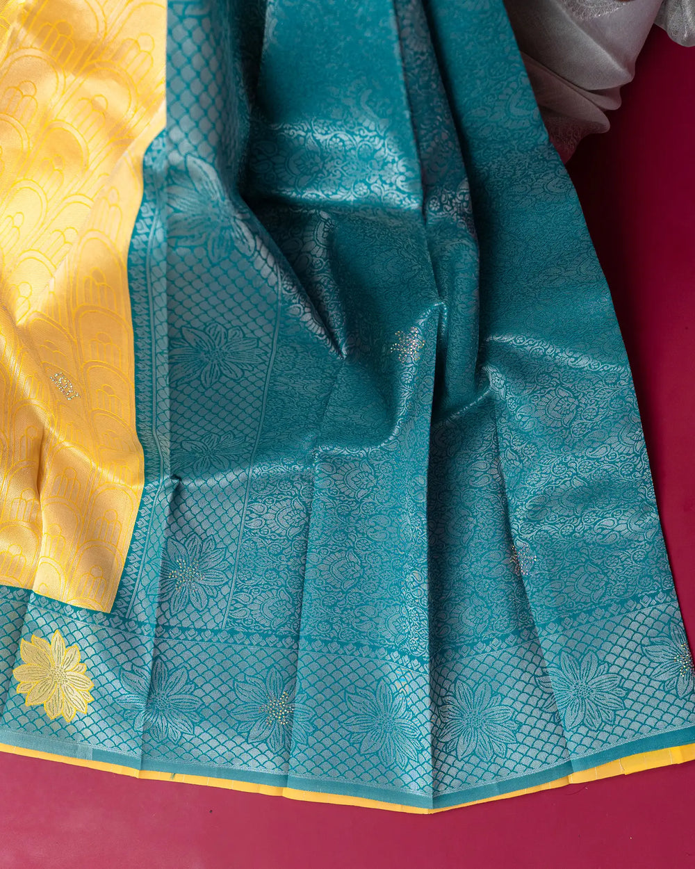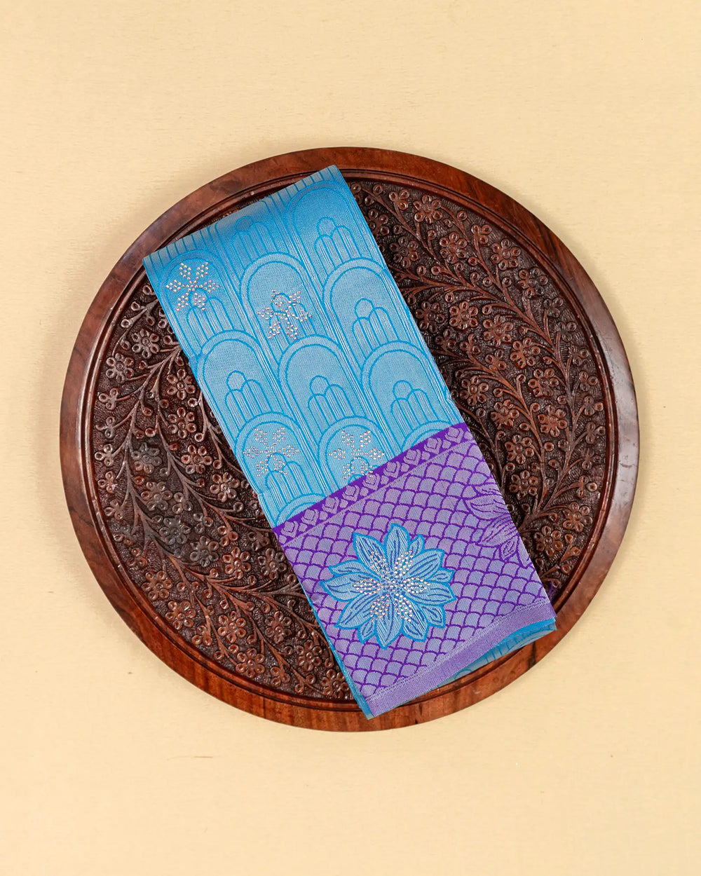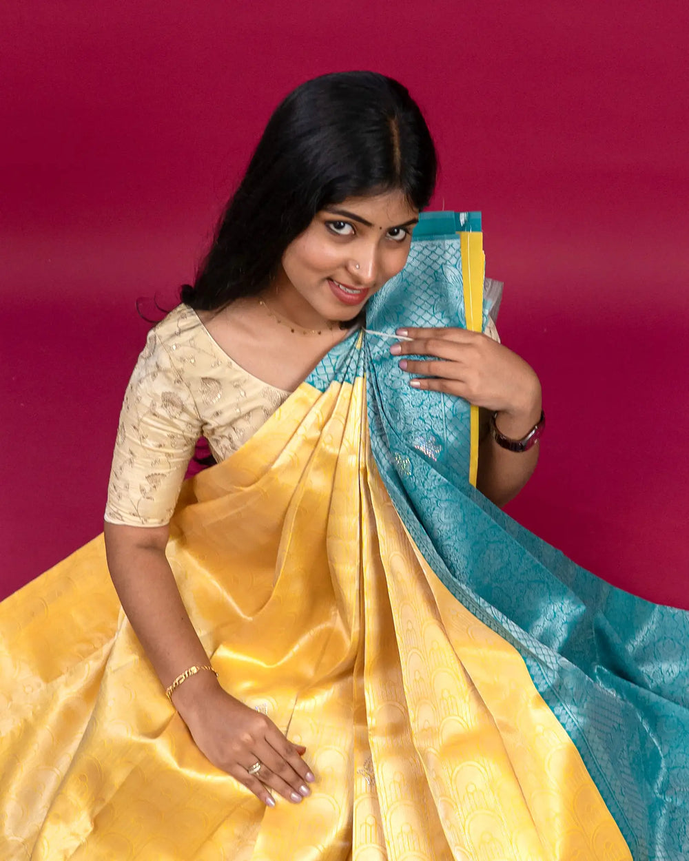 | Blouse | Contrast blouse with silver zari Butta, adding a regal touch to complement the multi-stone saree |