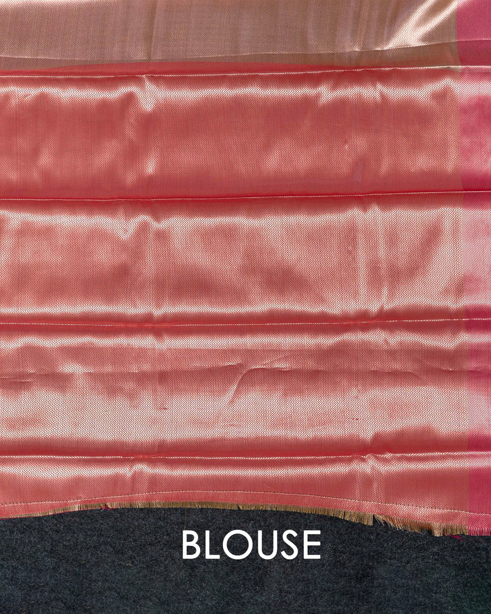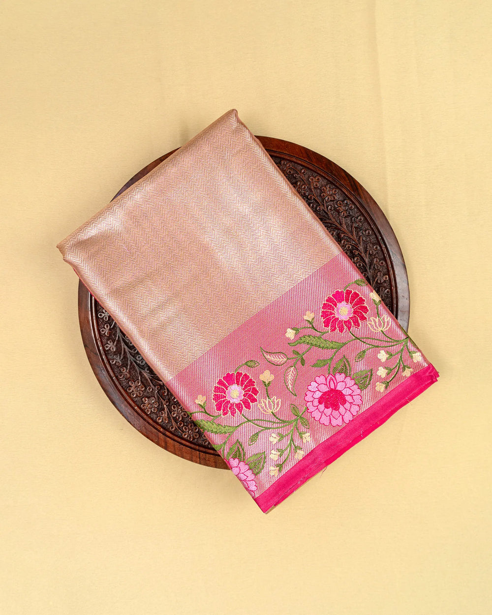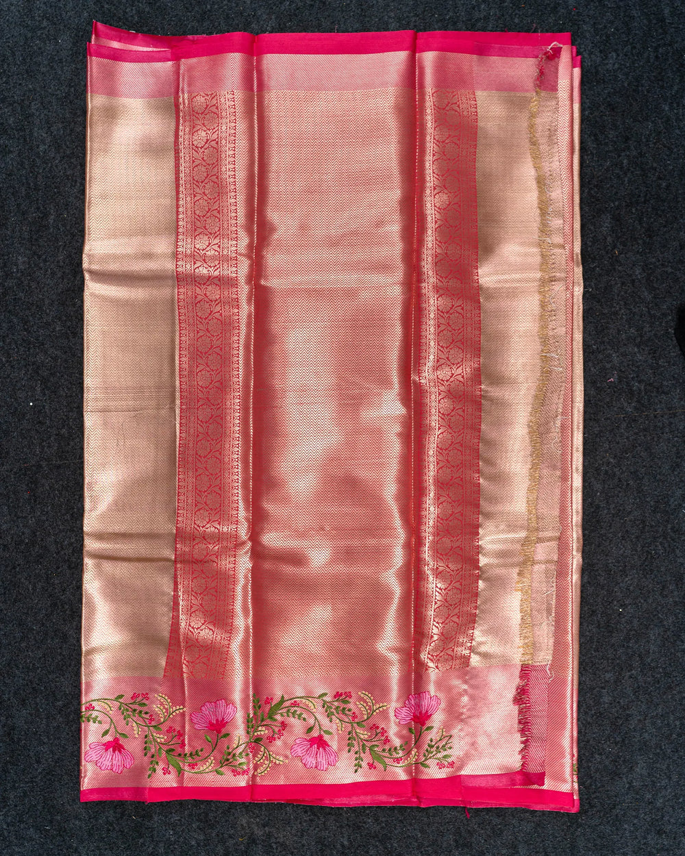 | Description | Stunning pink tissue saree featuring an elegant Zari body complemented by premium border work, giving it a rich and festive appeal for special occasions. |