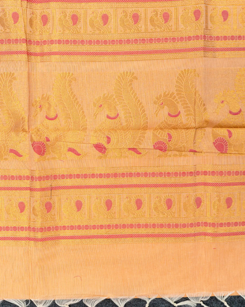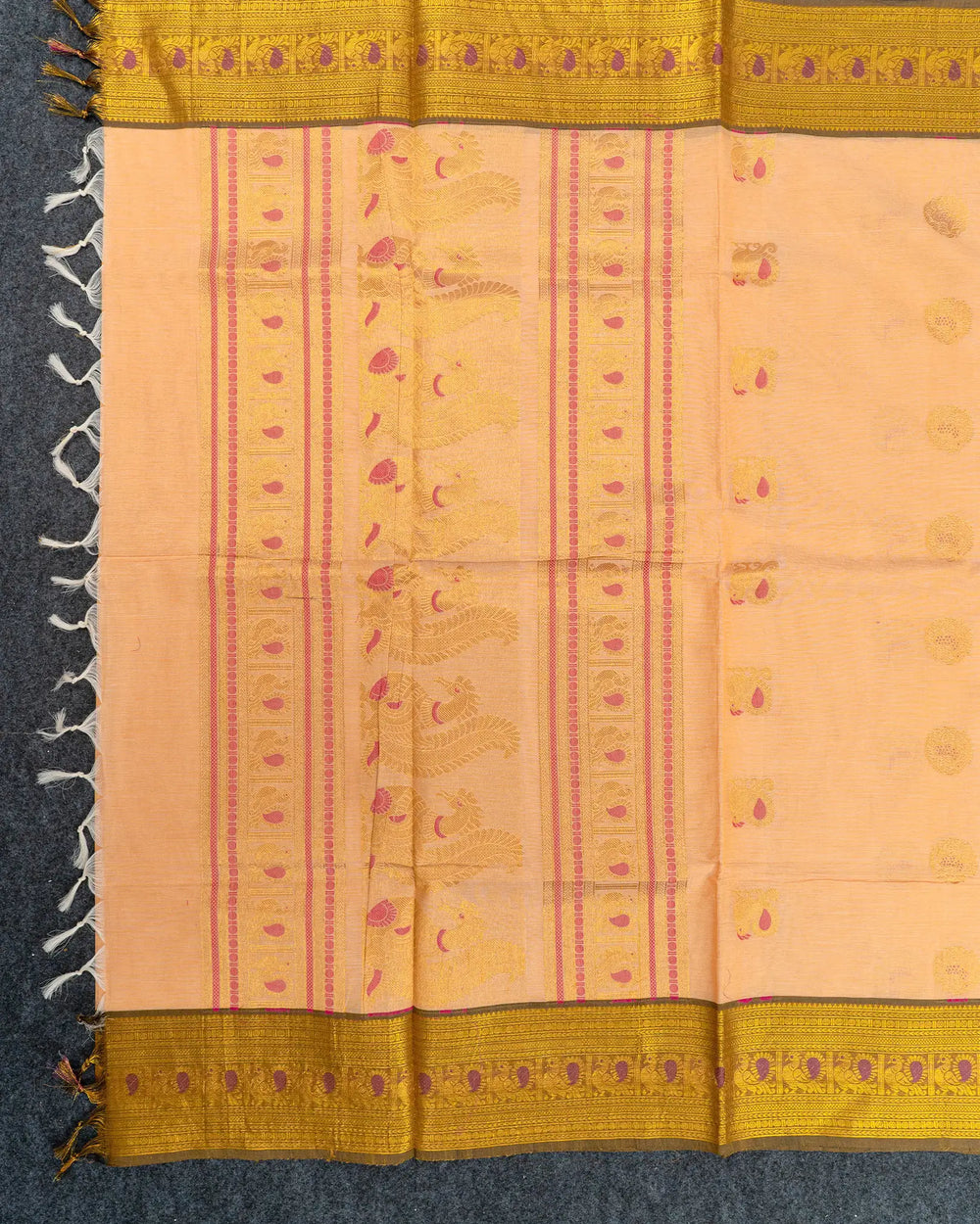 | Description | Elegant pure cotton saree featuring a delicate zari border and intricate Meena butta designs, offering a perfect blend of traditional charm and comfort. |