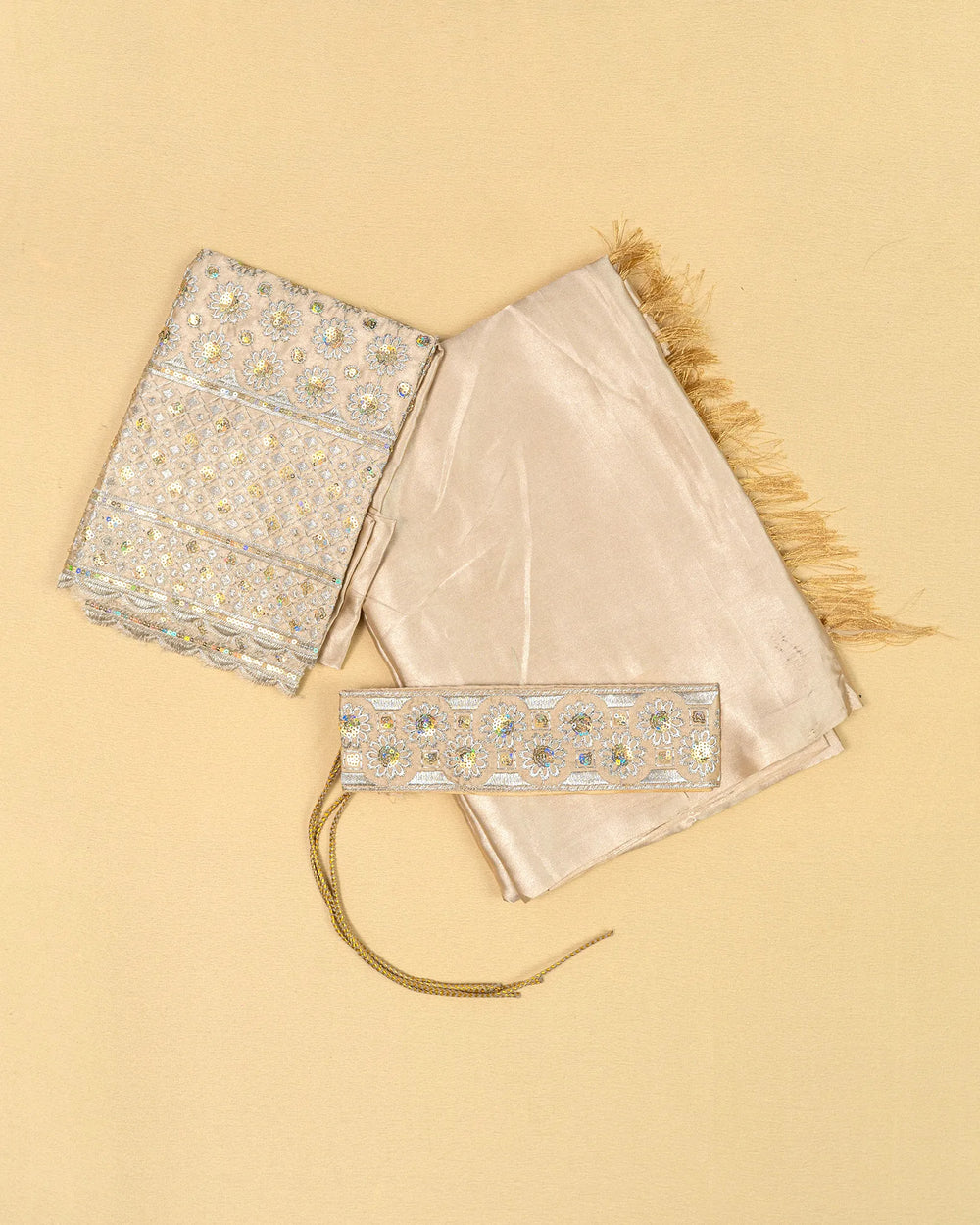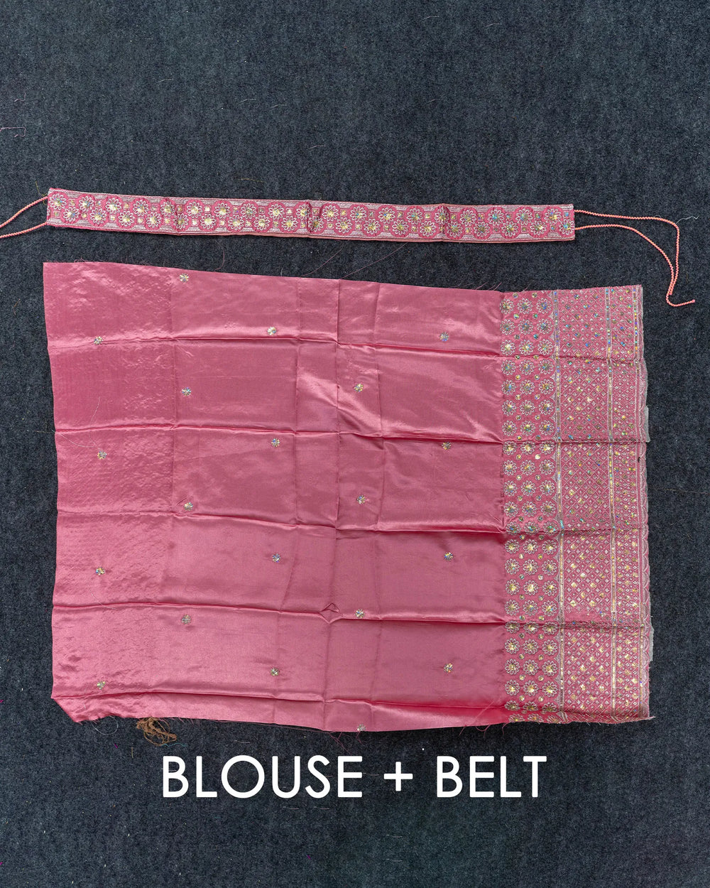 | Blouse | Separate blouse with exquisite work, designed to complement the saree’s elegant detailing. The belt adds a chic and fashionable touch to the overall design. |