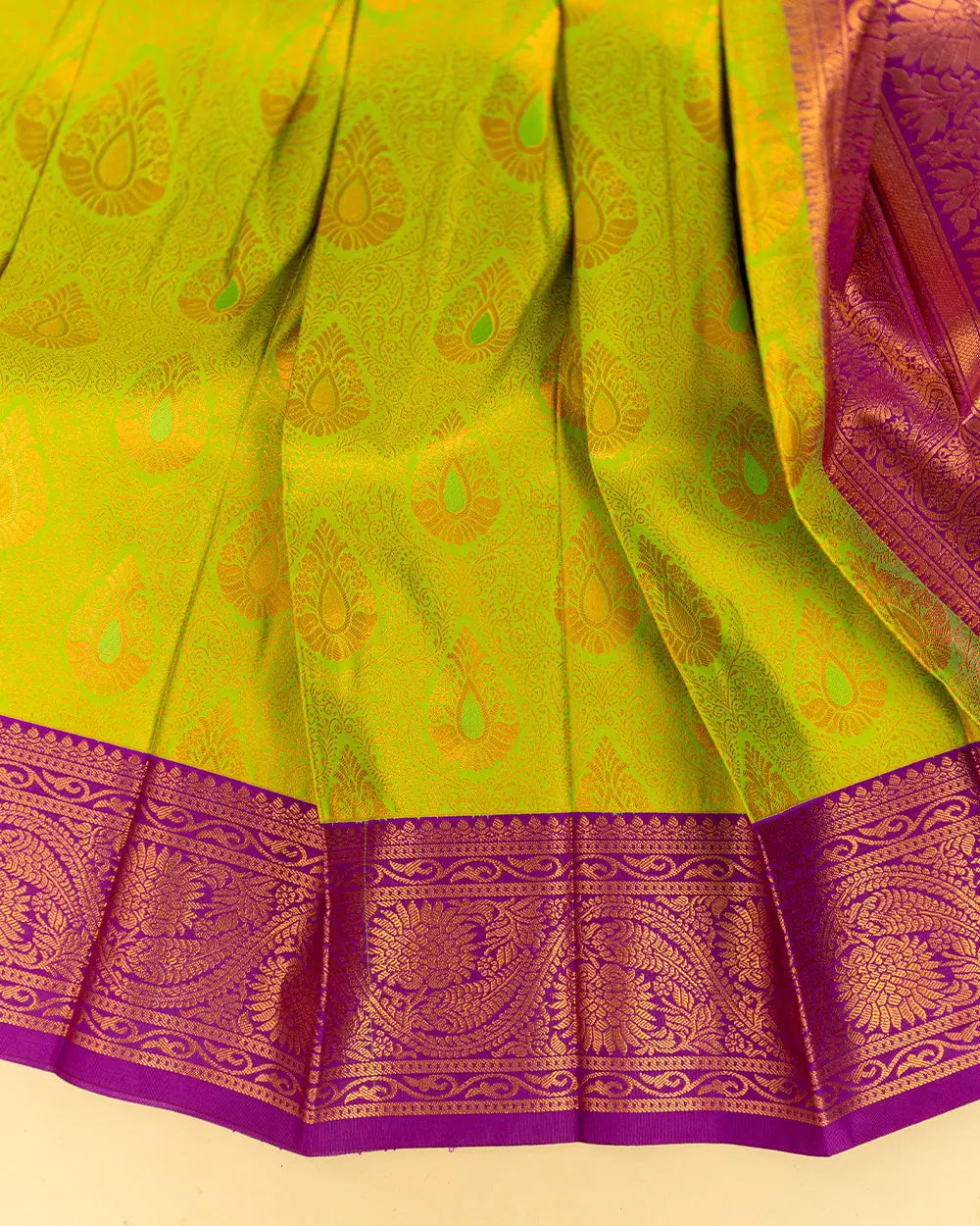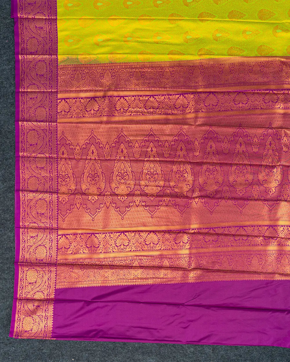 | Style | A classic silk saree elevated with fine zari butta artistry and a contrasting blouse, creating an elegant traditional ensemble. |