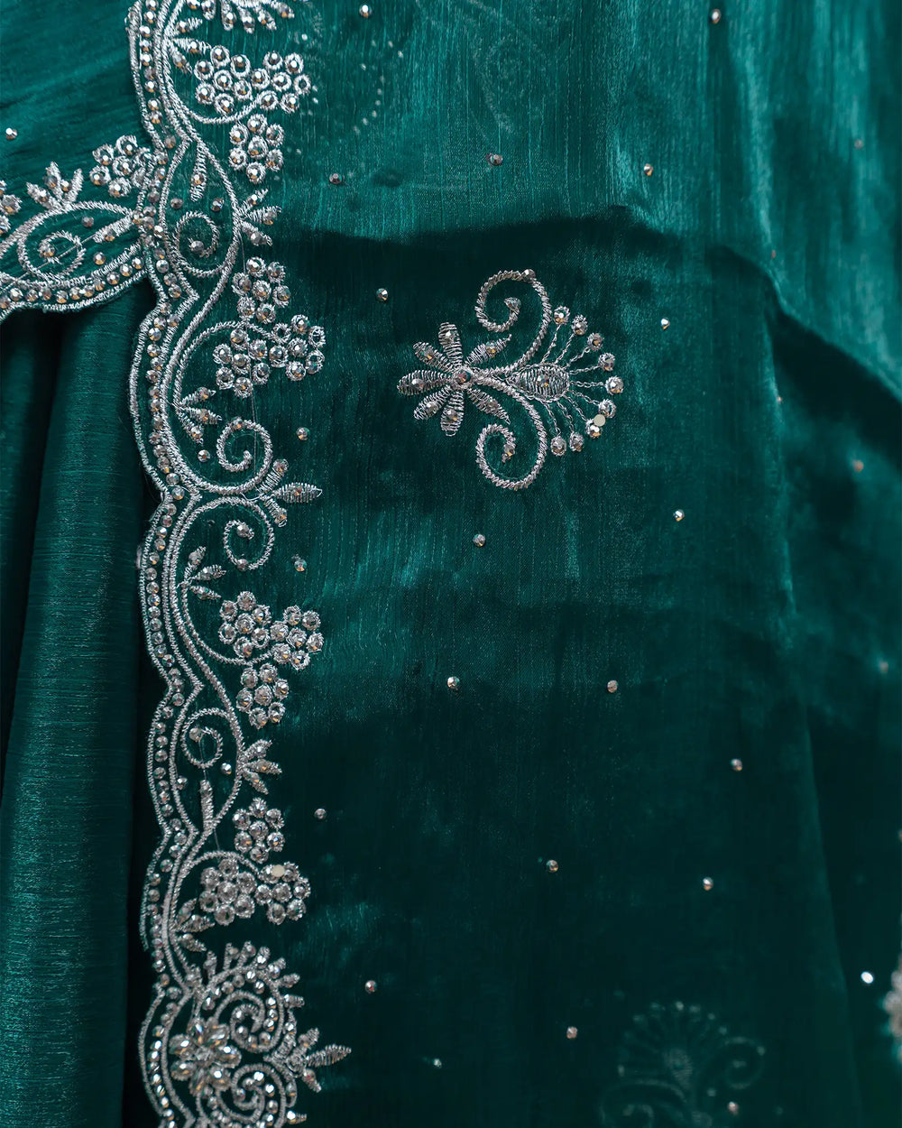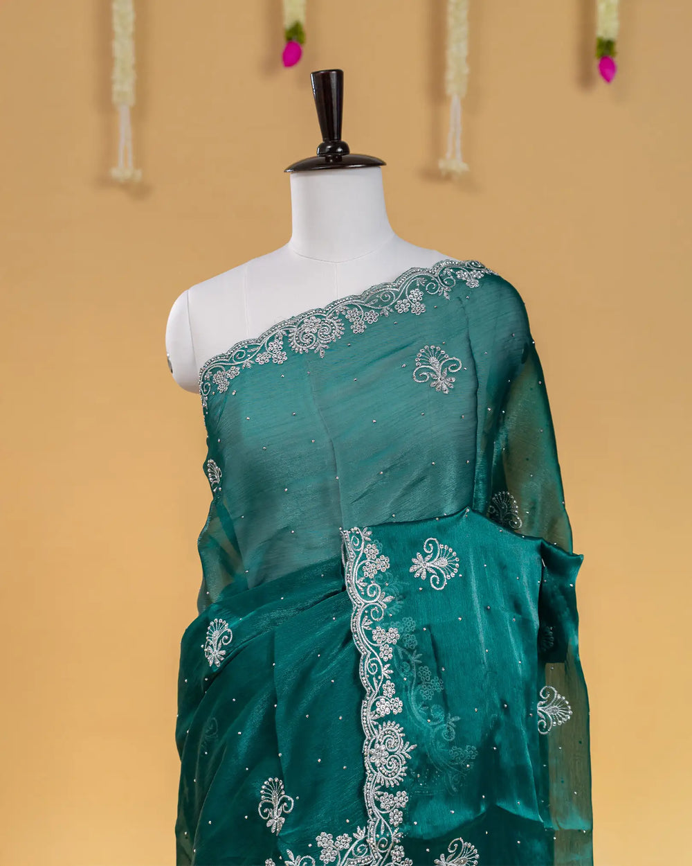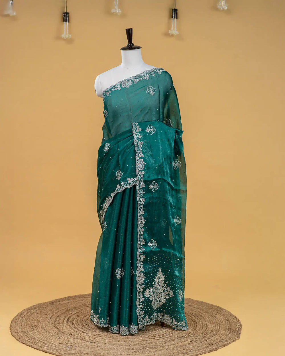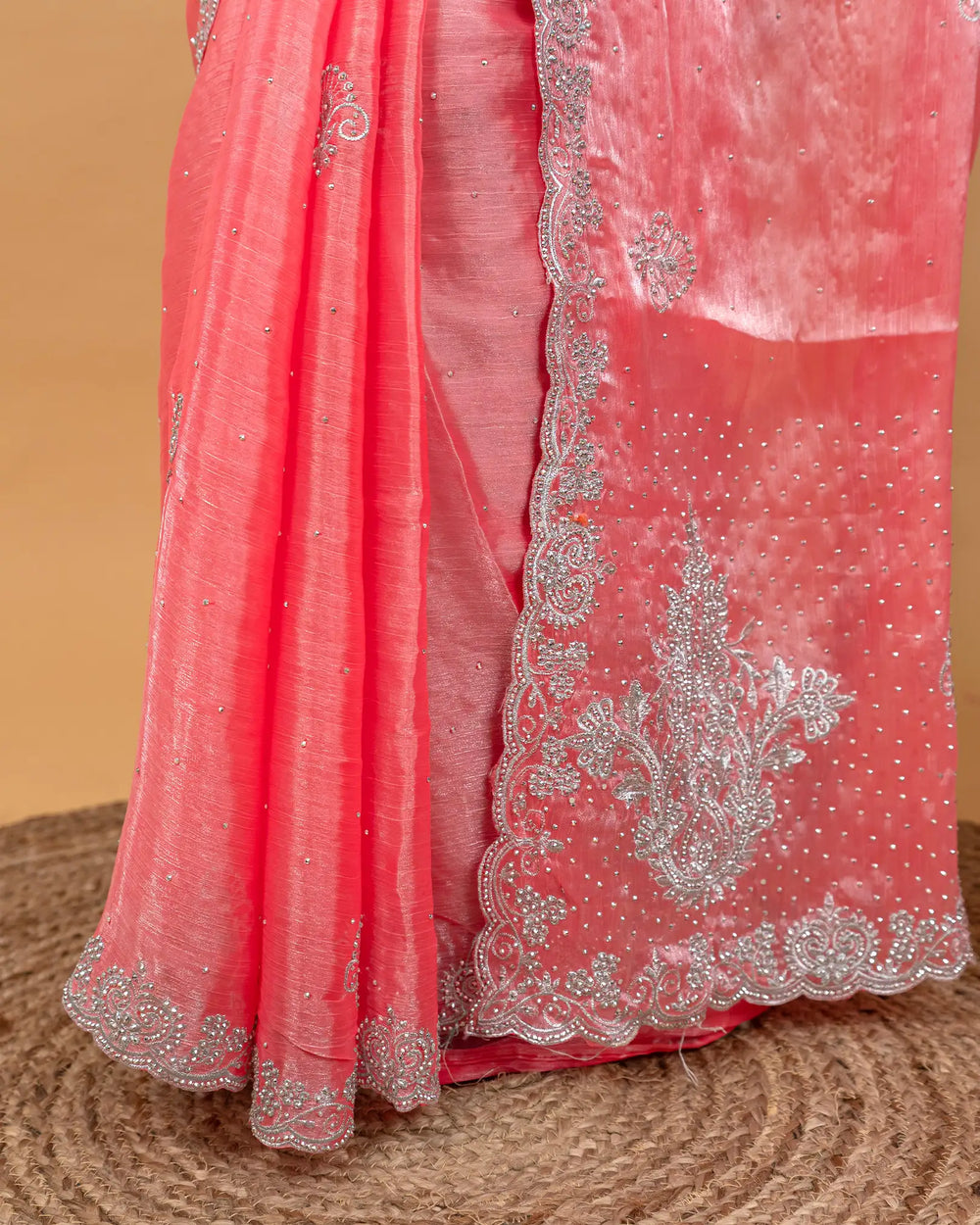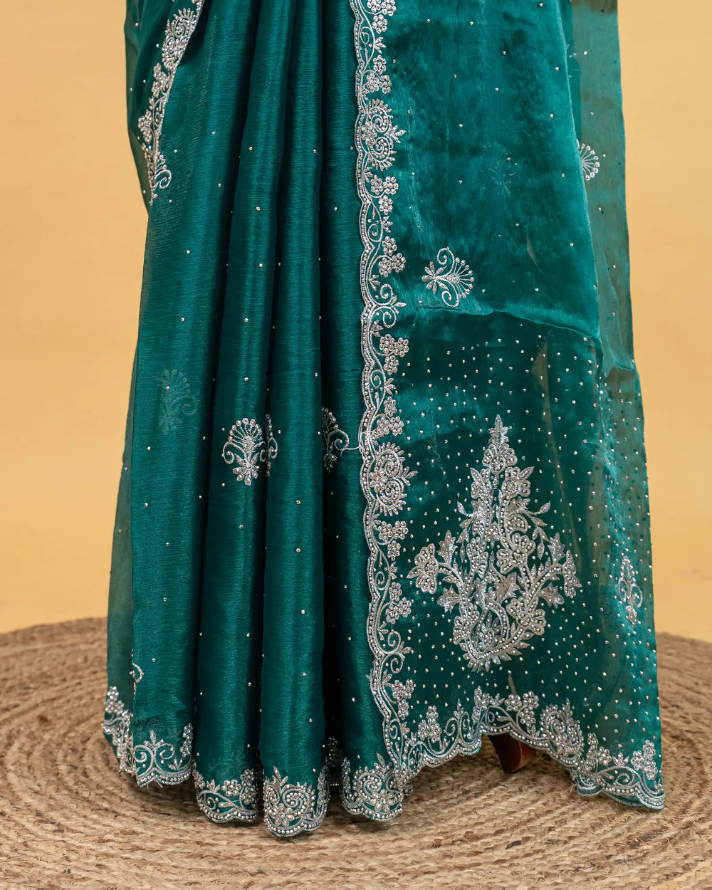 | Description | Elegant Fendy saree adorned with handmade stone detailing, perfect for festive and special occasions. |