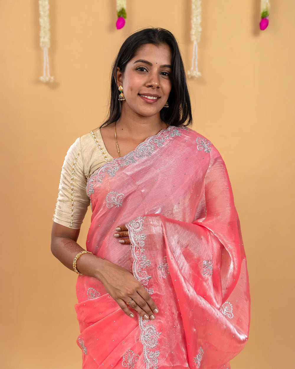 | Style | Saree accented with handmade stonework, complemented by running blouse with stone detailing on hands |