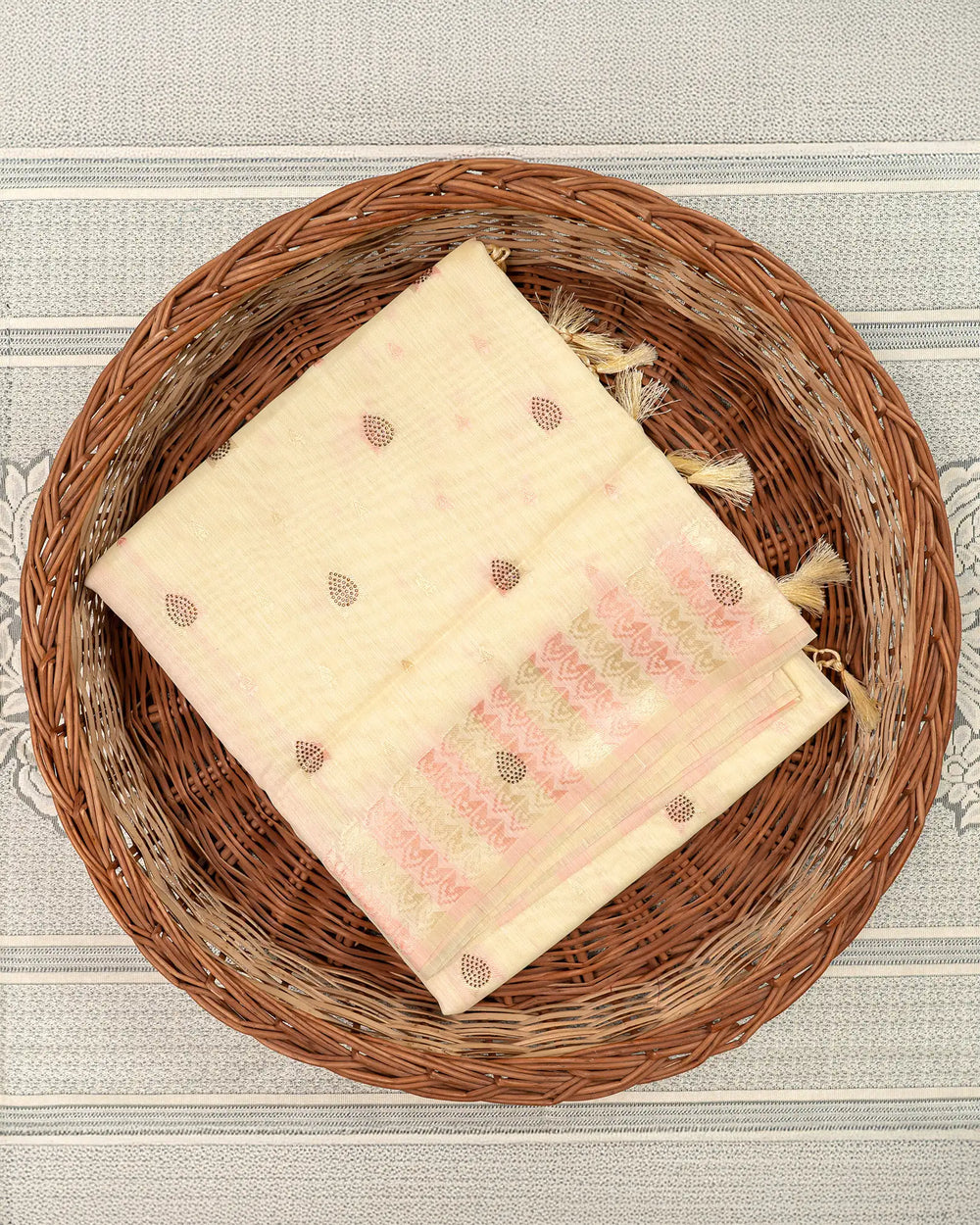 | Description | Elegant linen saree adorned with copper and silver butta work, highlighted with delicate stone accents for a refined festive appeal. |
