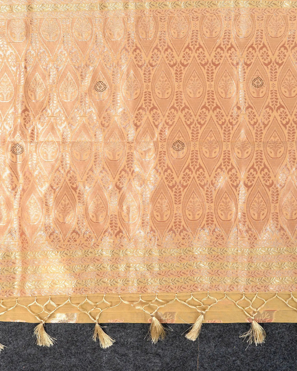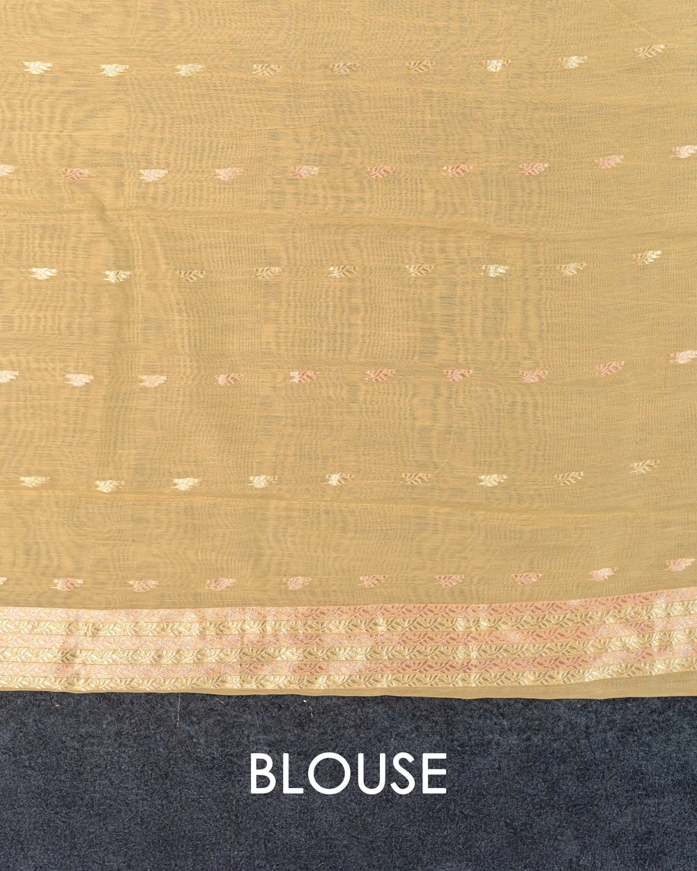 | Description | Elegant linen saree adorned with copper and silver butta work, highlighted with delicate stone accents for a refined festive appeal. |