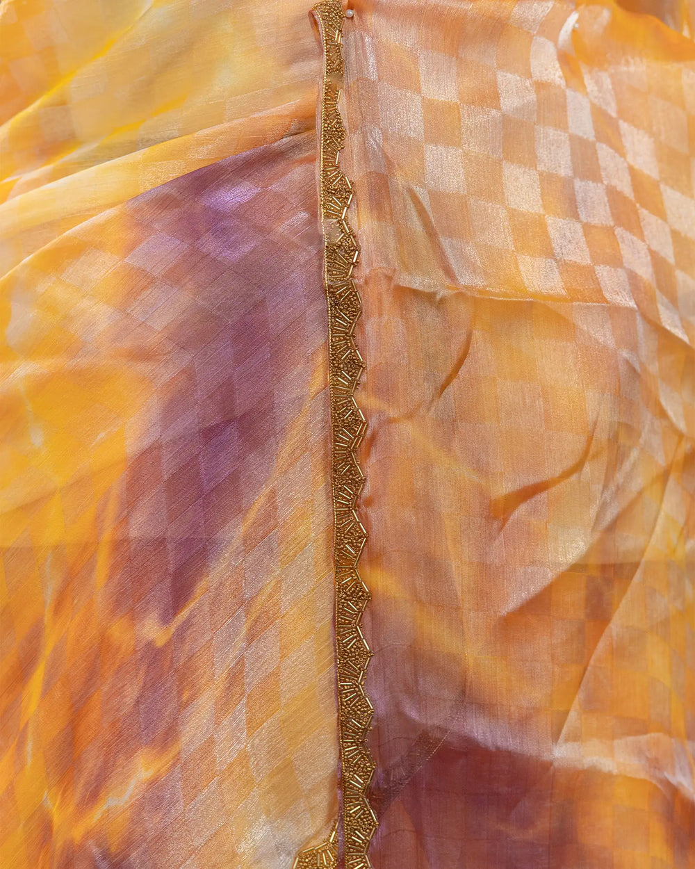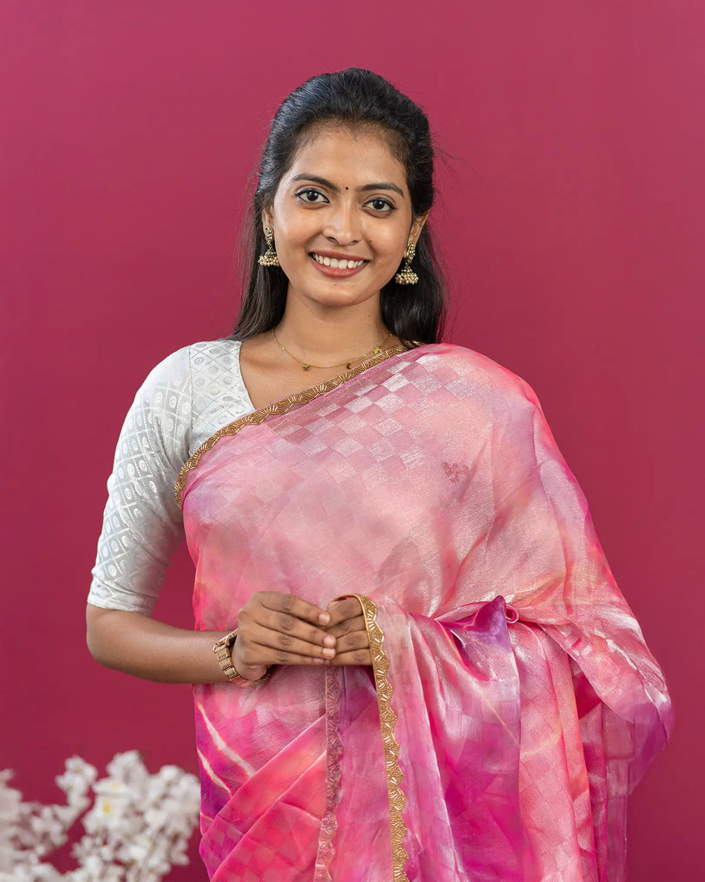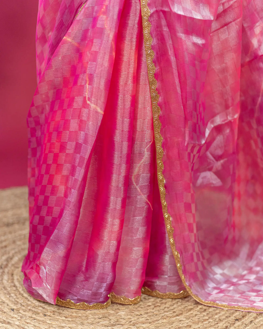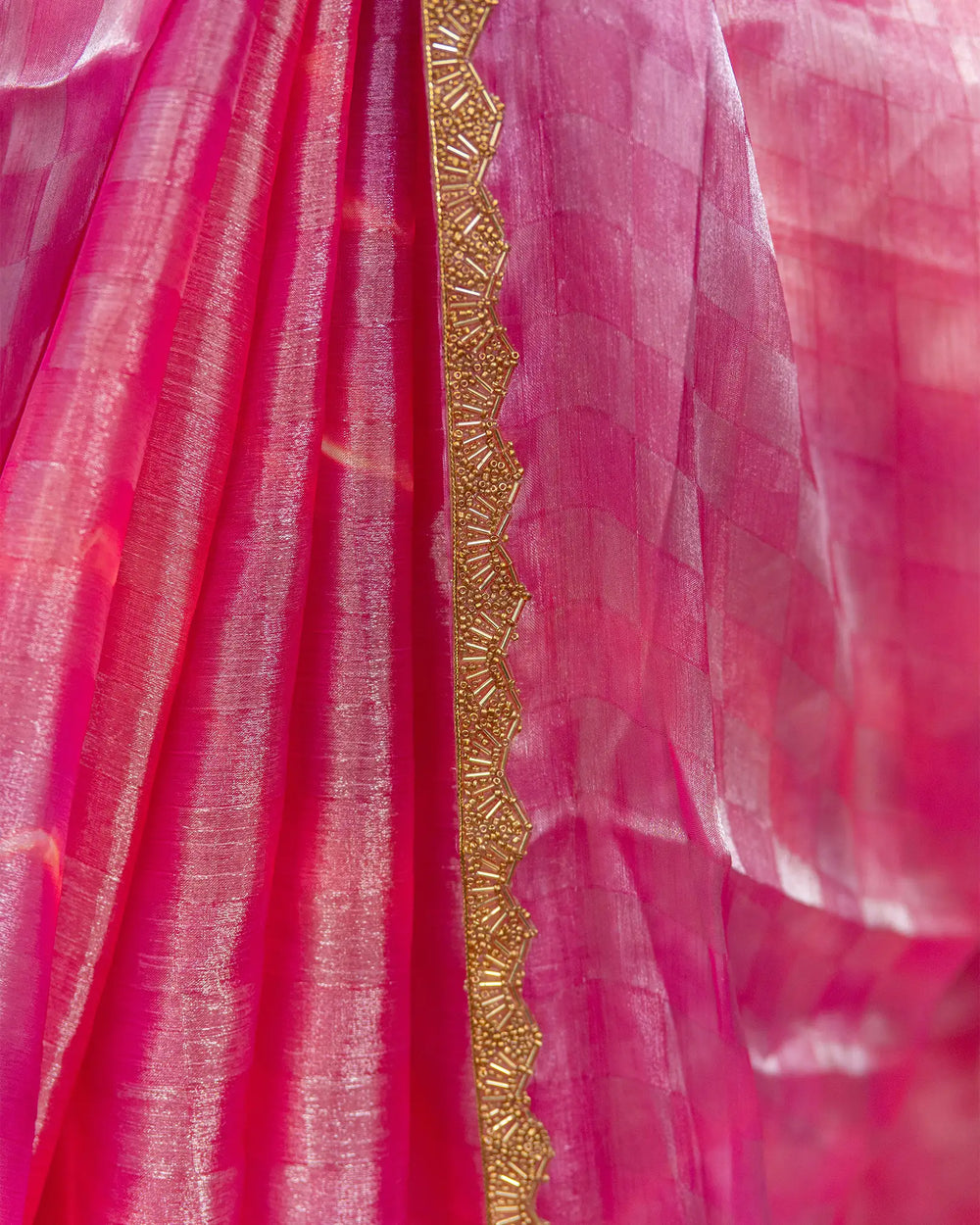 | Style | Elegant fendy embose saree highlighted with intricate Jarjoshi work for a rich, festive look. |